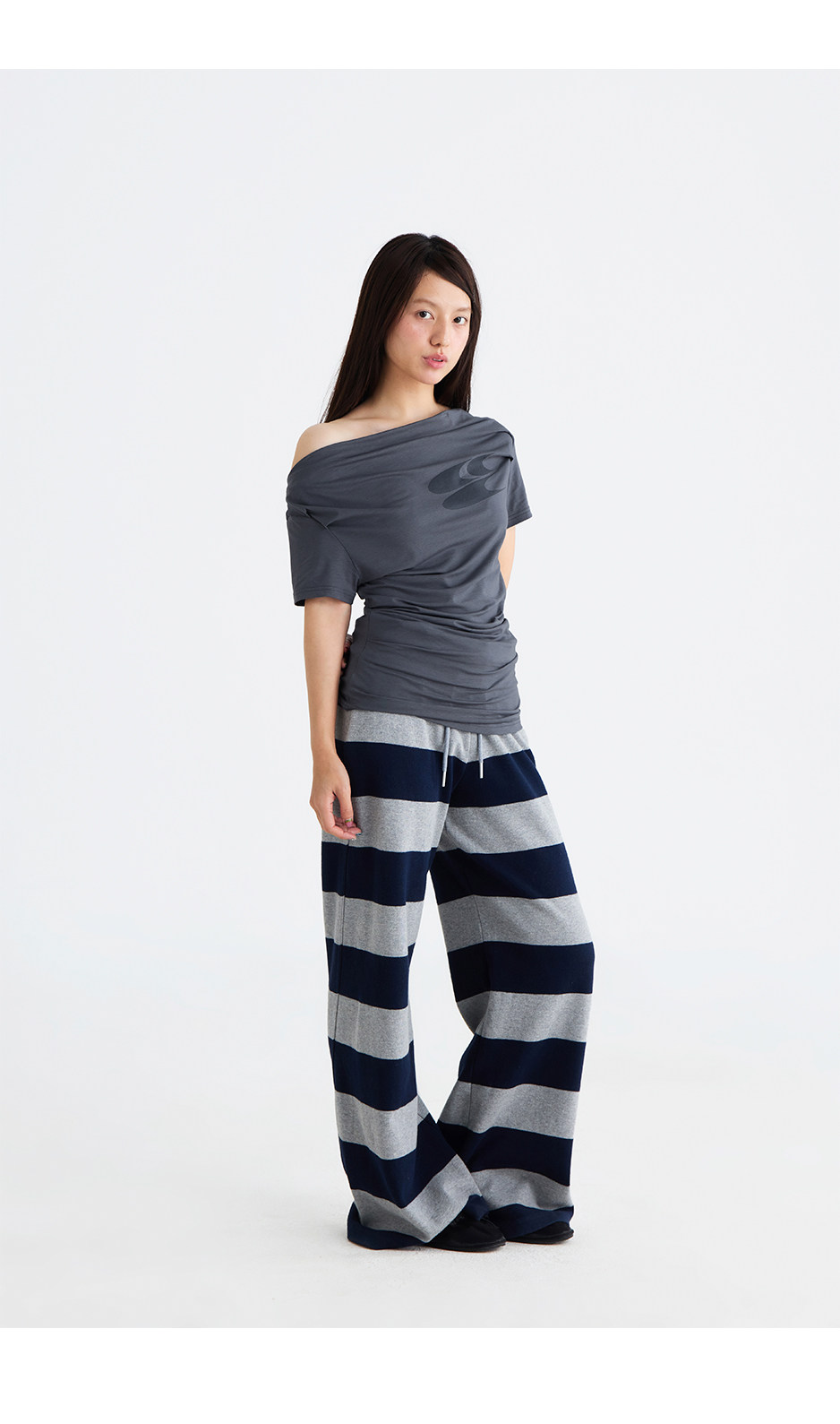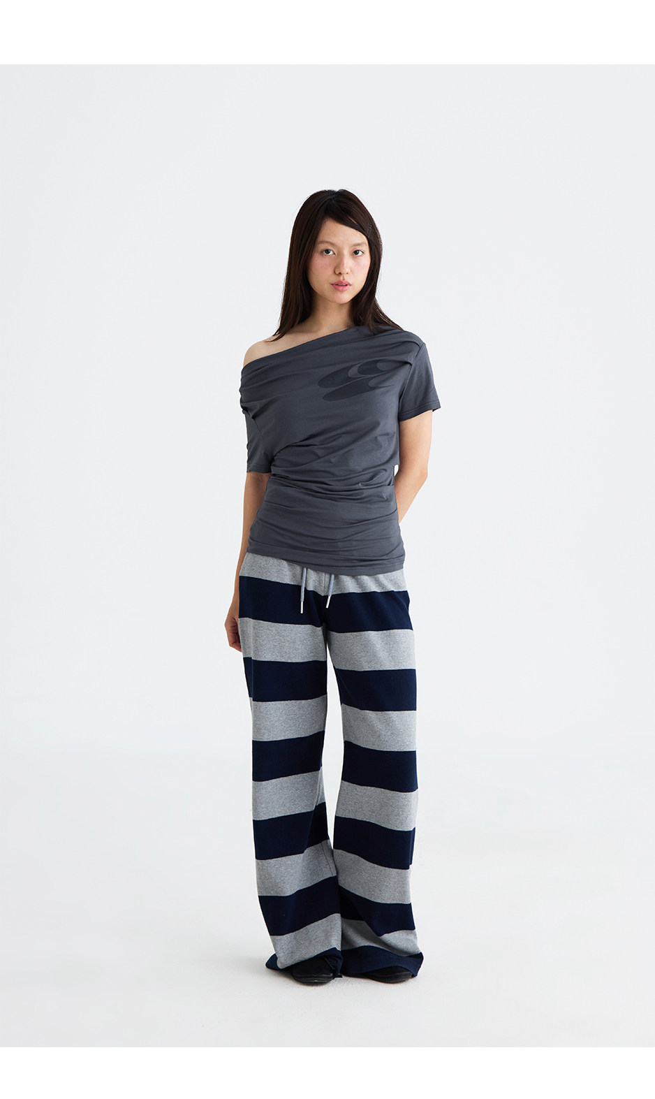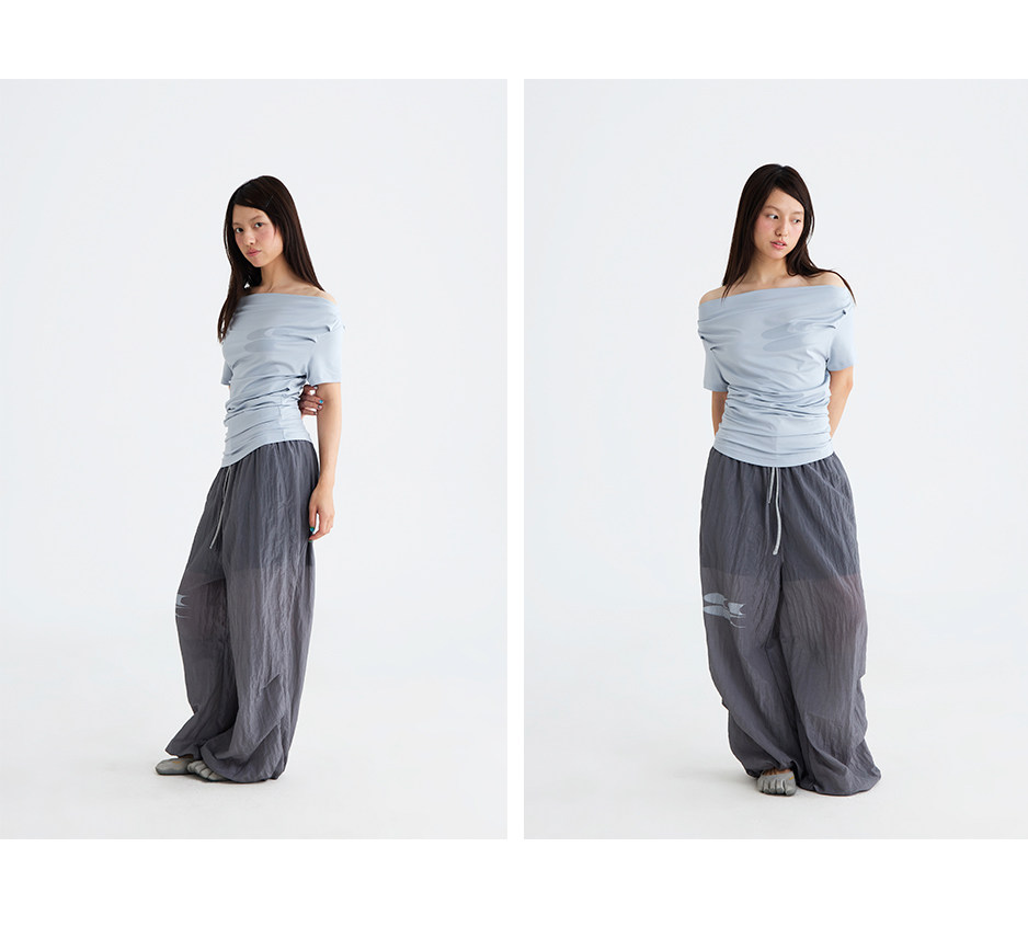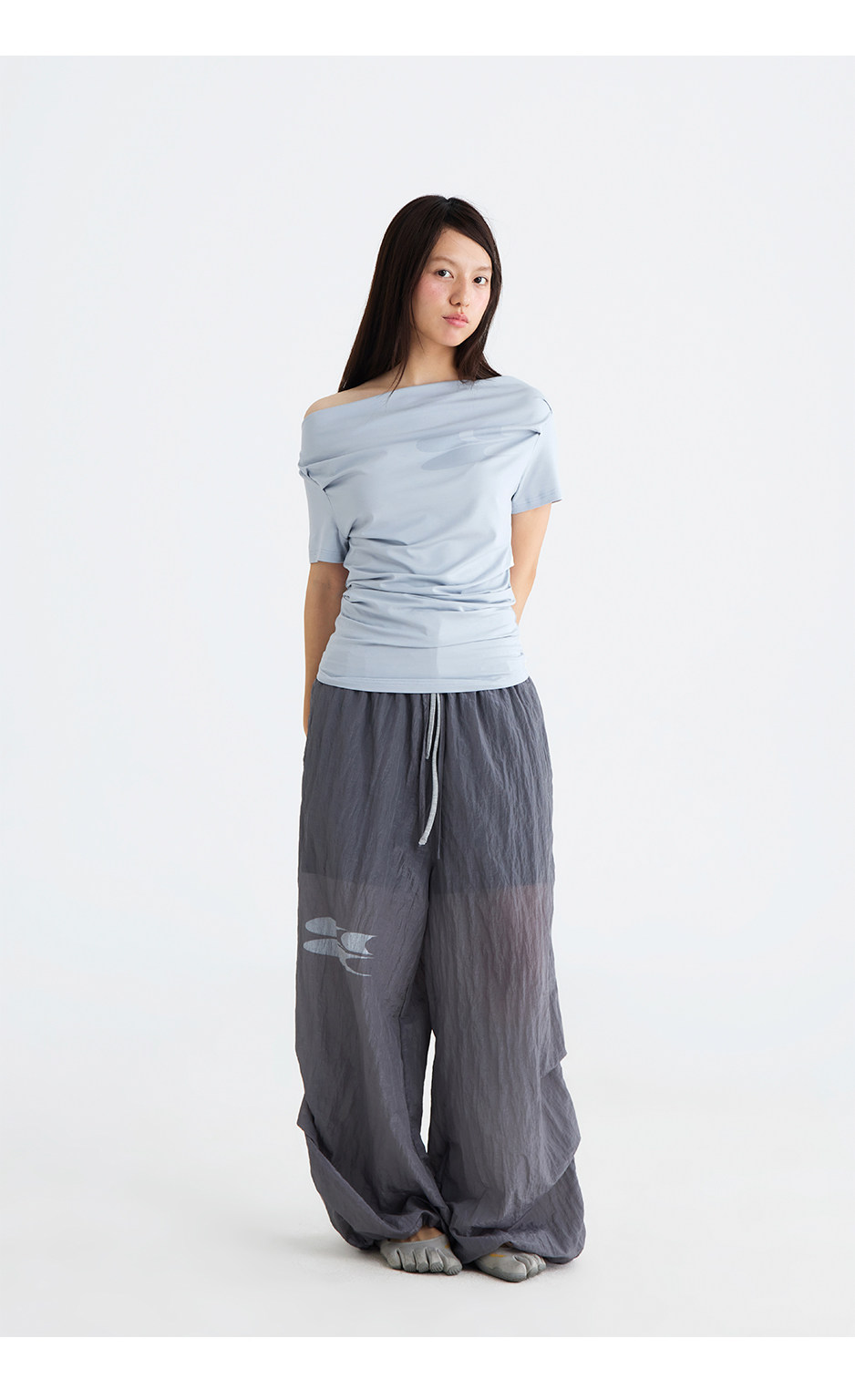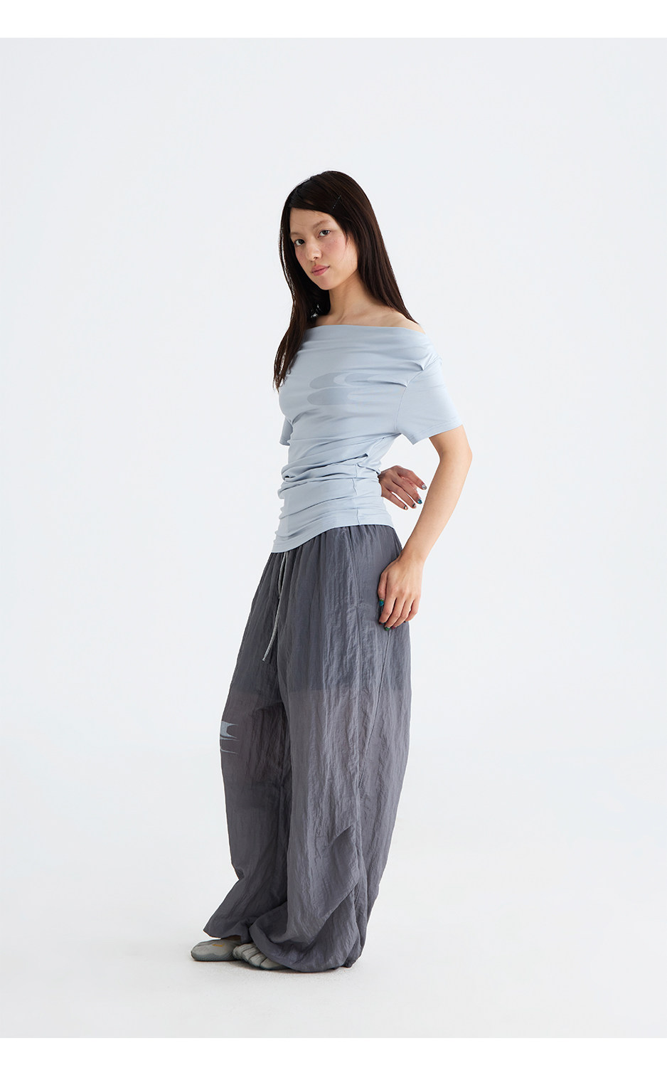 CryingCenter兰精莫代尔凉感斜肩一字肩领短袖露肩褶皱凉感上衣