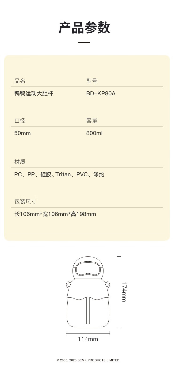 FACE×B.Duck运动乐园大肚杯户外运动杯(含杯带)BD-KP80A 800ml 日光黄