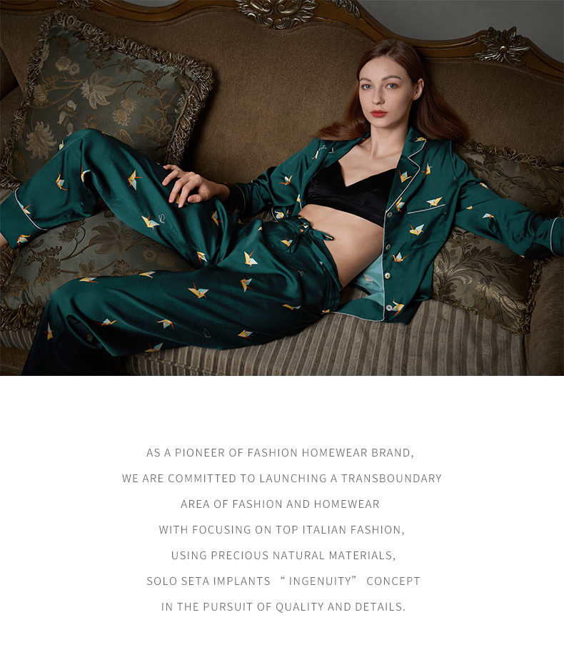 - soloseta专注于真丝织物,灵感源自意大利语,中文含义为“只做真丝”的意思。让睡衣变时尚,居家和外出瞬间切换,使其更具有出街,度假,参加宴会等功能。