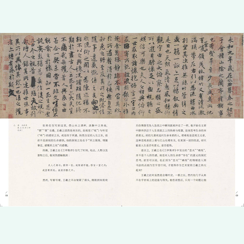 尽管每个人都或多或少地知道《兰亭序》,但是否真正了解“书圣”王羲之?《永和九年:赴一场兰亭之约》,就是为了让大家重新认识王羲之,让我们回到那个兵荒马乱的时代,去梳理他的家世,把握他的思想,理解他的境遇,感受他的风流洒脱。然后才明白为什么《兰亭集序》和《祭侄稿》《寒食帖》被称为“三大行书”,并居于首位。因为在《 兰亭集序》的背后,是一个有血有肉、有真性情的作者。《从兰亭集序》的点画中间,看见王羲之身上那种只有魏晋人才有的乖张、怪诞,风华绝代的洒脱;以及他对于生命、死亡和生活中的痛苦有着超乎寻常的敏锐感知,王羲之可以说是中国书法史上第一个在笔下表达出复杂境遇与情绪的人。这些主题,要到1600年后出现的存在主义,才有所呼应。就像没有欧阳修就没有滁州的醉翁亭一样,古人也曾经说 :若无王羲之,兰亭也早已芜没于空山荒野之中了。 可以说,《兰亭集序》是一件伟大的艺术品,也是一篇值得深入分析的思想深邃的文章。将近 1700 年过去了,在《兰亭集序》共 324 个字的点画笔触中——虽然这并不是王羲之的真迹,但仍然不妨碍我们透过这些文字与点画,去领悟以王羲之为代表的这一群高士文人的魏晋风度与宇宙人生的感悟。