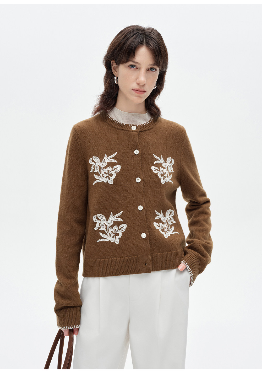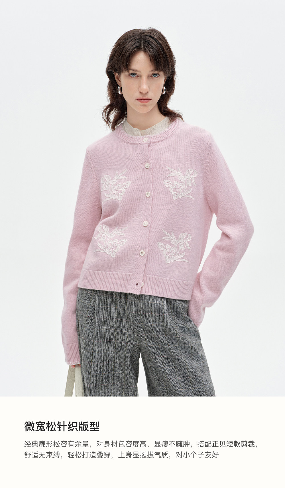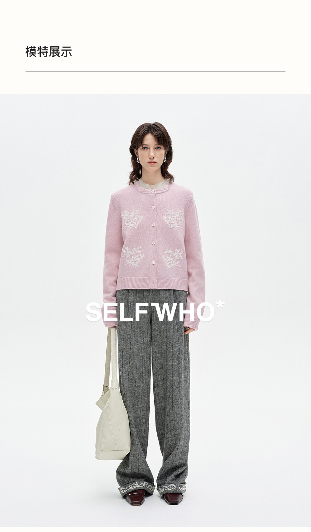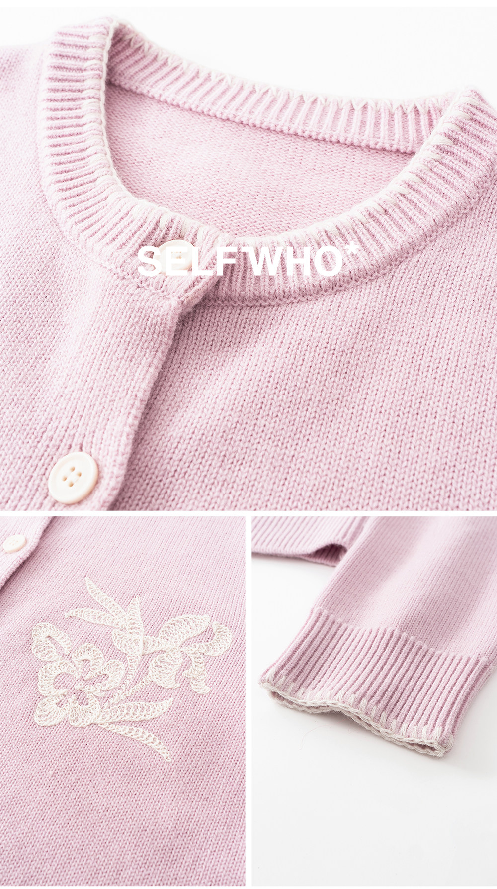 SELFWHO100%进口绵羊毛刺绣花纹针织开衫女2026春季新款圆领毛衣