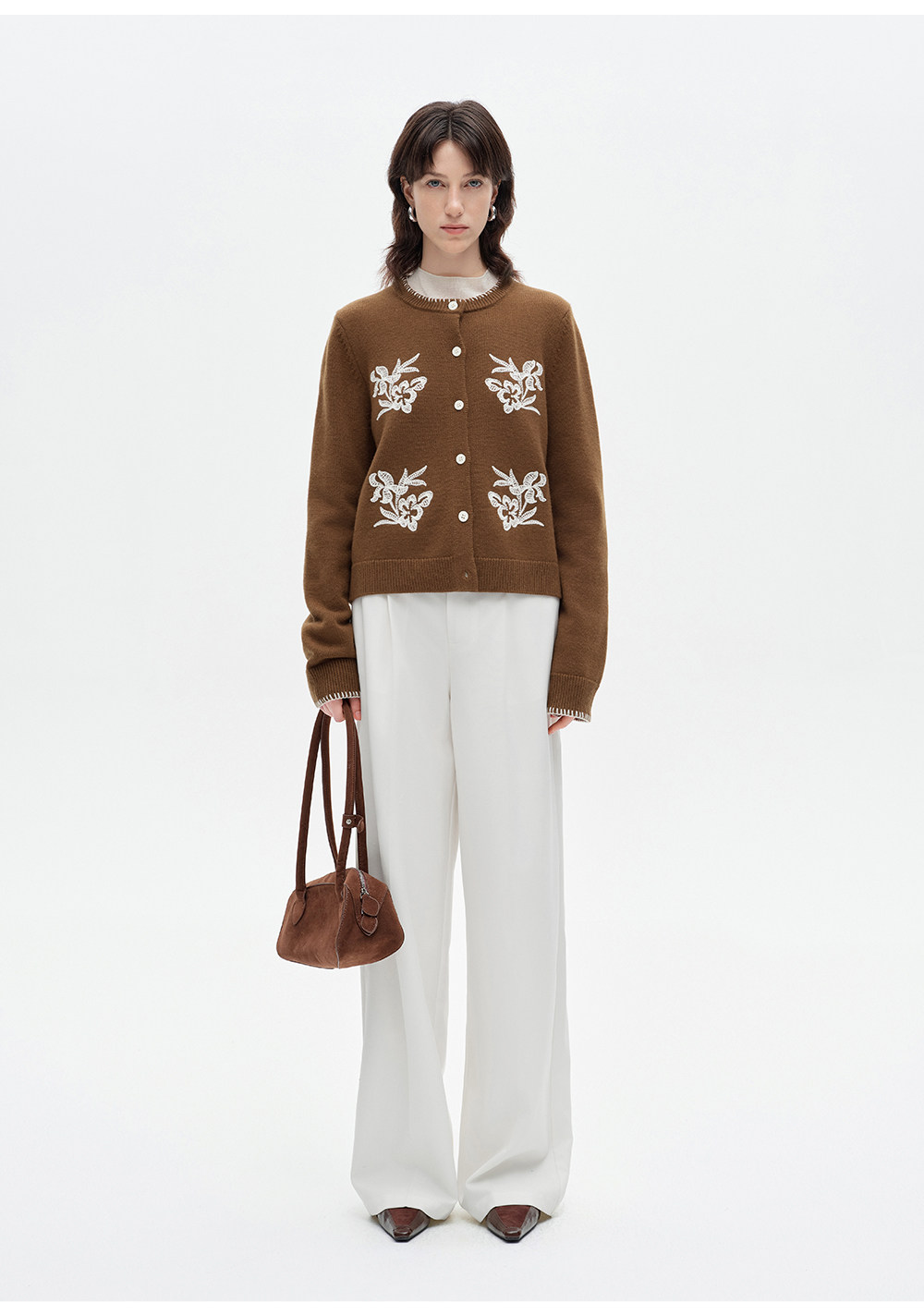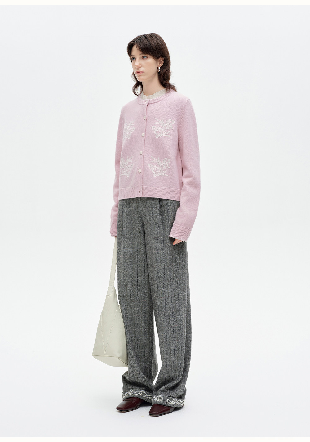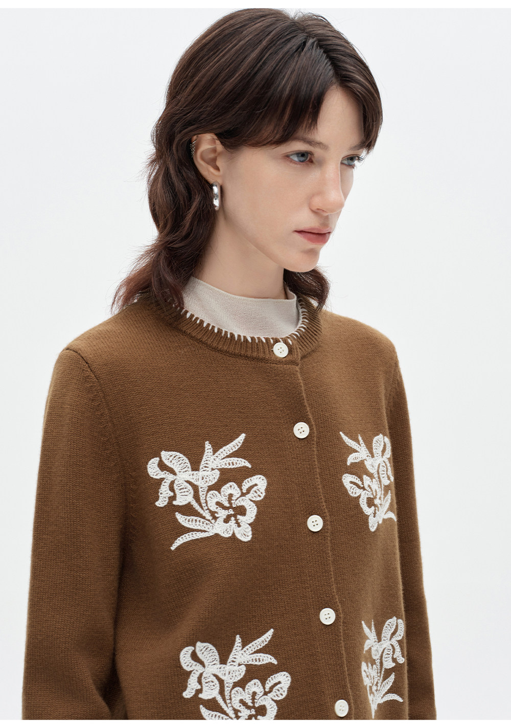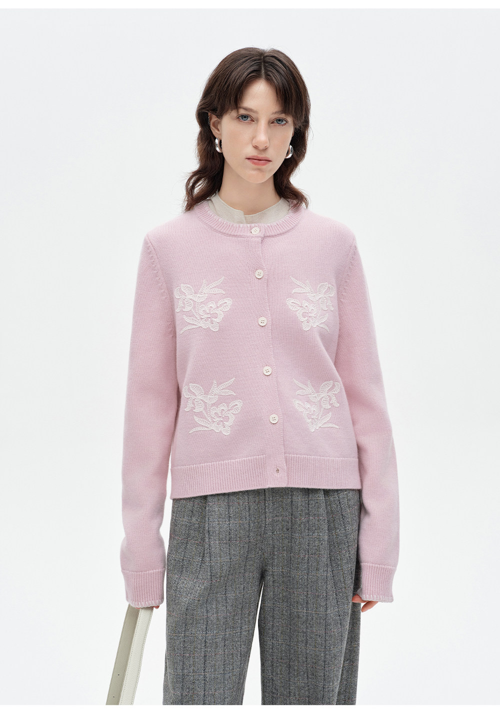 SELFWHO100%进口绵羊毛刺绣花纹针织开衫女2026春季新款圆领毛衣