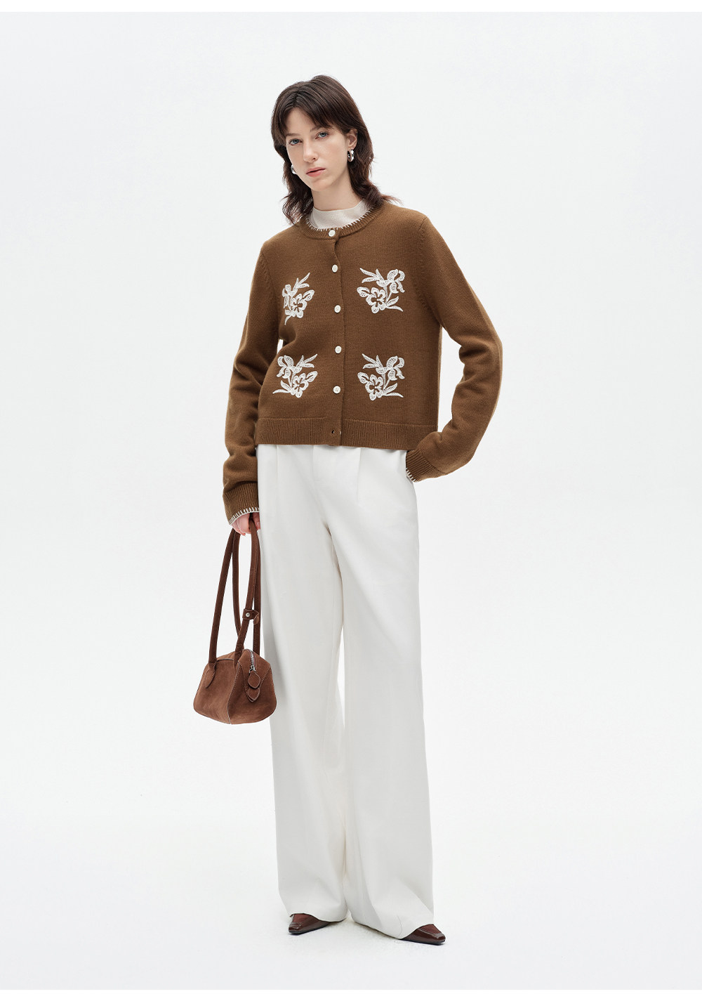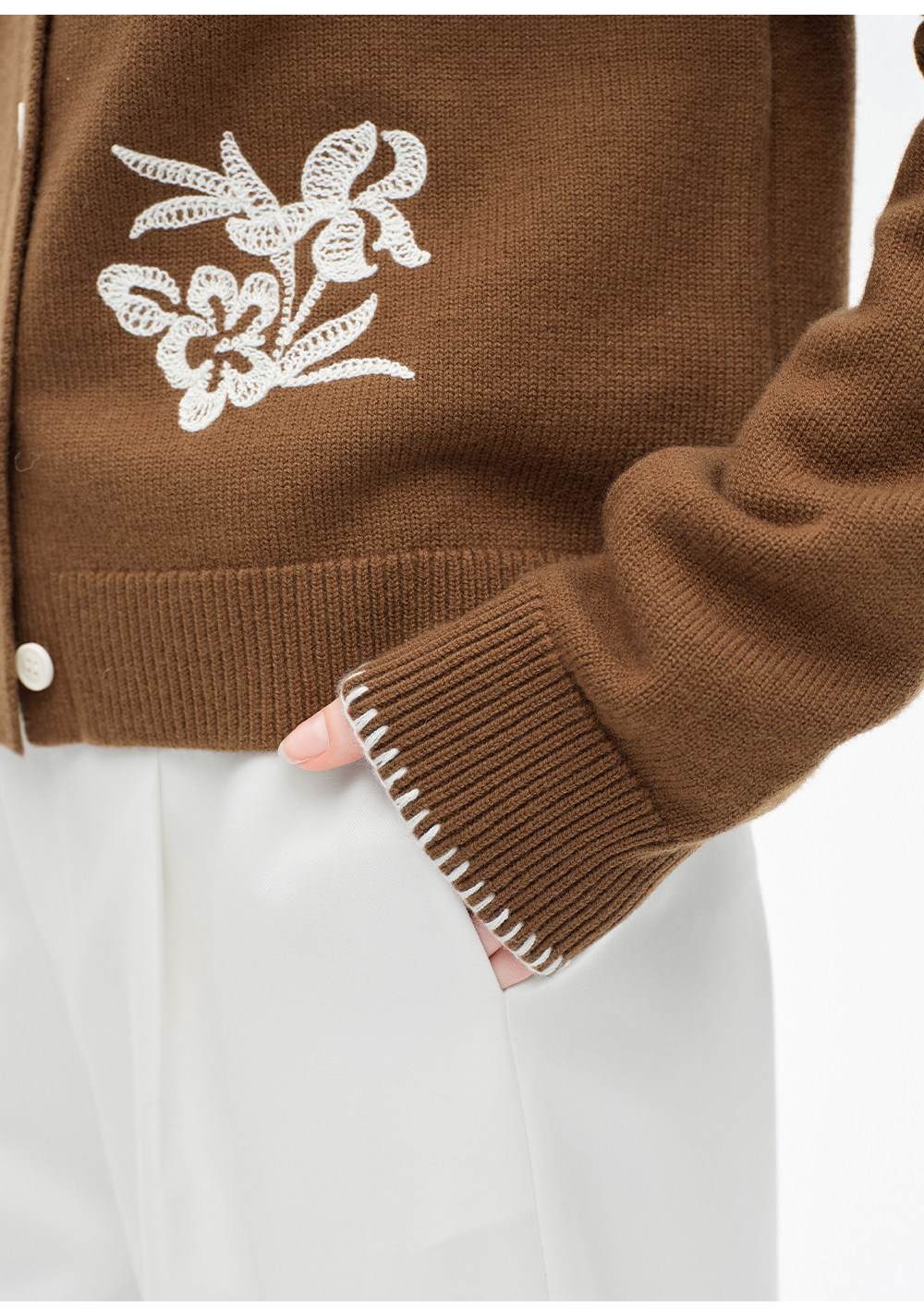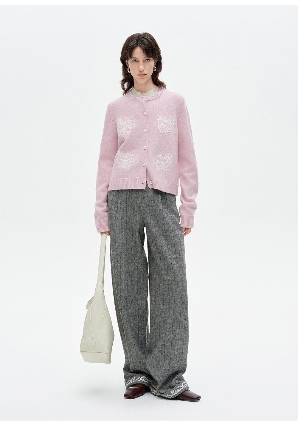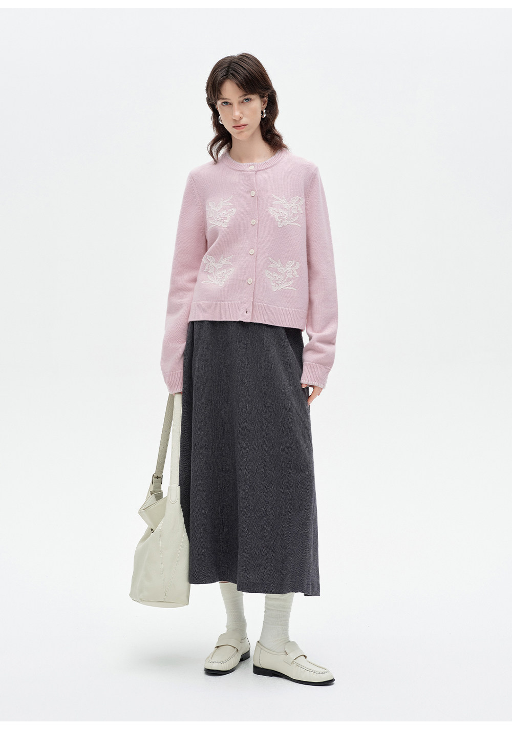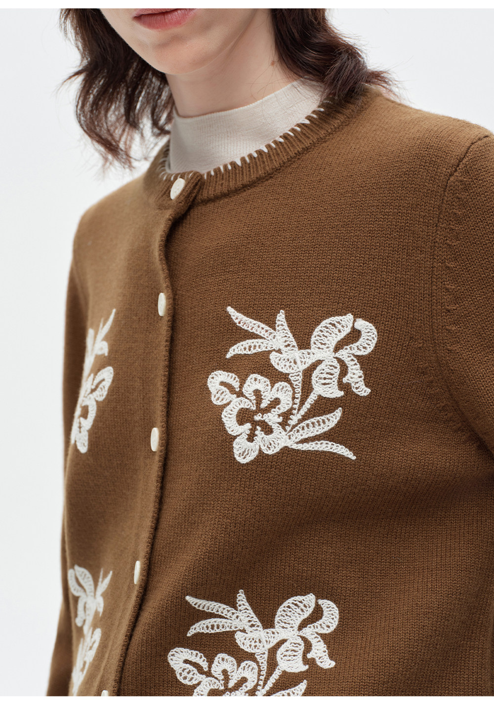SELFWHO100%进口绵羊毛刺绣花纹针织开衫女2026春季新款圆领毛衣