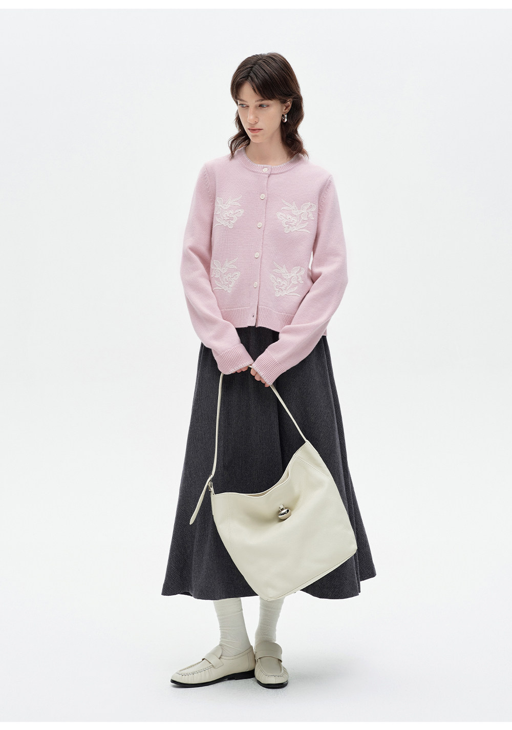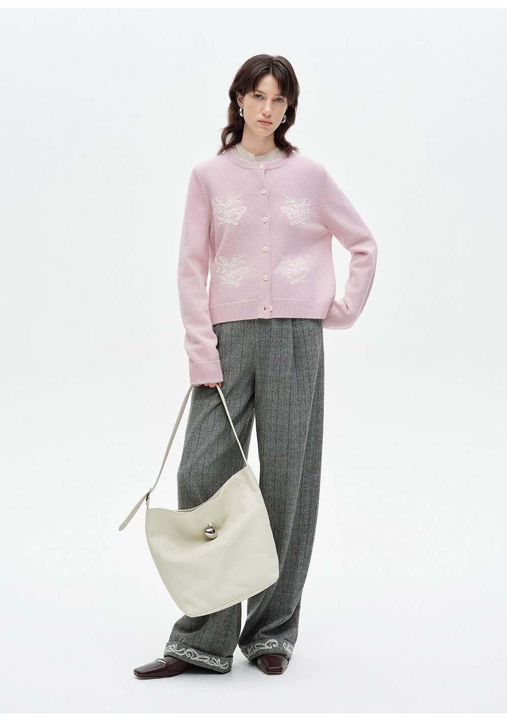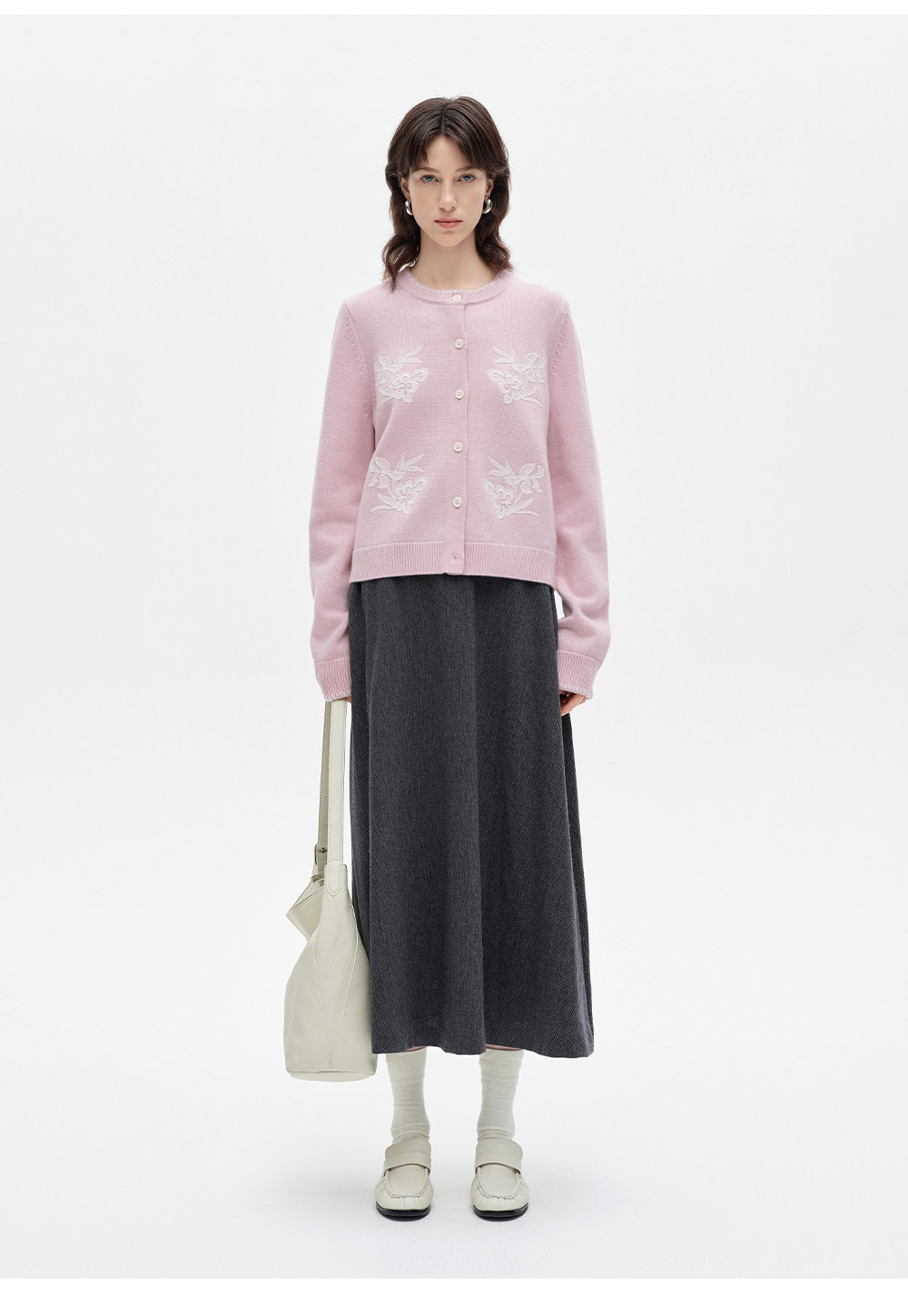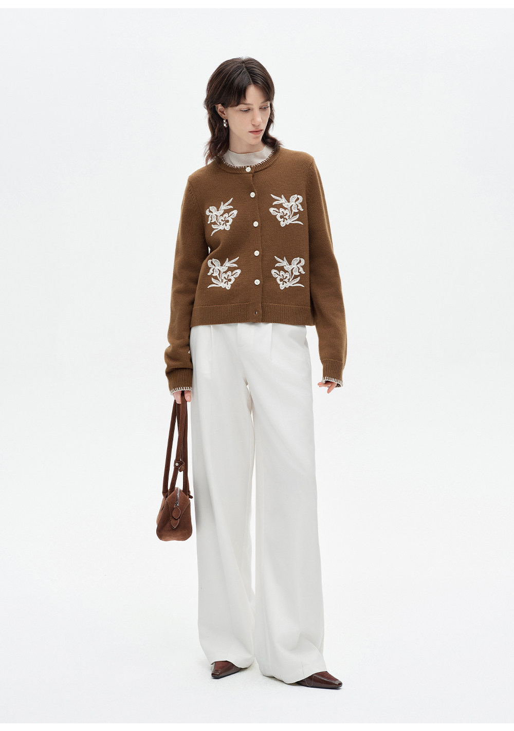 SELFWHO100%进口绵羊毛刺绣花纹针织开衫女2026春季新款圆领毛衣