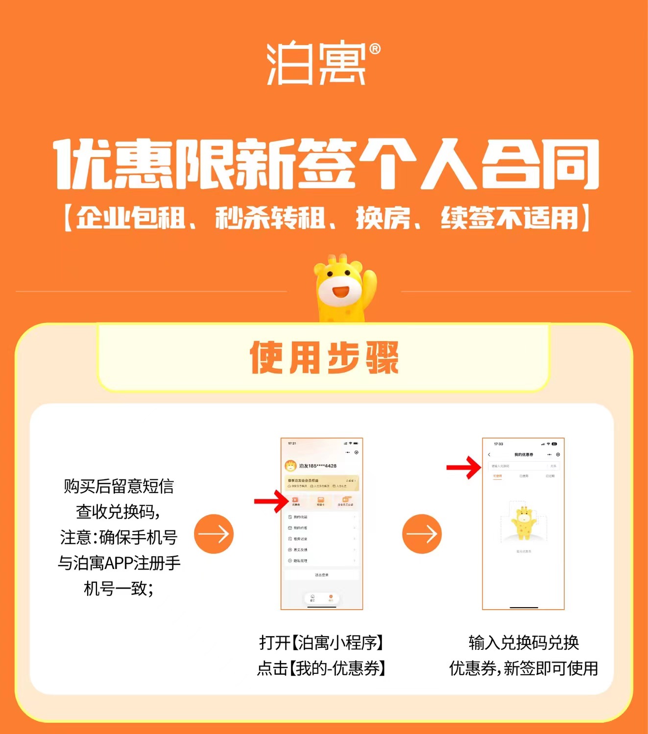 *付款后24小时内发货,下单后请留意预留的手机号短信,收到短信后复制兑换码,前往泊寓APP/小程序兑换,符合使用条件方可成功兑换,如不符合兑换条件7天后退款。