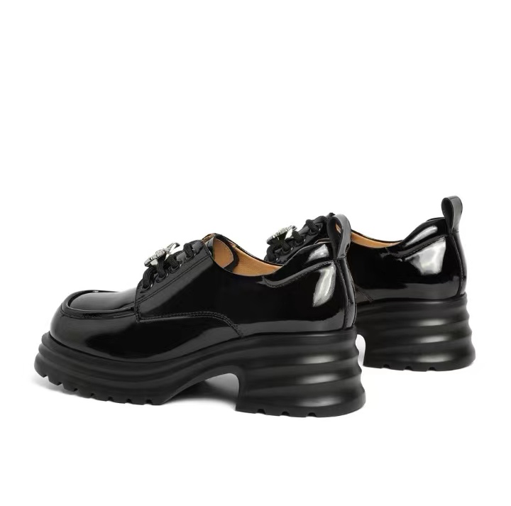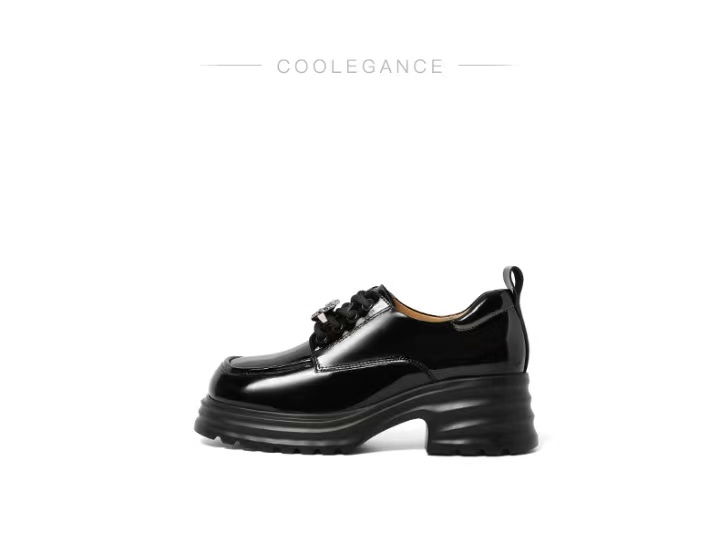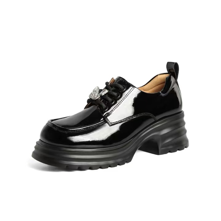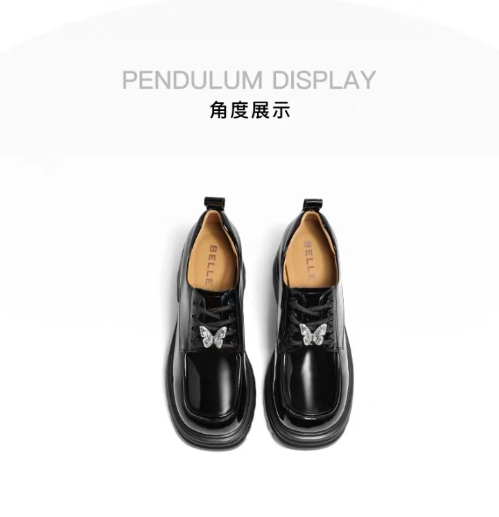 BELLE百丽2024春系带超轻厚底黑色亮漆牛皮水钻蝴蝶乐福女鞋