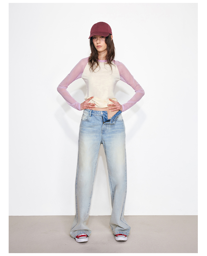 NUTH清爽水洗浅蓝色复古做旧直筒牛仔裤女