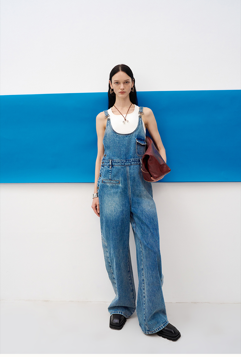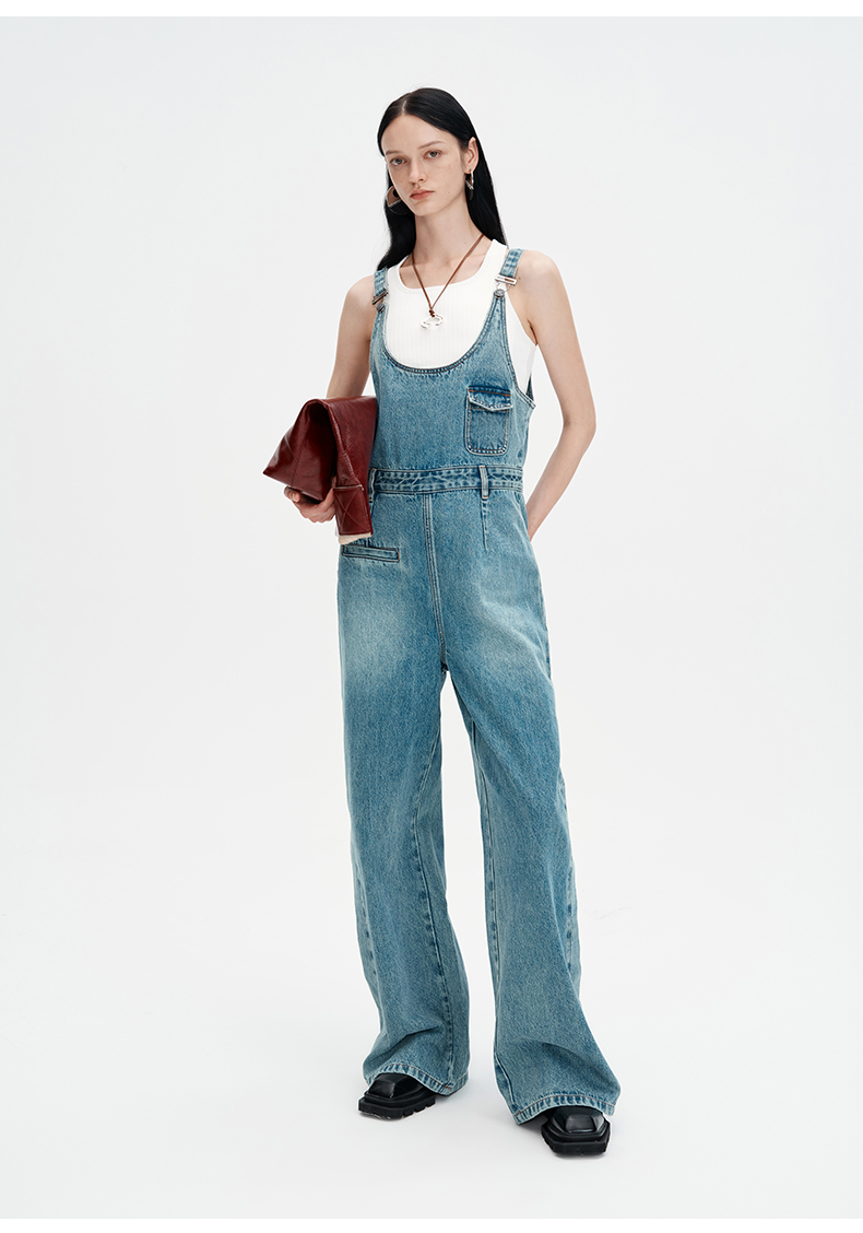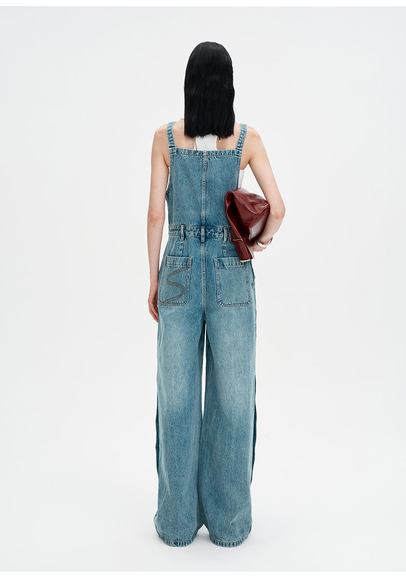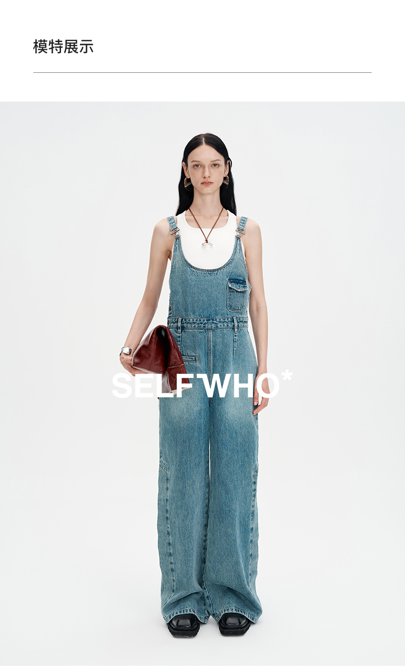 SELFWHO浮影牛仔系列复古纯棉背带牛仔连体裤女2024秋新款连衣裤