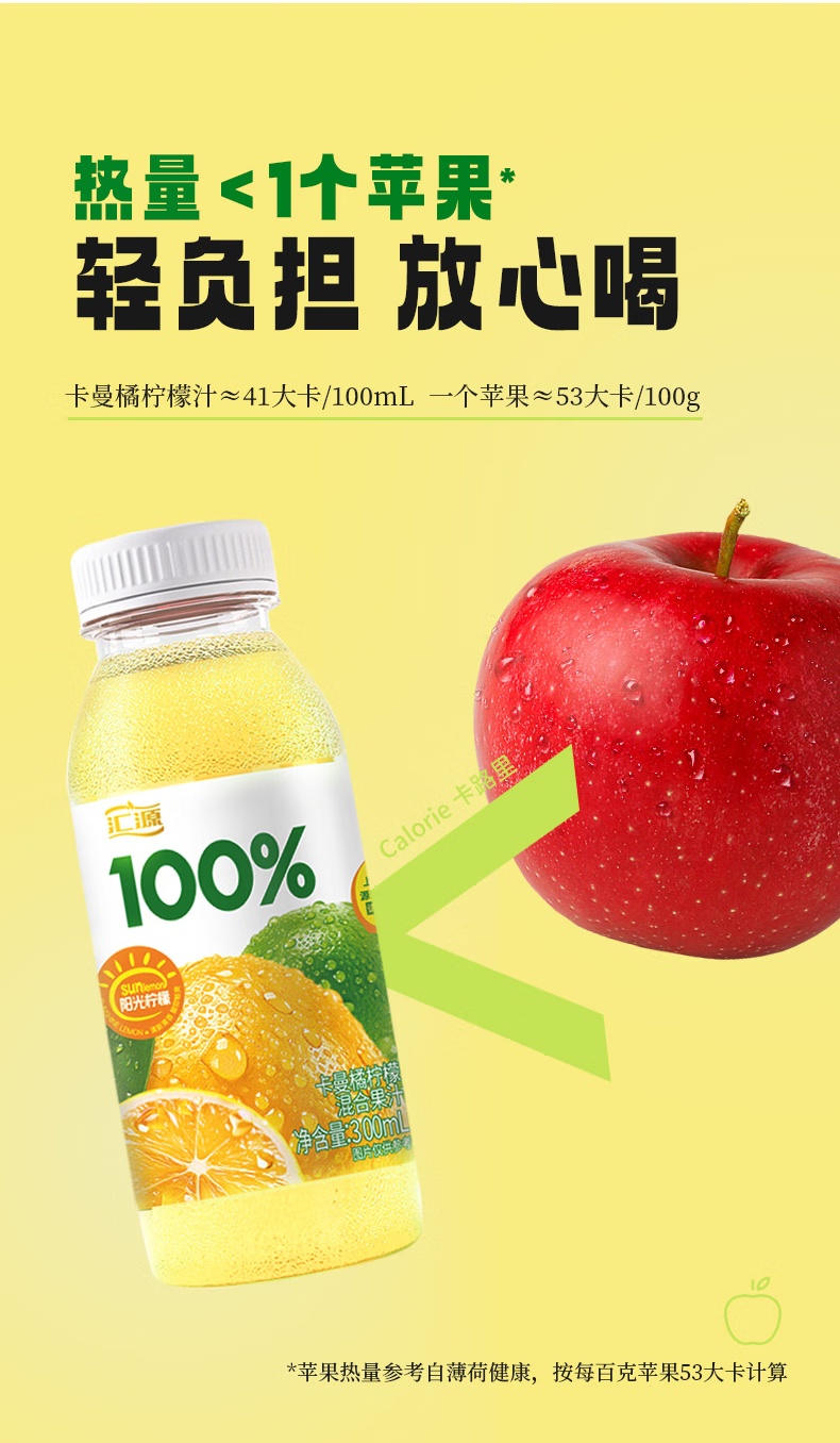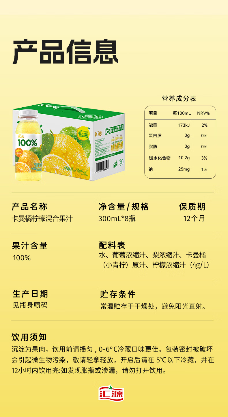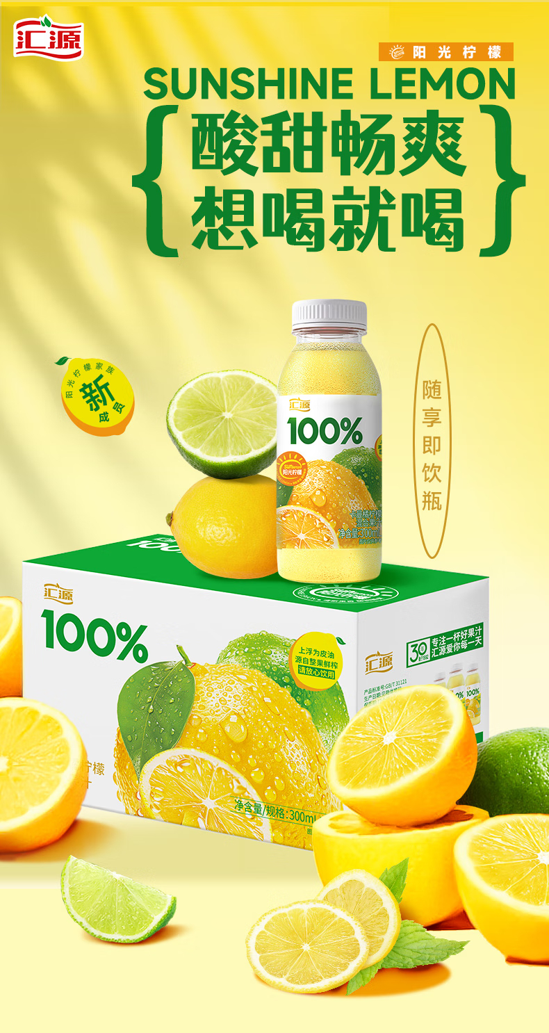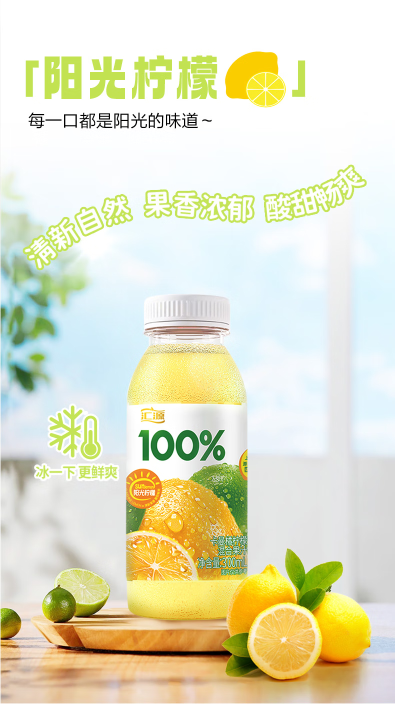 汇源100%阳光柠檬混合果汁300ml*8瓶