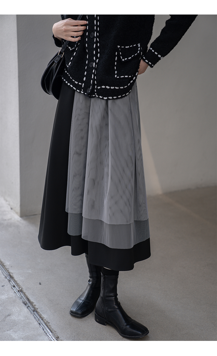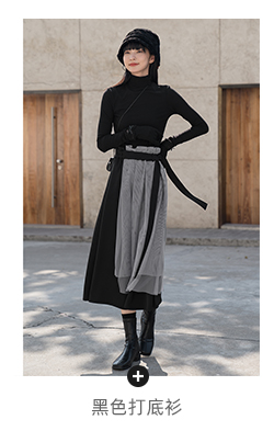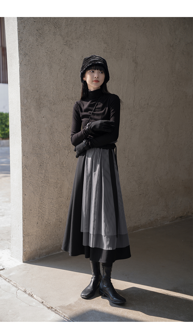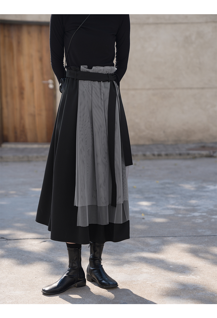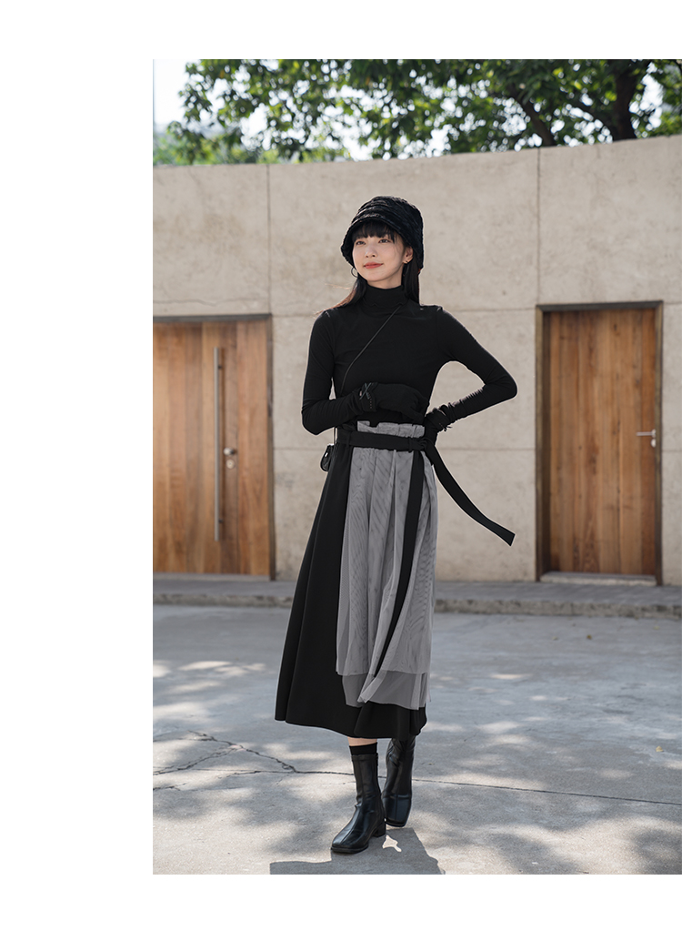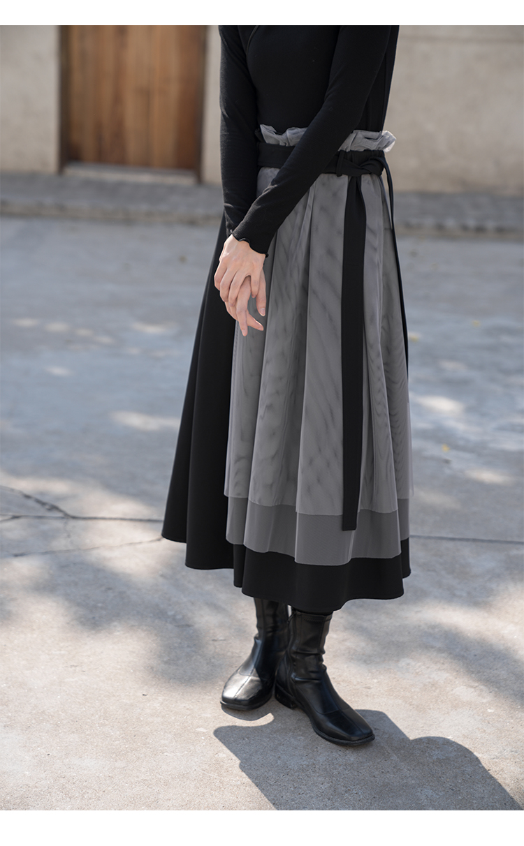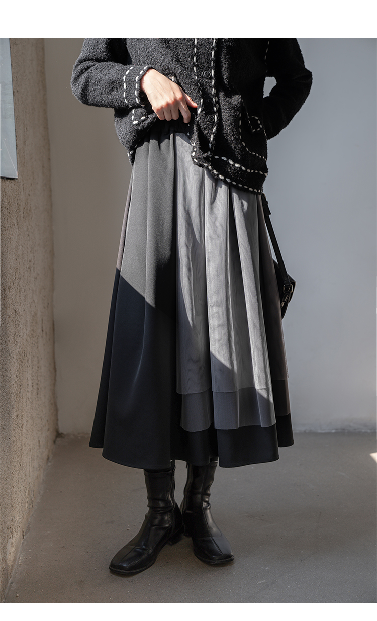 【6折秒杀】鹿向南 黑色半身裙女秋2025秋冬新款拼接设计感百褶长裙中长款裙LXN13902