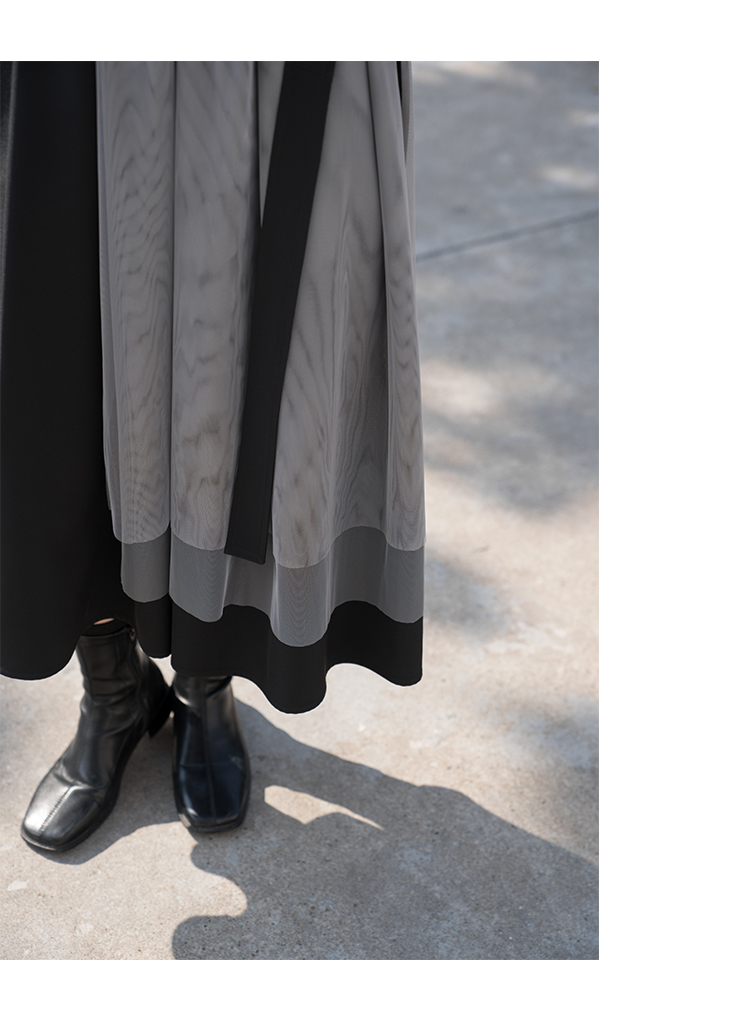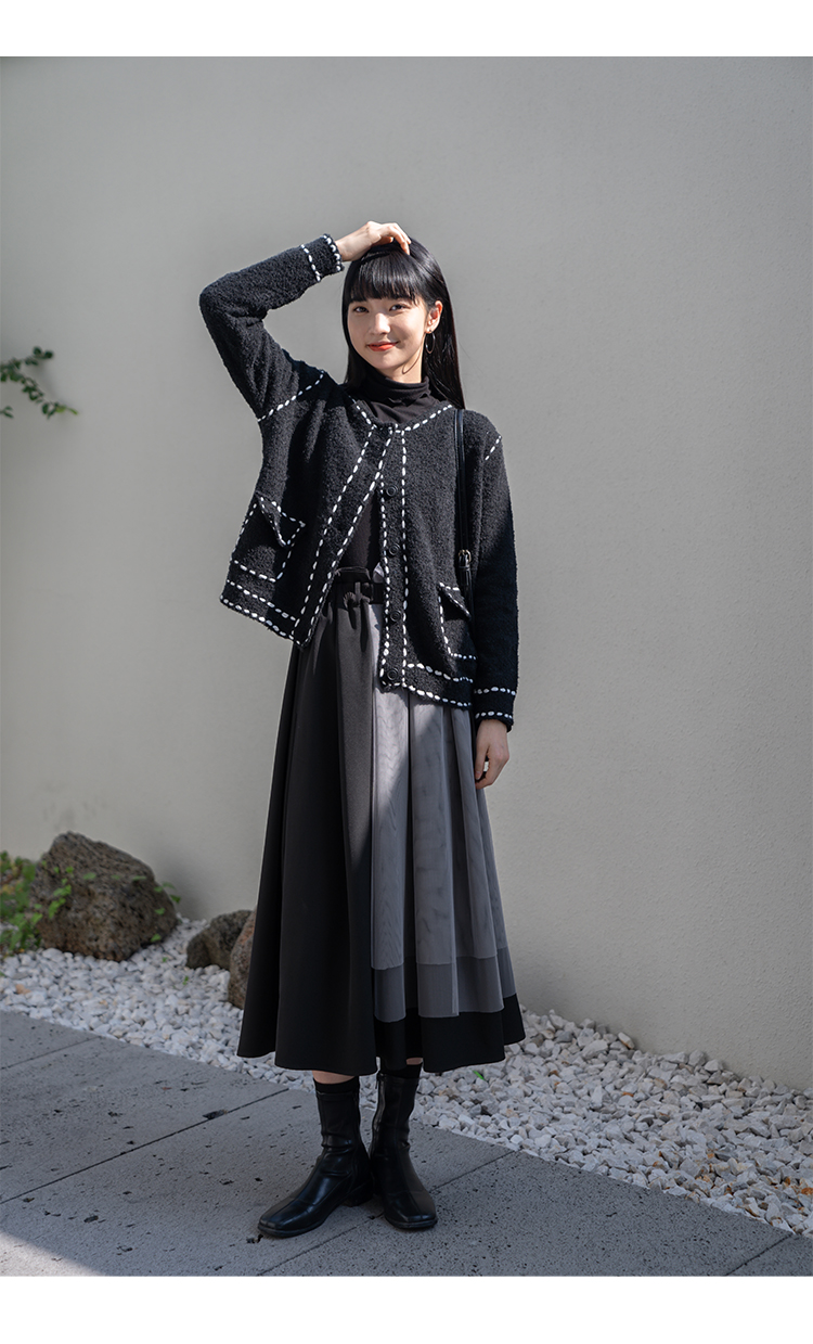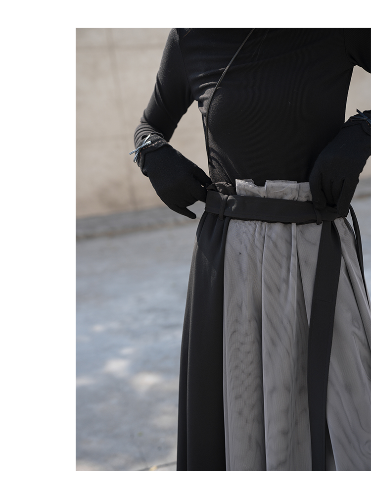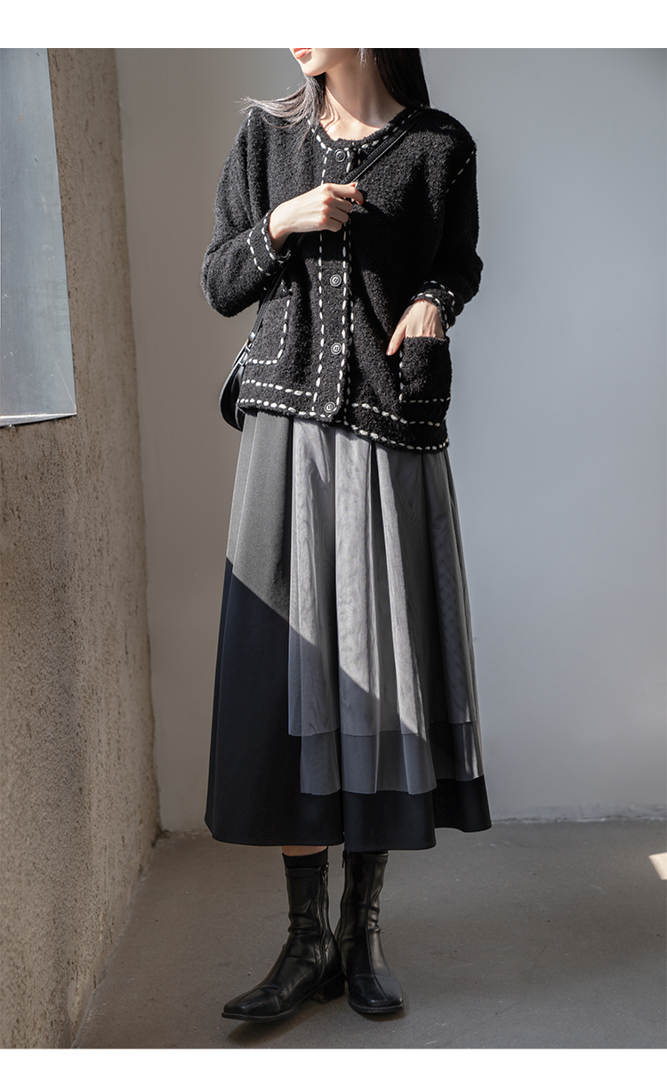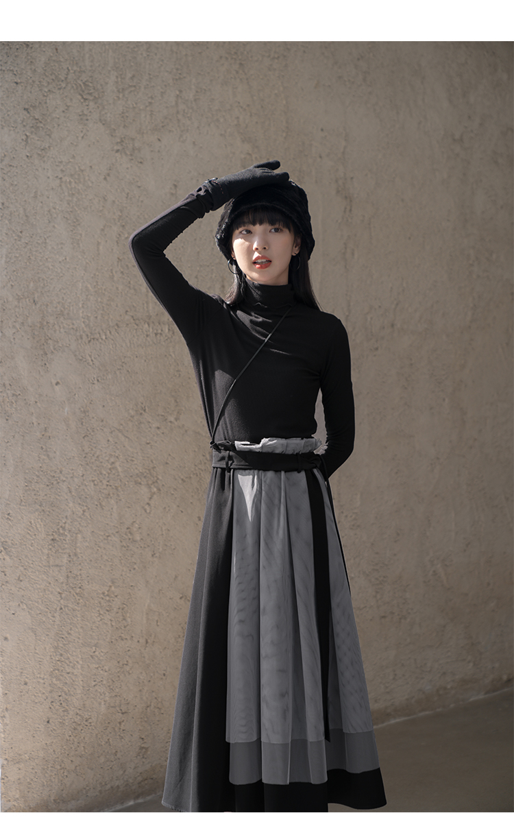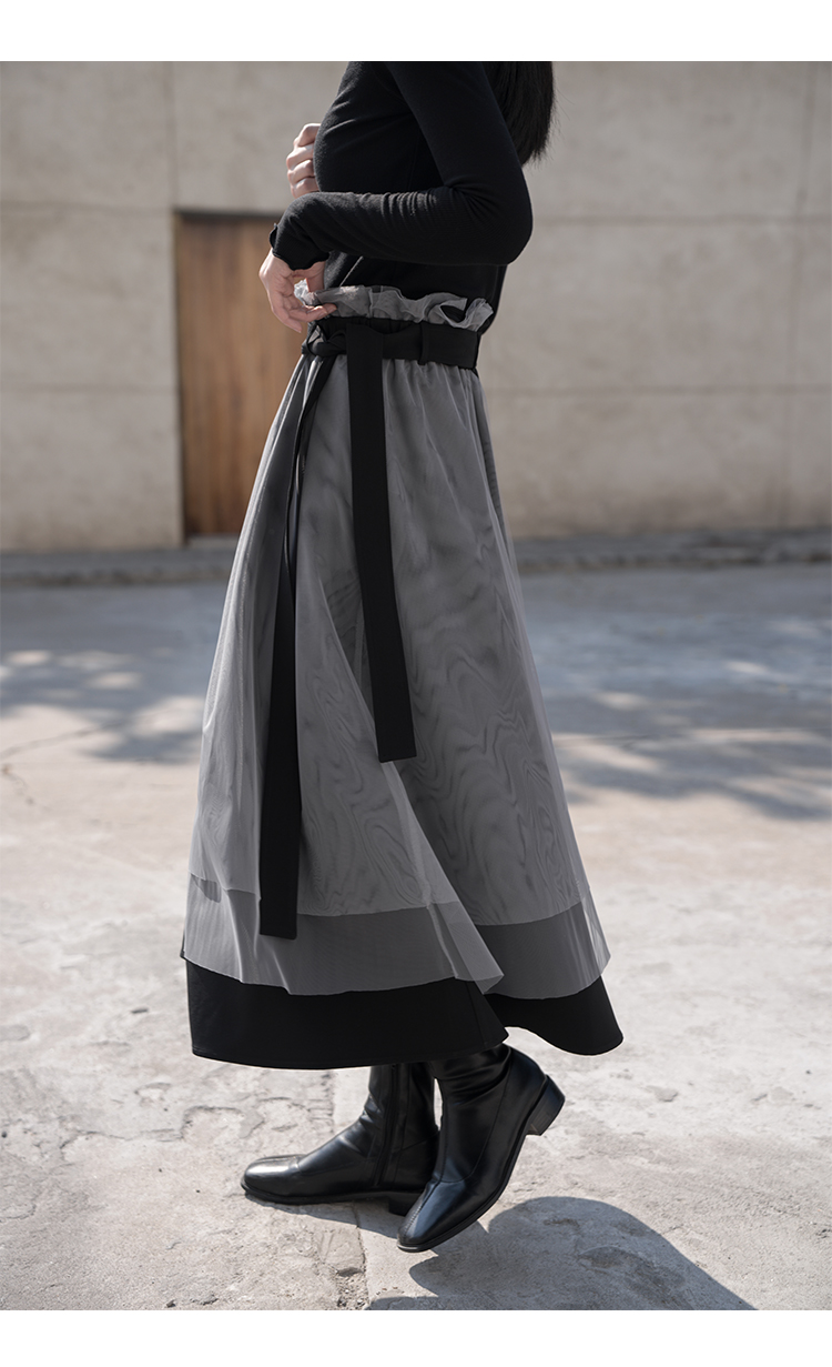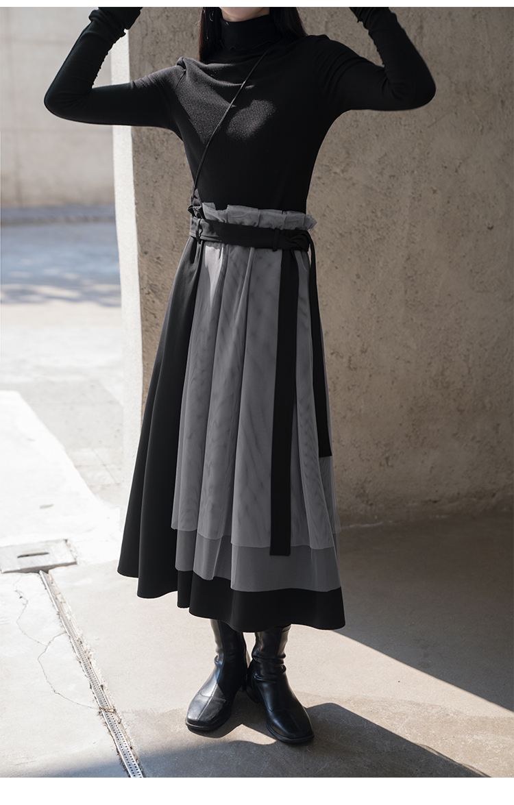 【6折秒杀】鹿向南 黑色半身裙女秋2025秋冬新款拼接设计感百褶长裙中长款裙LXN13902