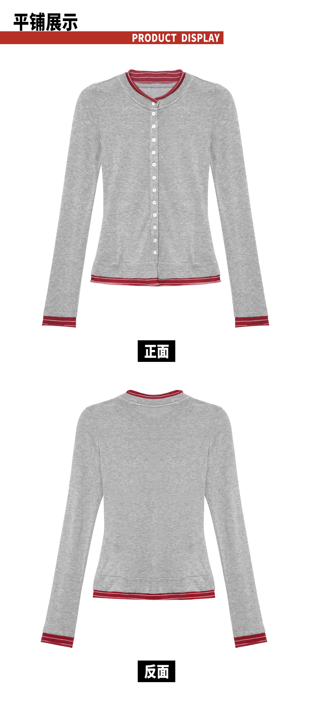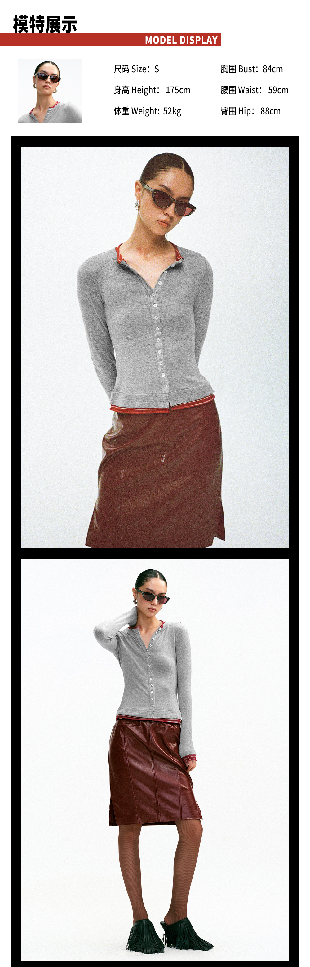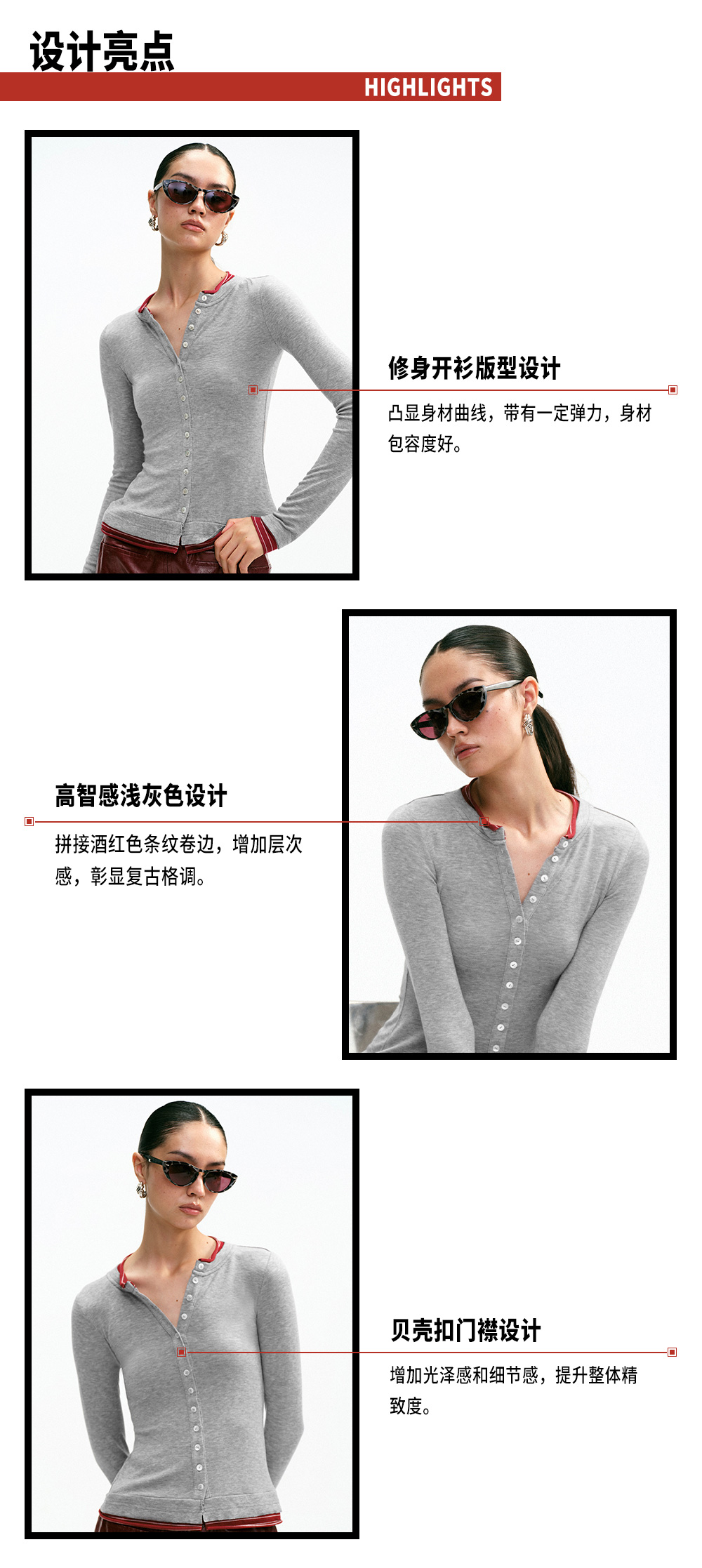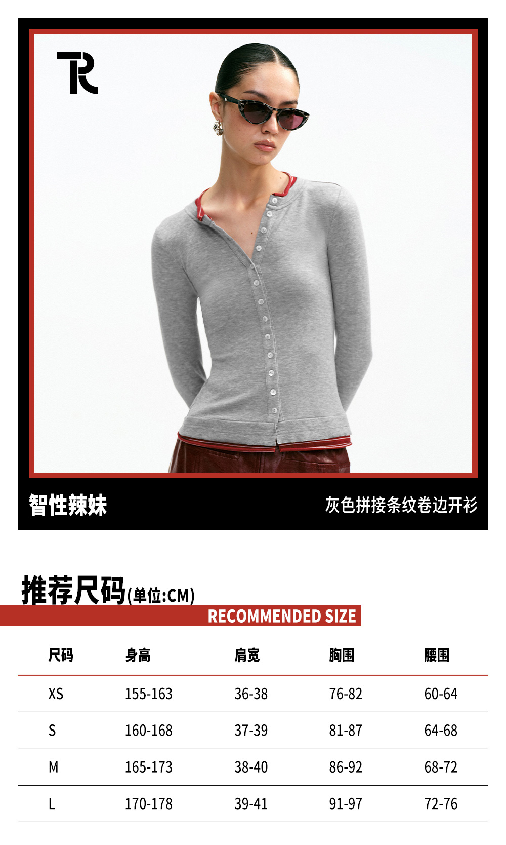 TR她热 智性辣妹 灰红撞色天丝羊毛弹力修身显瘦开衫打底