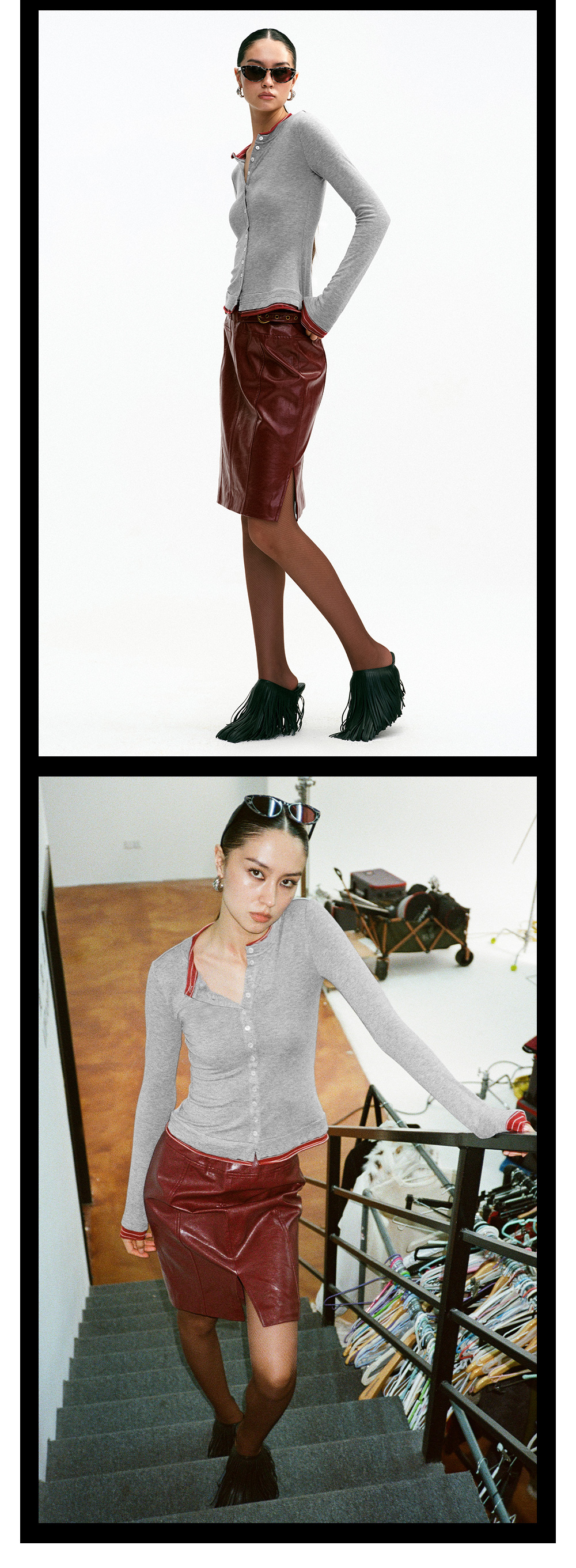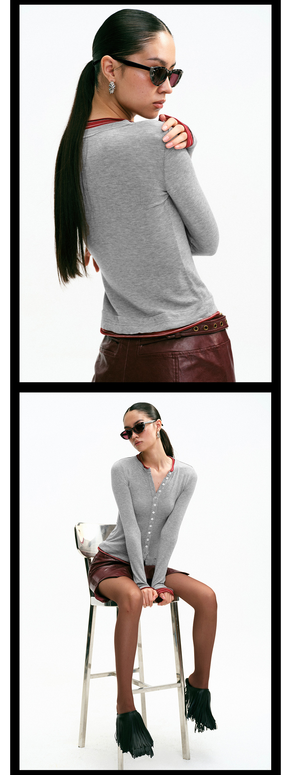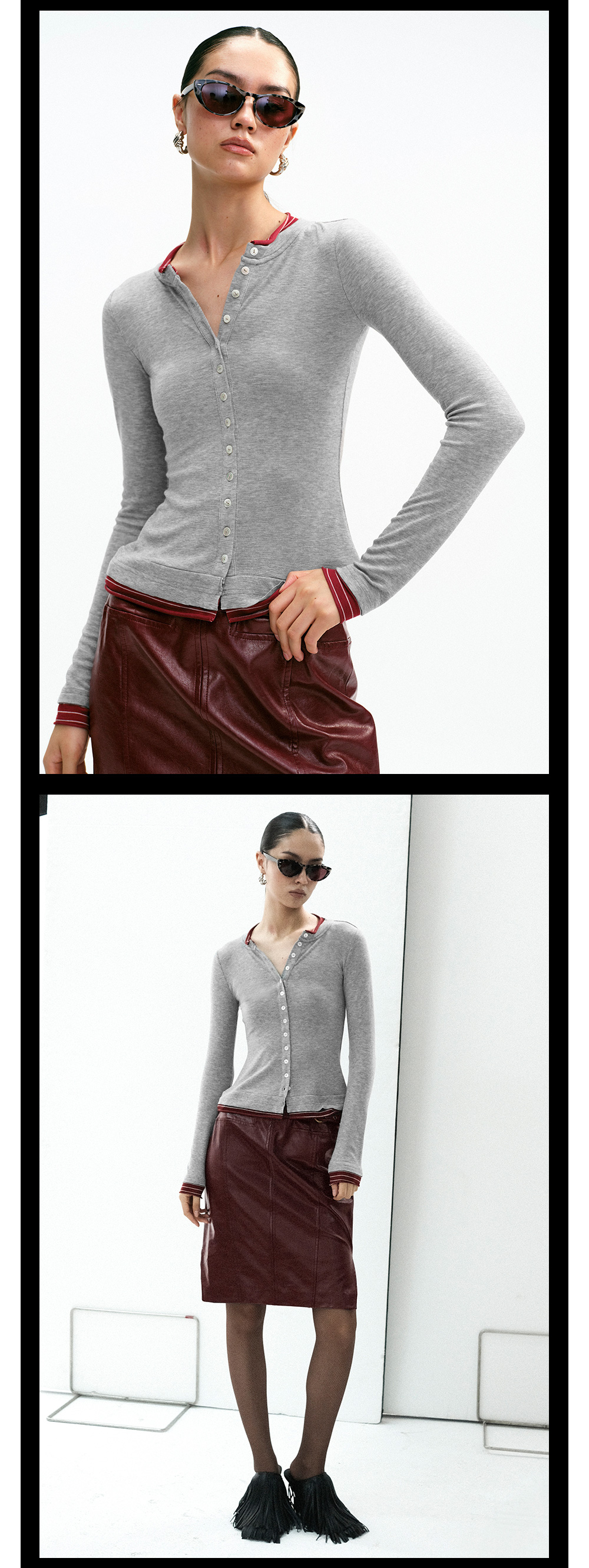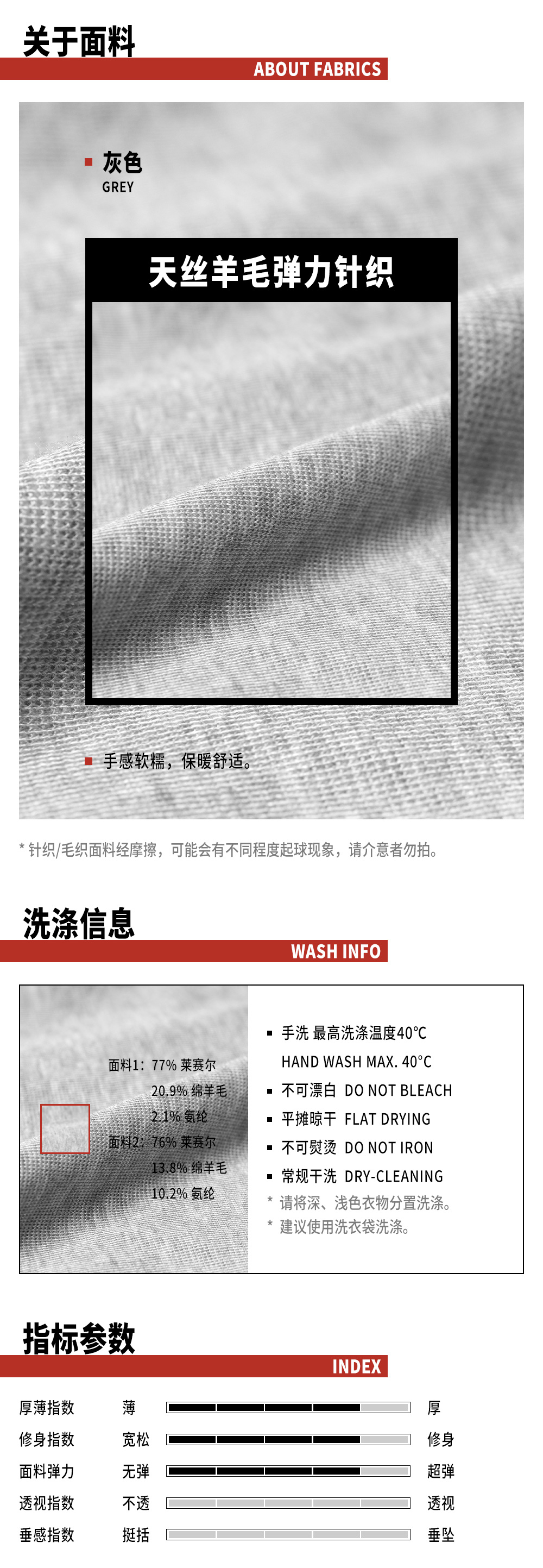 TR她热 智性辣妹 灰红撞色天丝羊毛弹力修身显瘦开衫打底