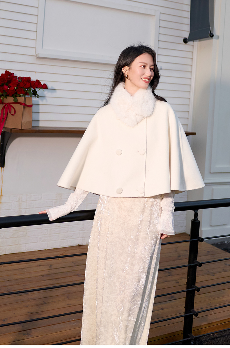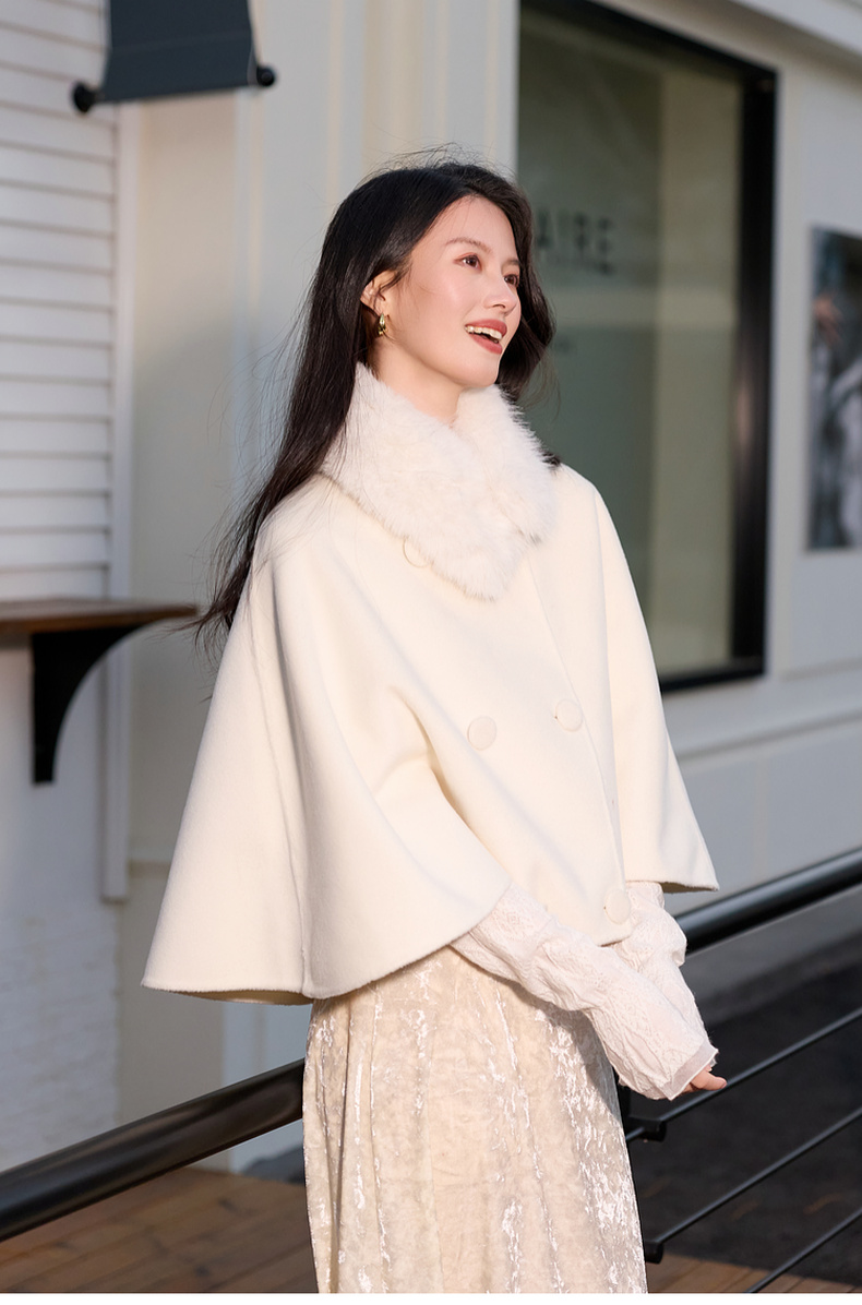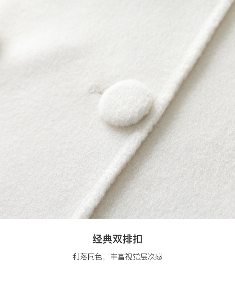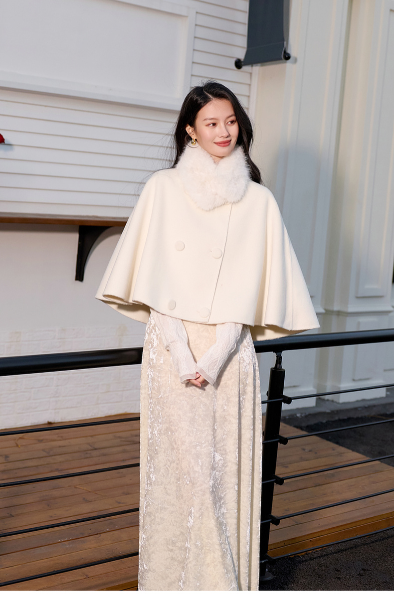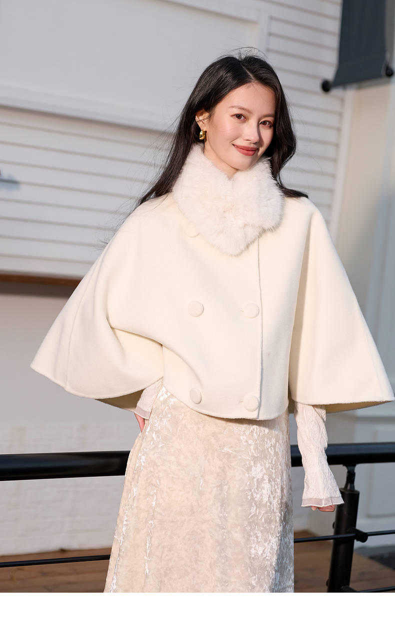 三彩2026新款温柔系奶白毛呢披肩外搭毛绒围脖双排扣轻奢氛围感