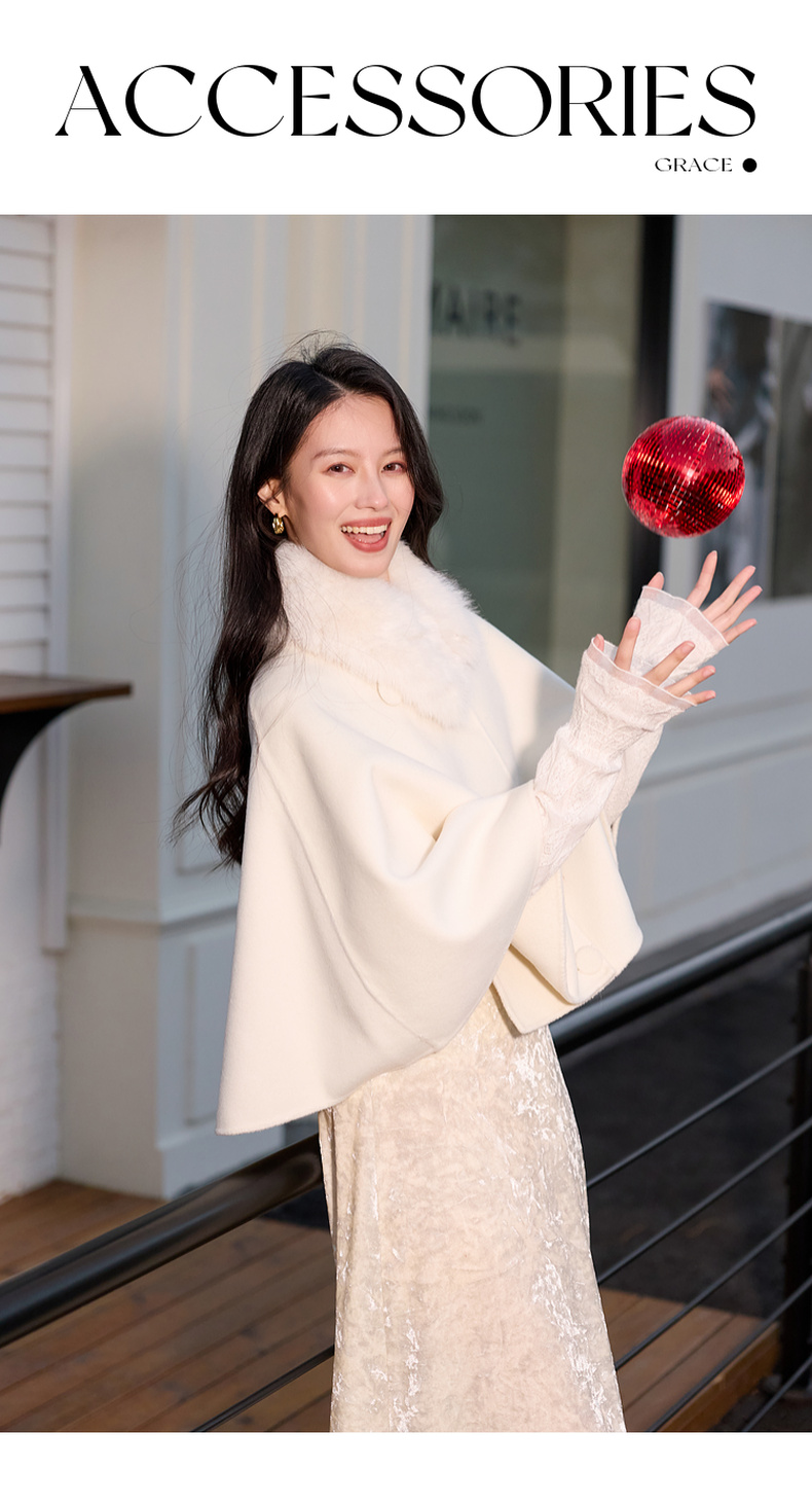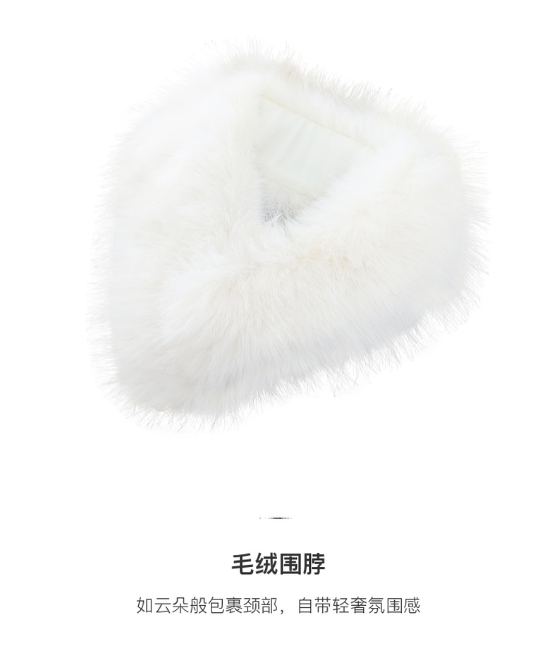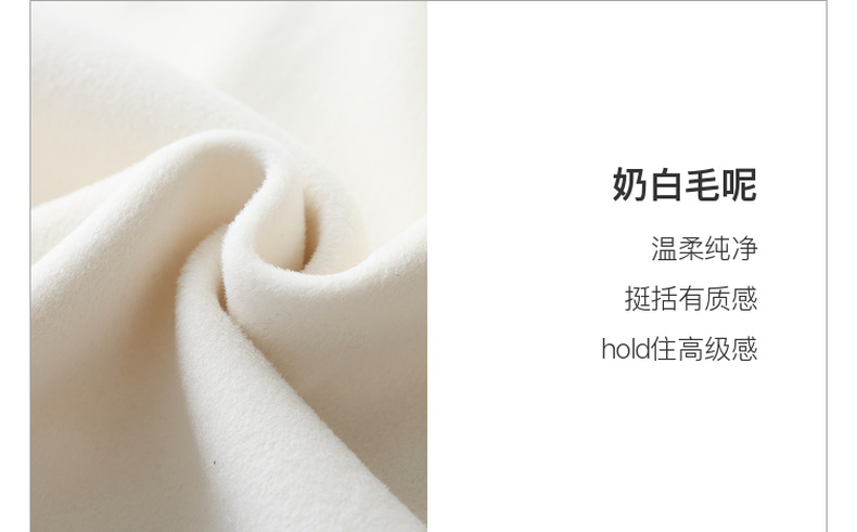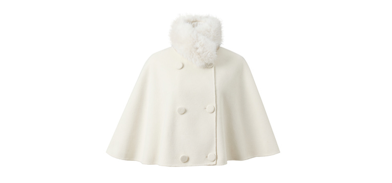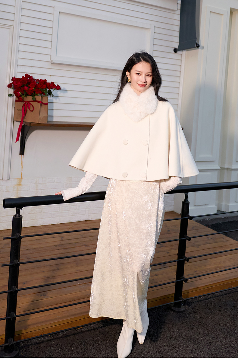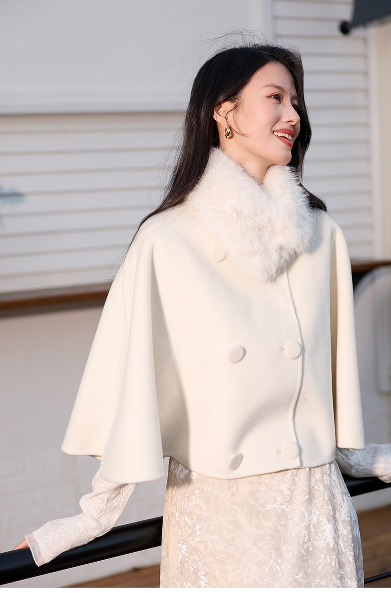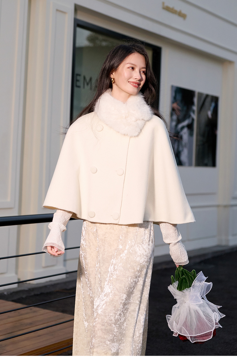 三彩2026新款温柔系奶白毛呢披肩外搭毛绒围脖双排扣轻奢氛围感