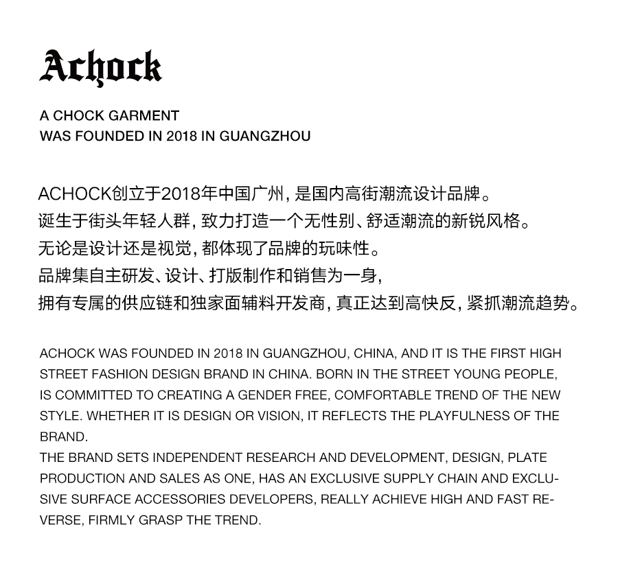 - ACHOCK创立于2018年的中国广州 以高街文化为核心 致力于打造一个无性别 舒适潮流的新锐风格