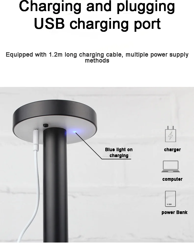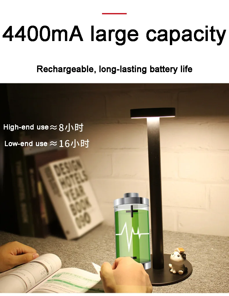 该台灯内置4400毫安高性能电池,充满电后使用时间长,可通过移动电源、电脑和适配器轻松供电。