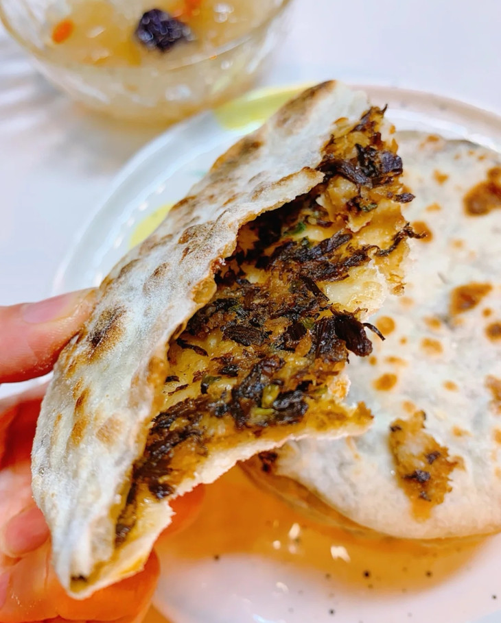 名字“简单粗暴” “梅干菜”展现出食材 “烧饼”指烤熟的面饼 中国传统面食🥢 要知道,从北到南 烧饼制作手法各不相同 但梅菜烧饼却从南开到了北 它是一张“土味”十足的烧饼