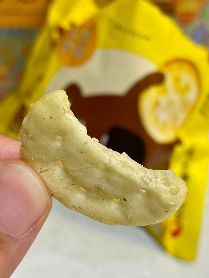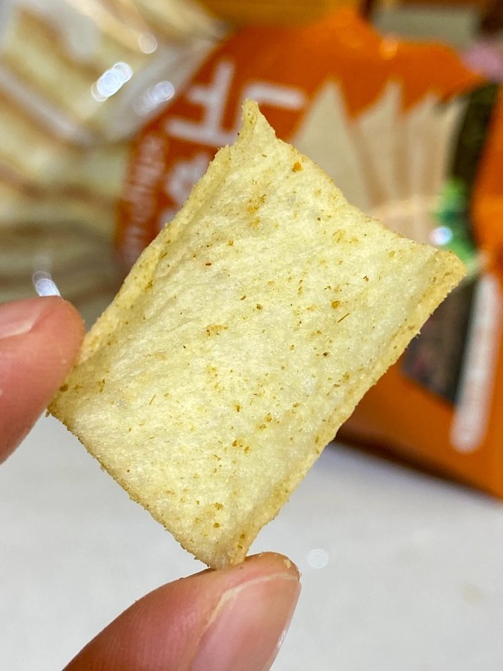 烧烤味的调料非常多,每片脆片上都几乎撒满了, 不会出现一口咸一口淡的情况,整体相对来说是薄的, 但是应该也是有面粉的,比长条的那款还是厚一点的