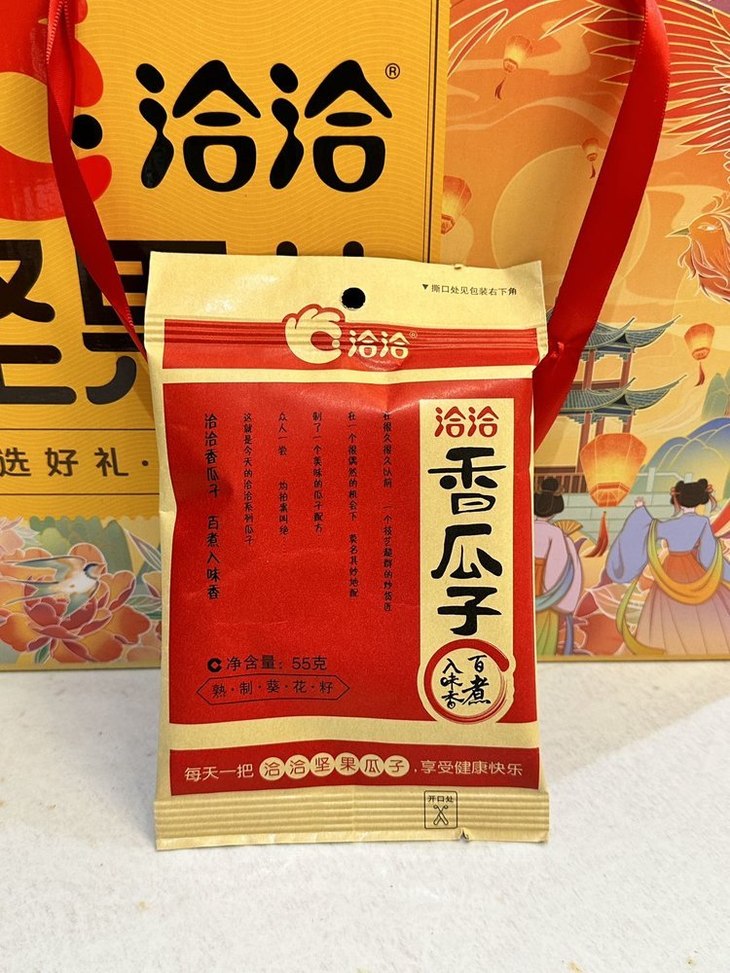 🔺香瓜子55g 咱就说家里的年货真就少不了它啊!! 聚会要是没点洽洽瓜子,这嗑都唠不起来 红袋还很喜庆!年味十足!