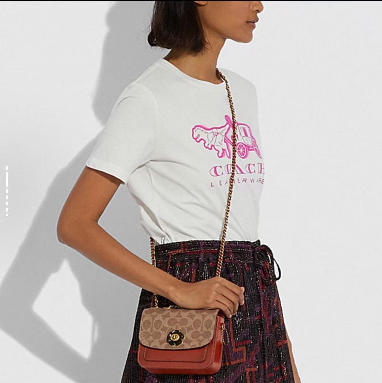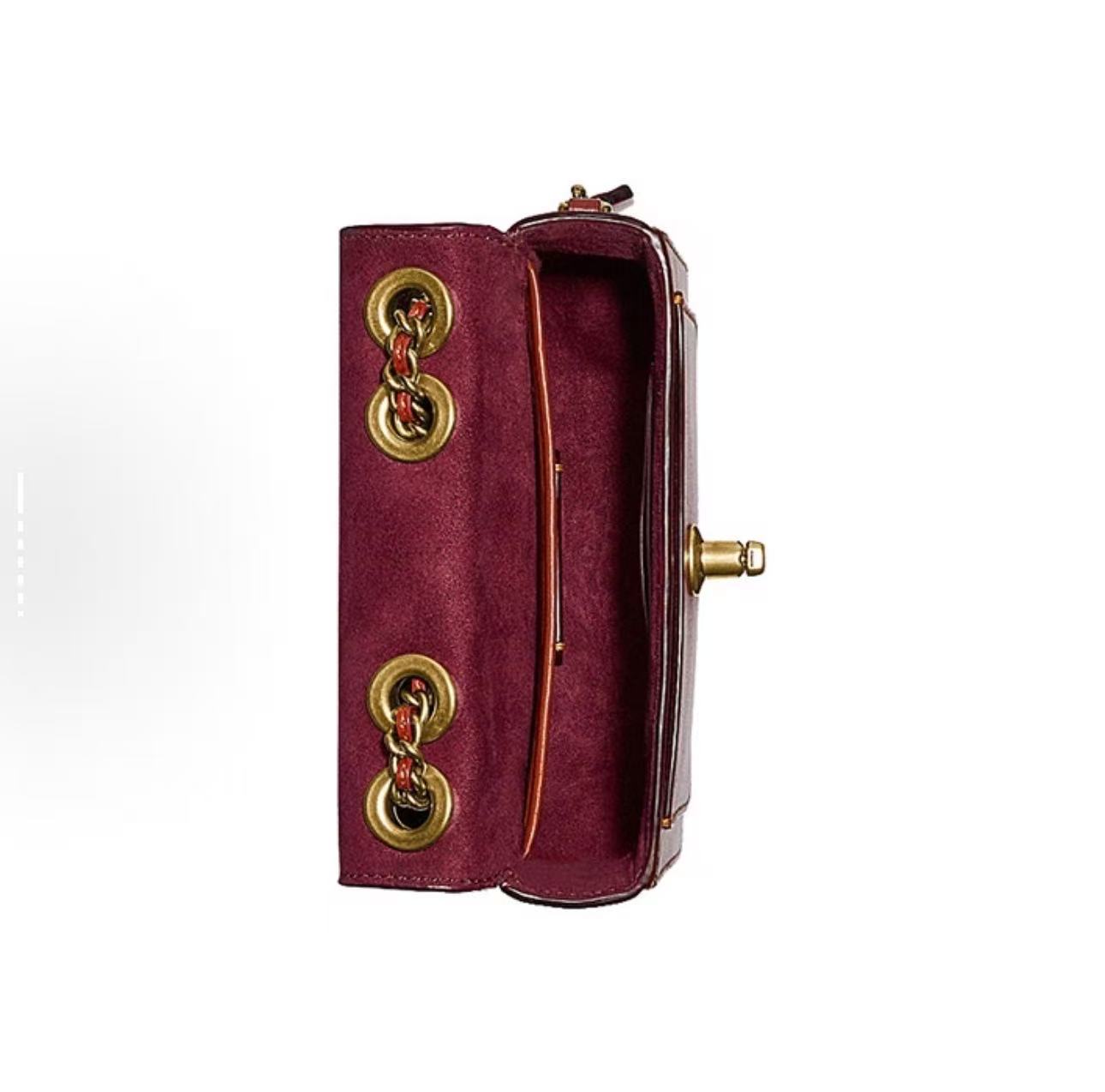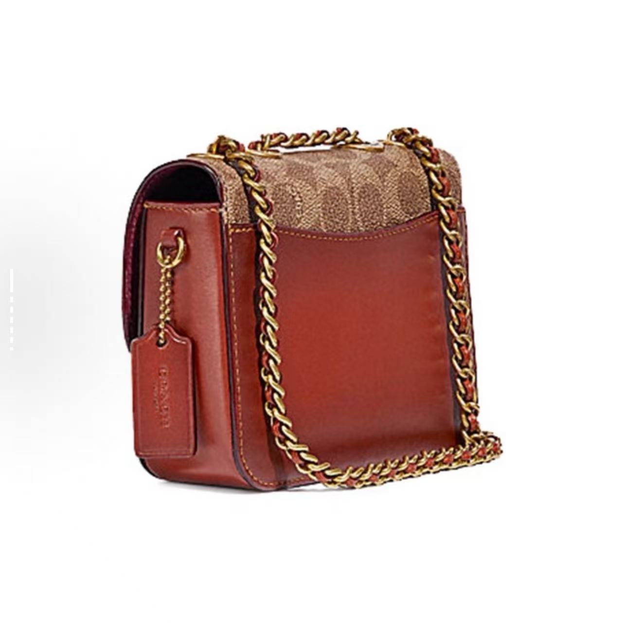 COACH蔻驰 Madison 16 山茶花旋扣标志性Logo吊饰拼色 小牛皮拼皮革 小方包单肩斜挎包 女款 棕色拼老花