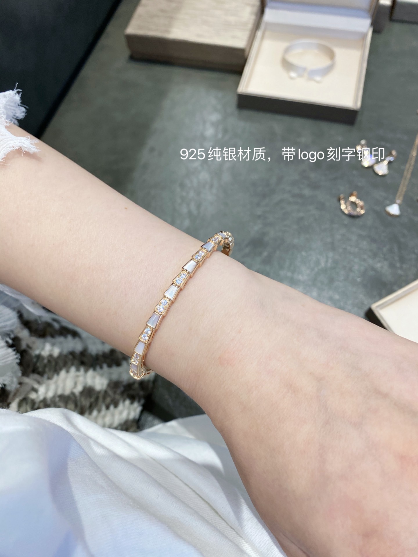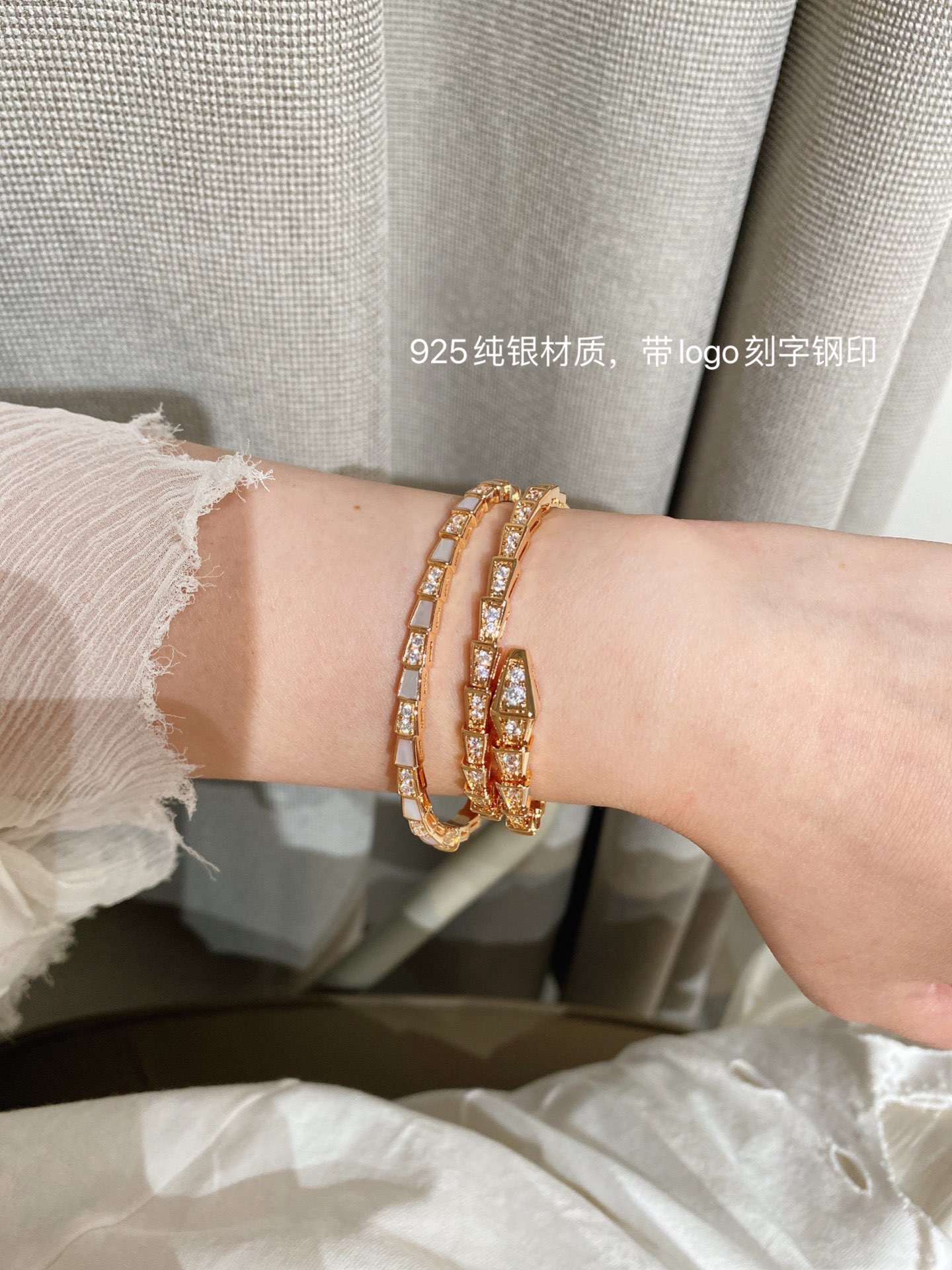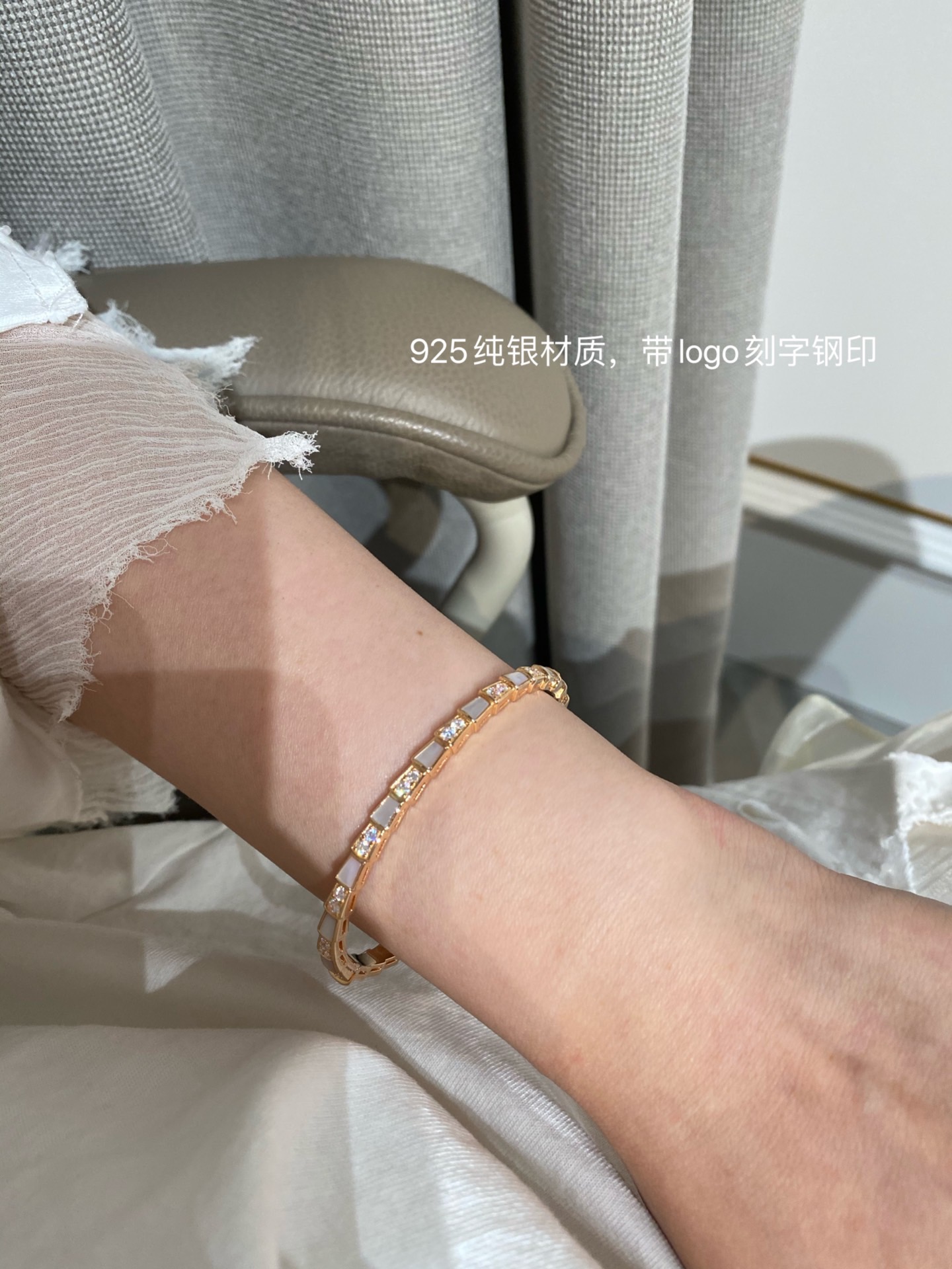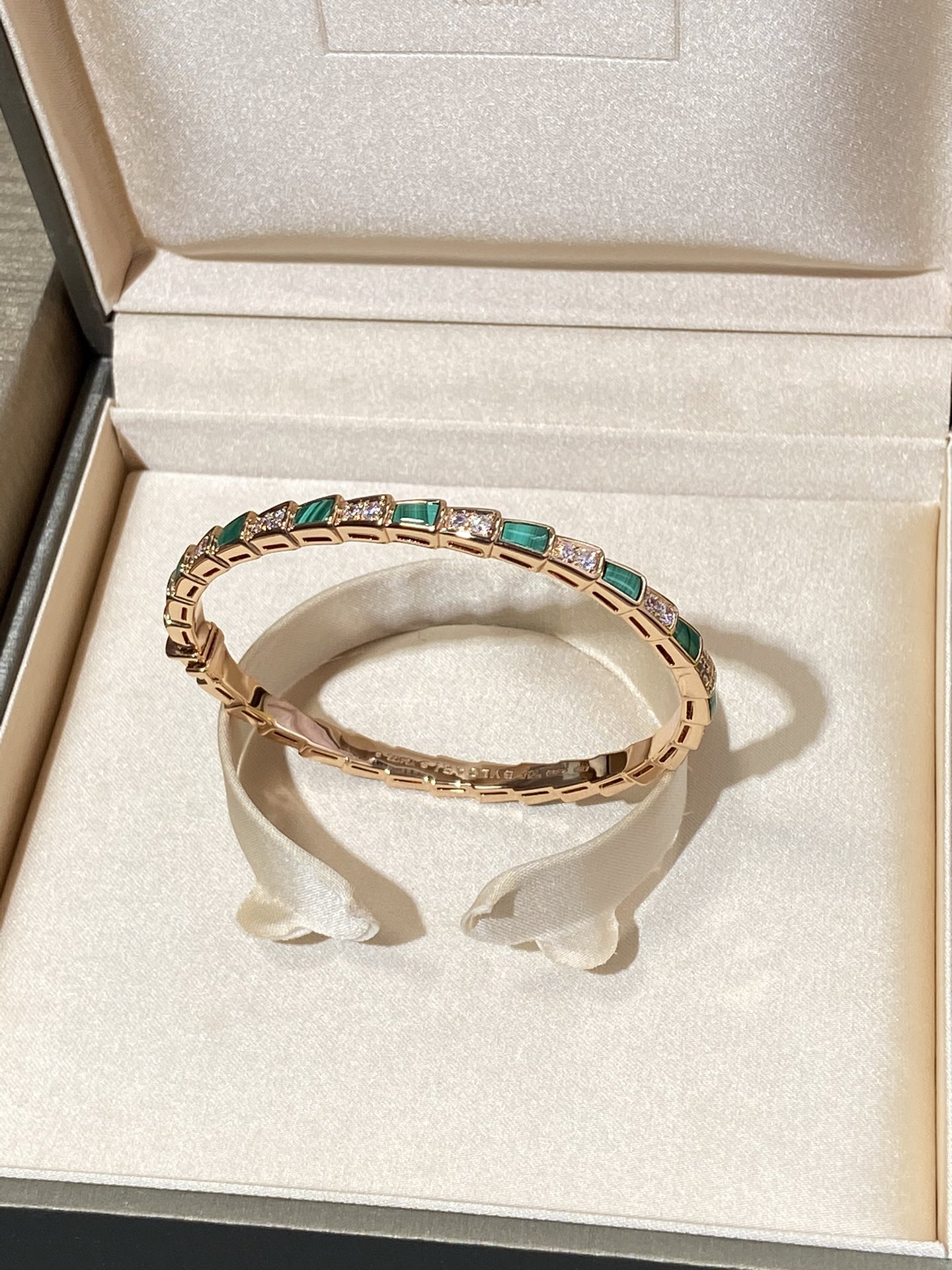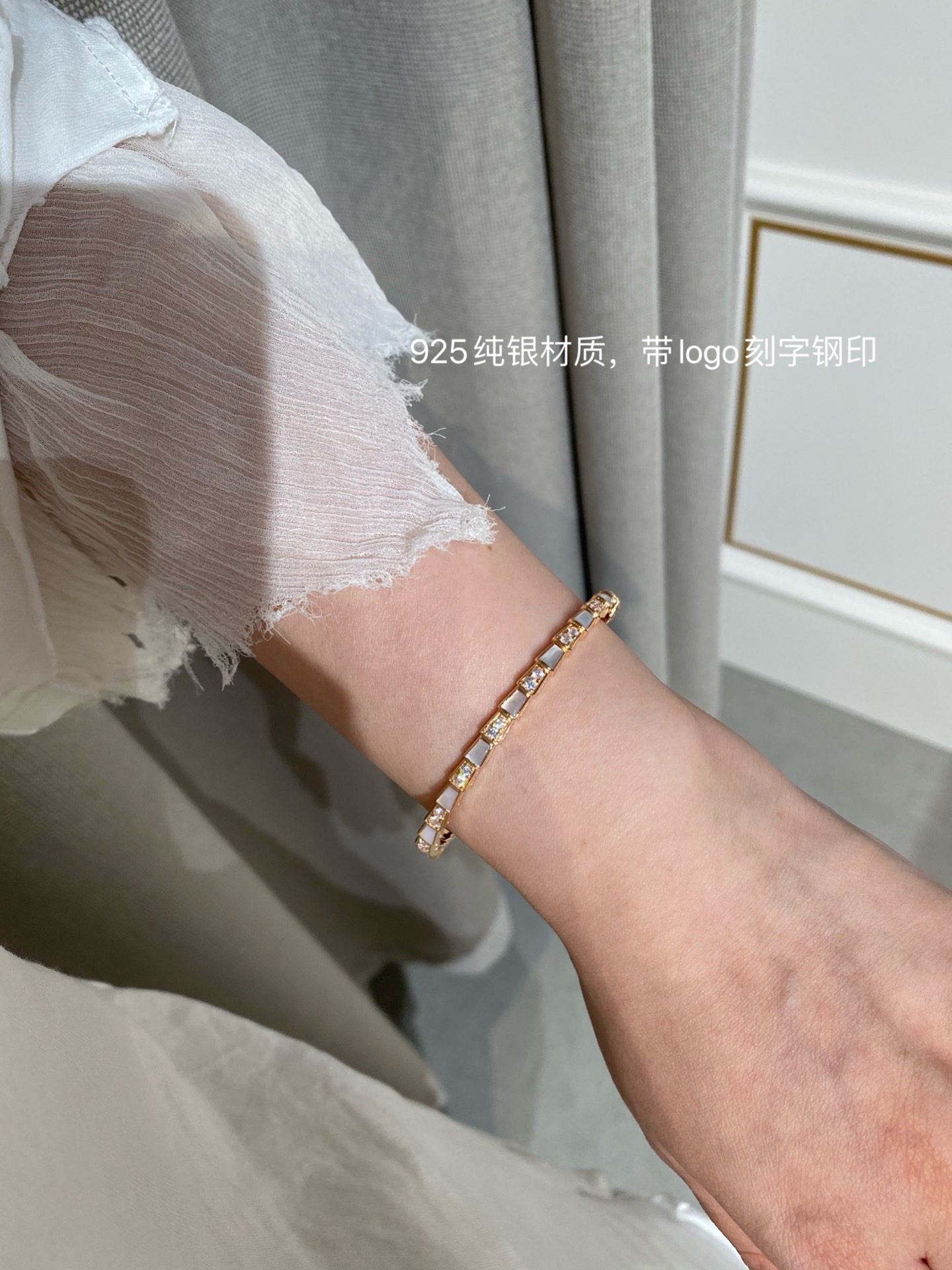 B宝经典蛇骨手镯,这款实在是太重磅了??贝母配蛇骨,超级重工的款式??我们调试了很多个版,整体曲线,贝母的形状,开关的结构,排列的钻石,每个细节都做到与zp神似??这款连抛光打磨的工具都是老师傅根据经验自己制作的,目的就是保护这款手镯应有的灵魂感。市面根据官网图做货的,底部做的镂空实际是不对版的,这款手镯内部是光面哦?? 我们家贝母都是深海贝母,光泽一整片都是一致的,没有发黑发黄的光感,也特别均匀,戴上手是由内而外散发光彩~贴合度是独一无二的,和真金的工艺一样,一对一车石,没有凸起,几乎无缝,是个平面的效果
