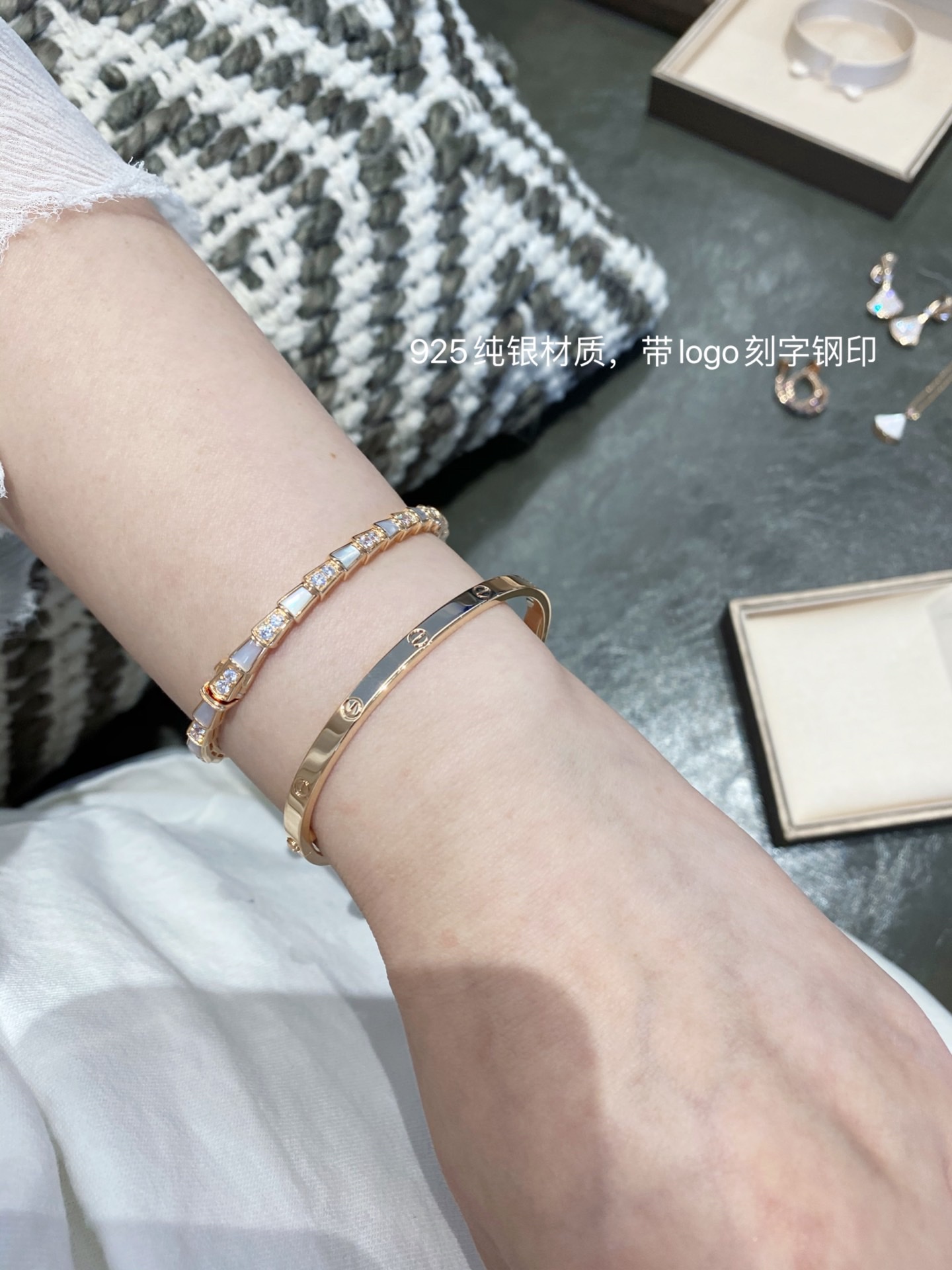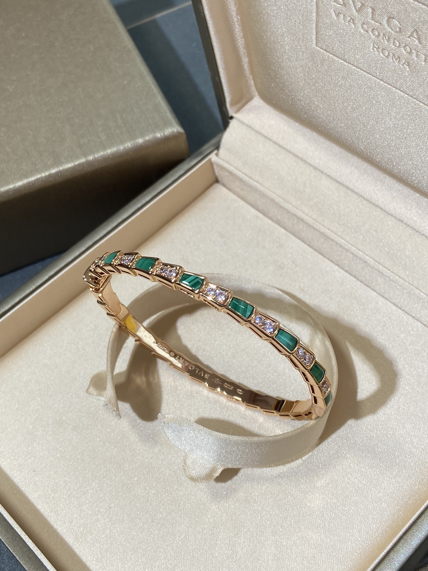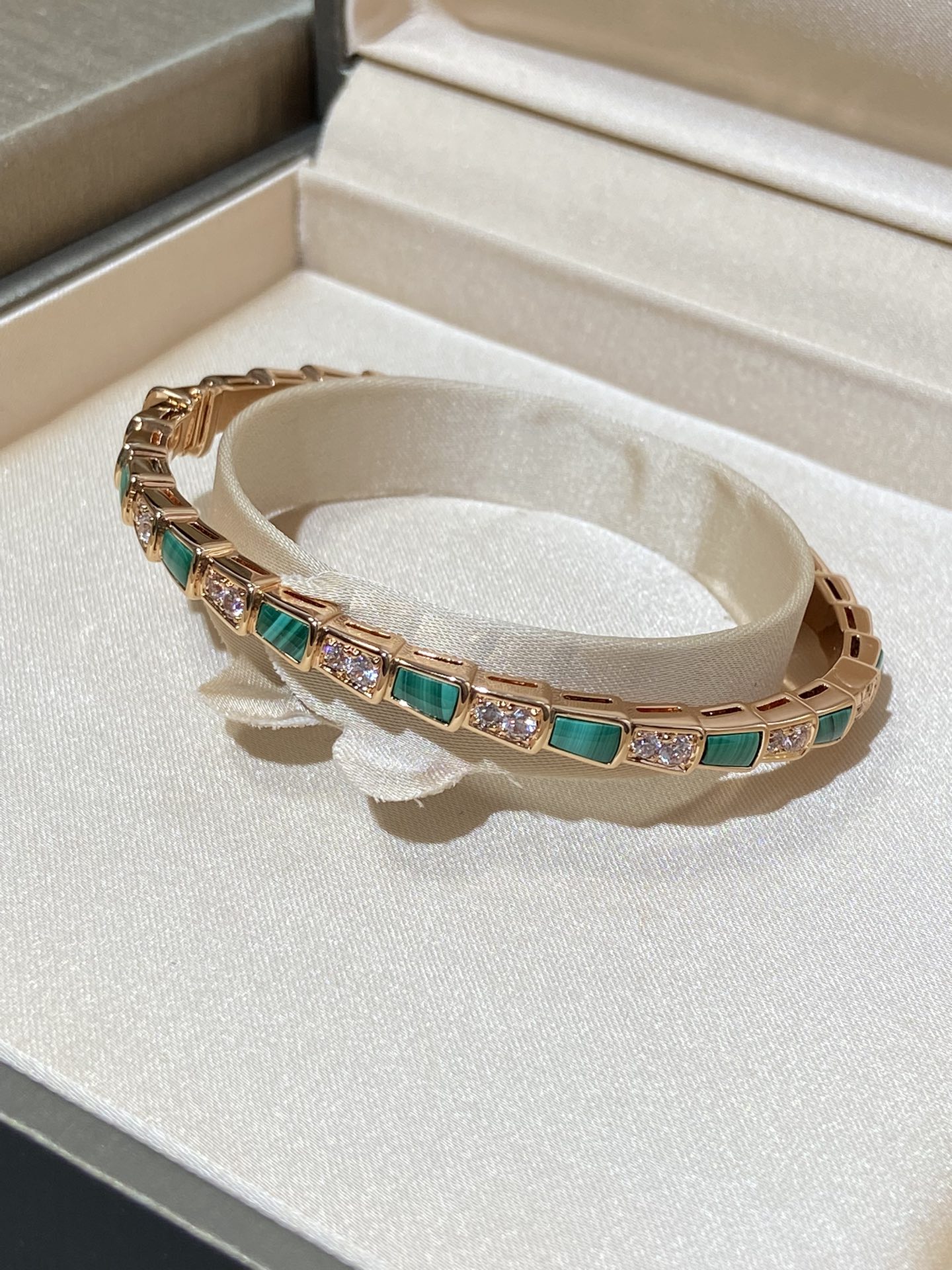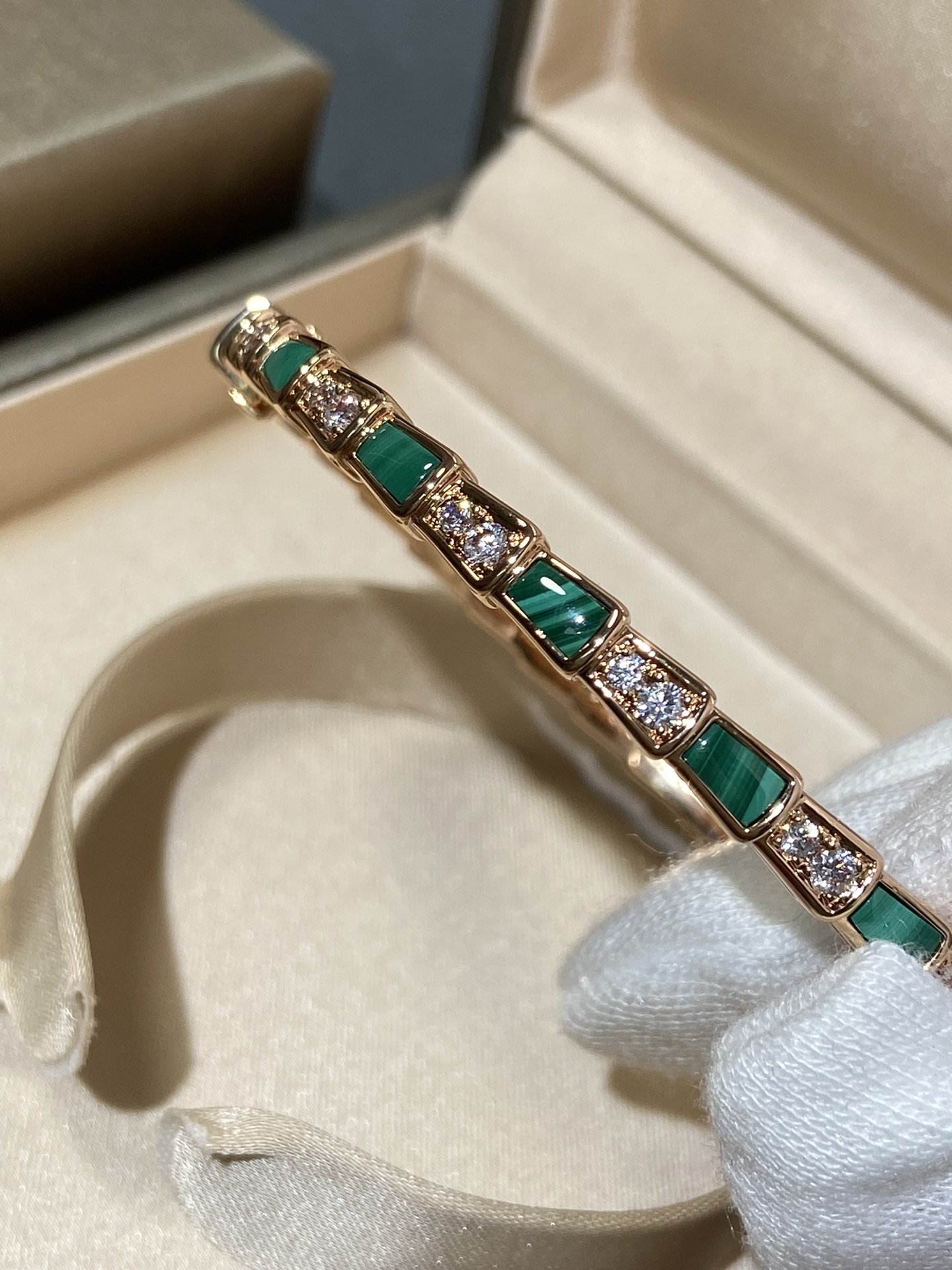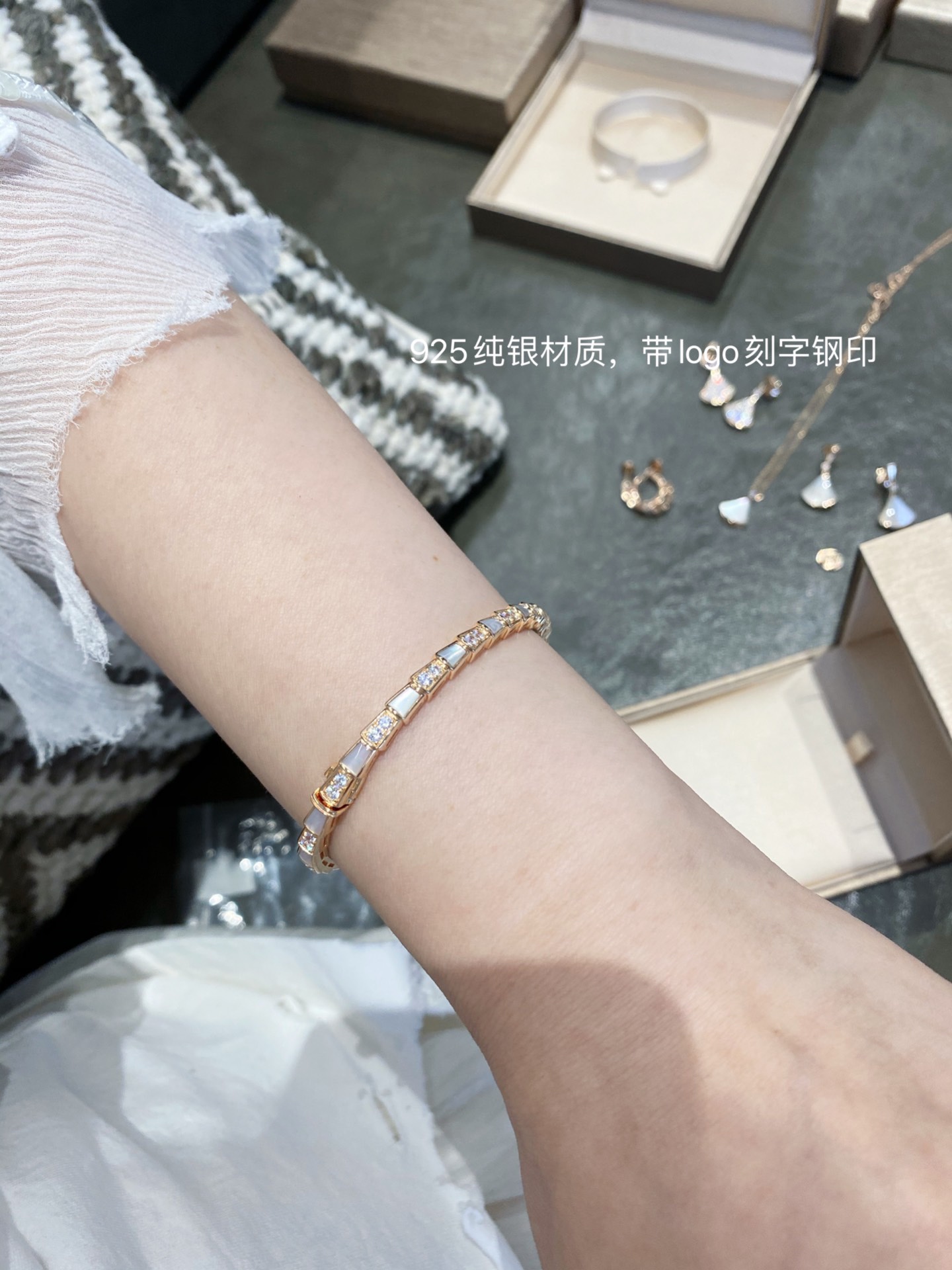 B宝经典蛇骨手镯,这款实在是太重磅了??贝母配蛇骨,超级重工的款式??我们调试了很多个版,整体曲线,贝母的形状,开关的结构,排列的钻石,每个细节都做到与zp神似??这款连抛光打磨的工具都是老师傅根据经验自己制作的,目的就是保护这款手镯应有的灵魂感。市面根据官网图做货的,底部做的镂空实际是不对版的,这款手镯内部是光面哦?? 我们家贝母都是深海贝母,光泽一整片都是一致的,没有发黑发黄的光感,也特别均匀,戴上手是由内而外散发光彩~贴合度是独一无二的,和真金的工艺一样,一对一车石,没有凸起,几乎无缝,是个平面的效果