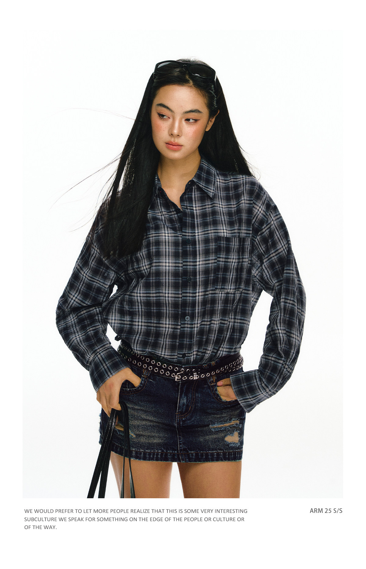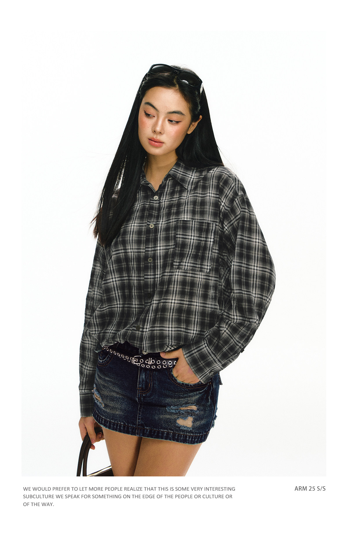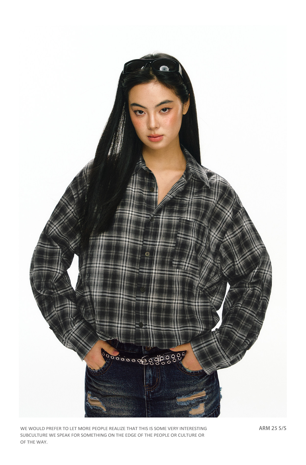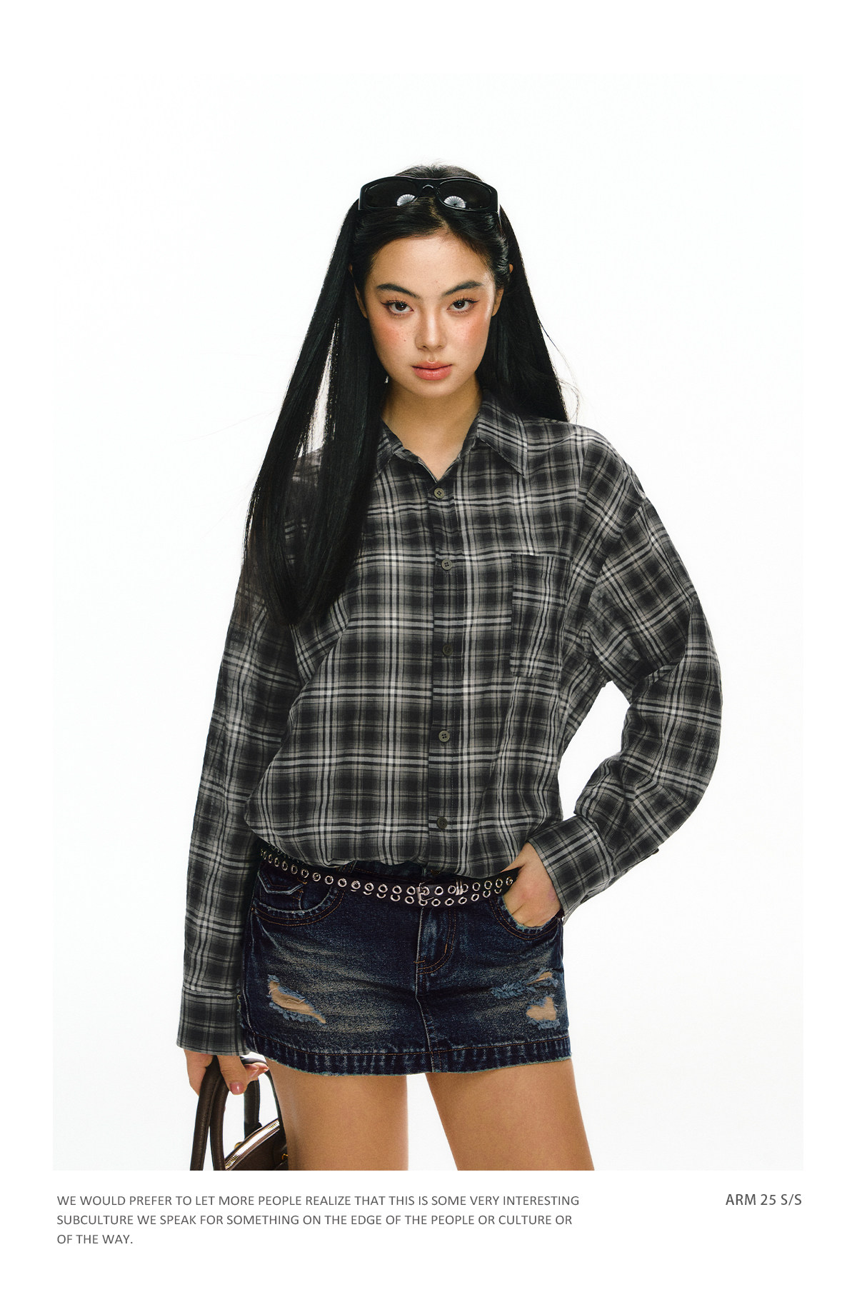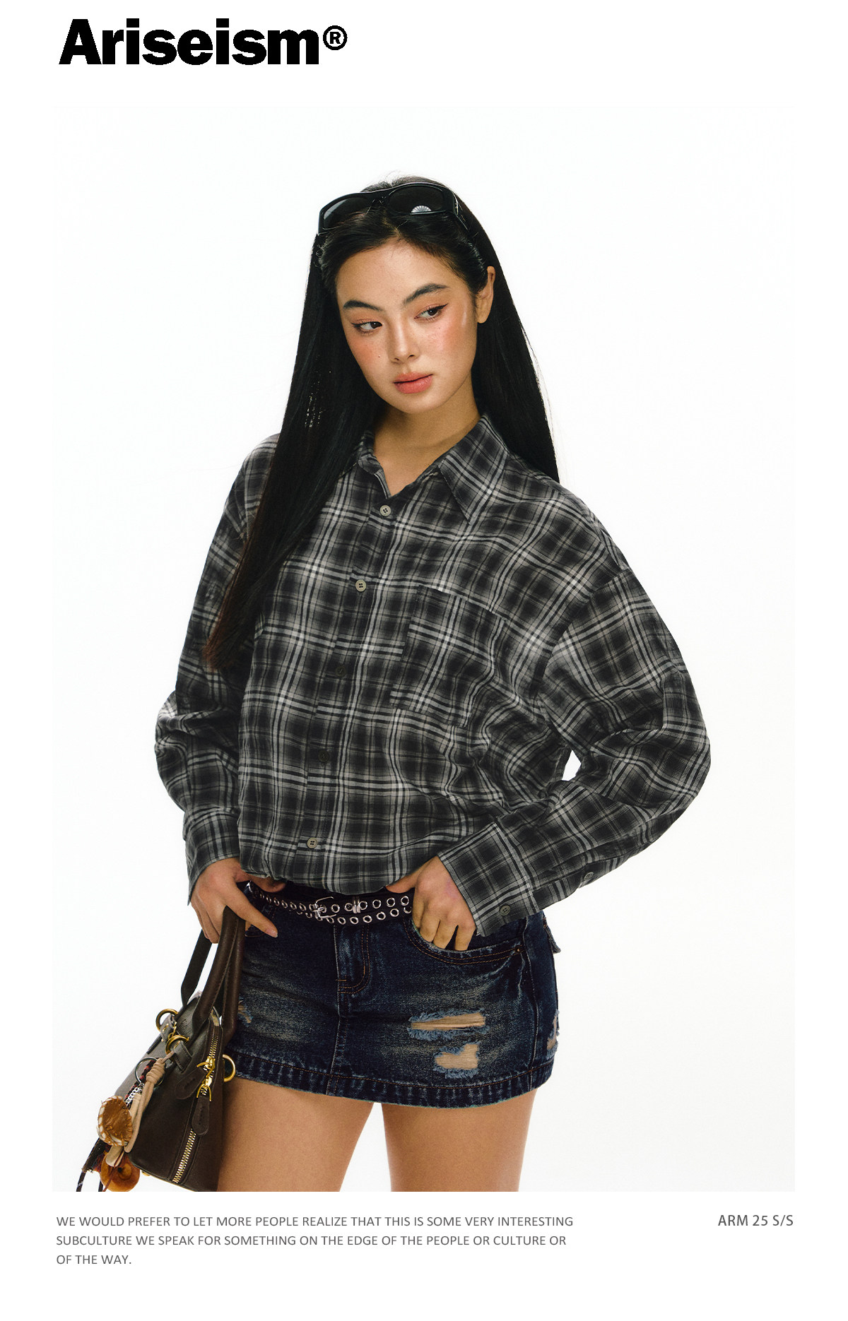 Ariseism 美式复古设计感长袖格子衬衫女秋冬新款上衣