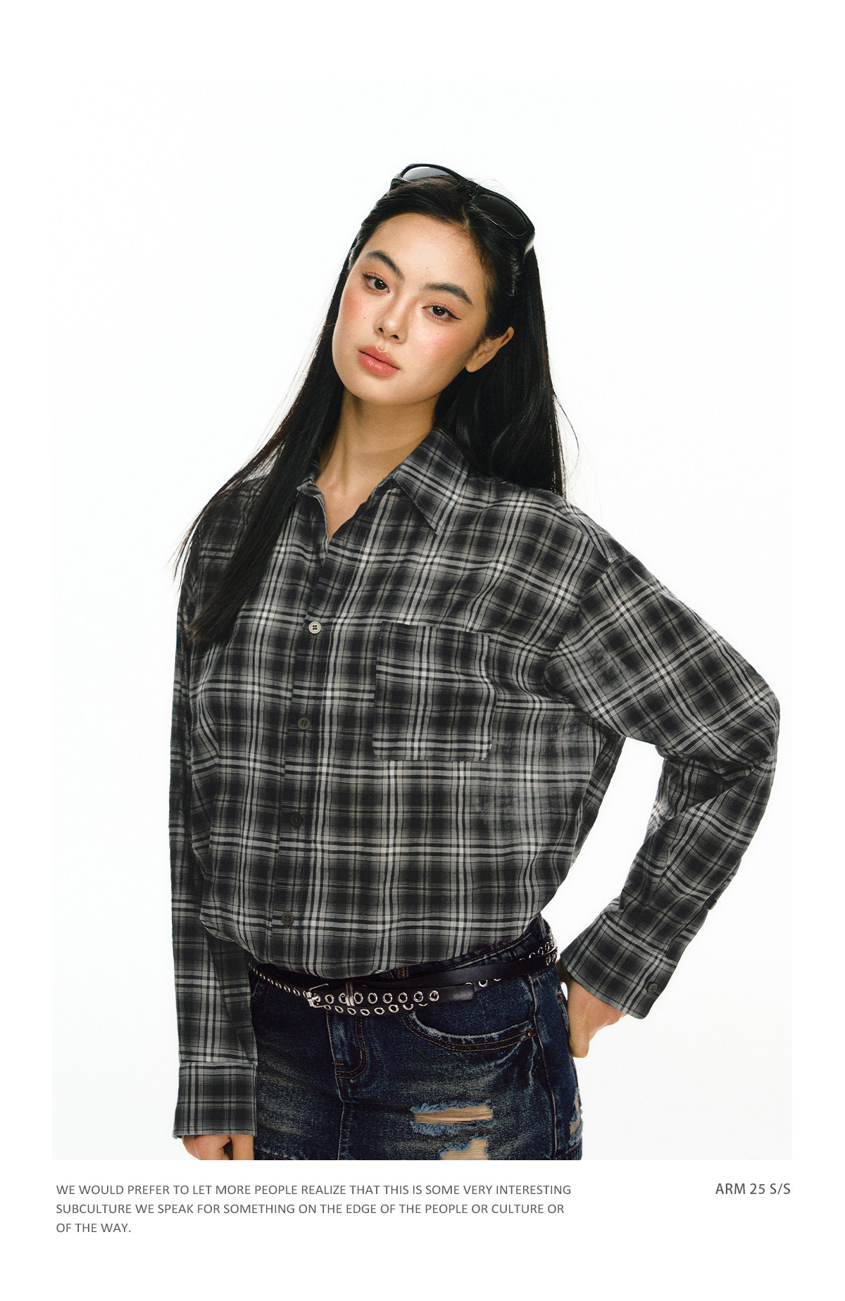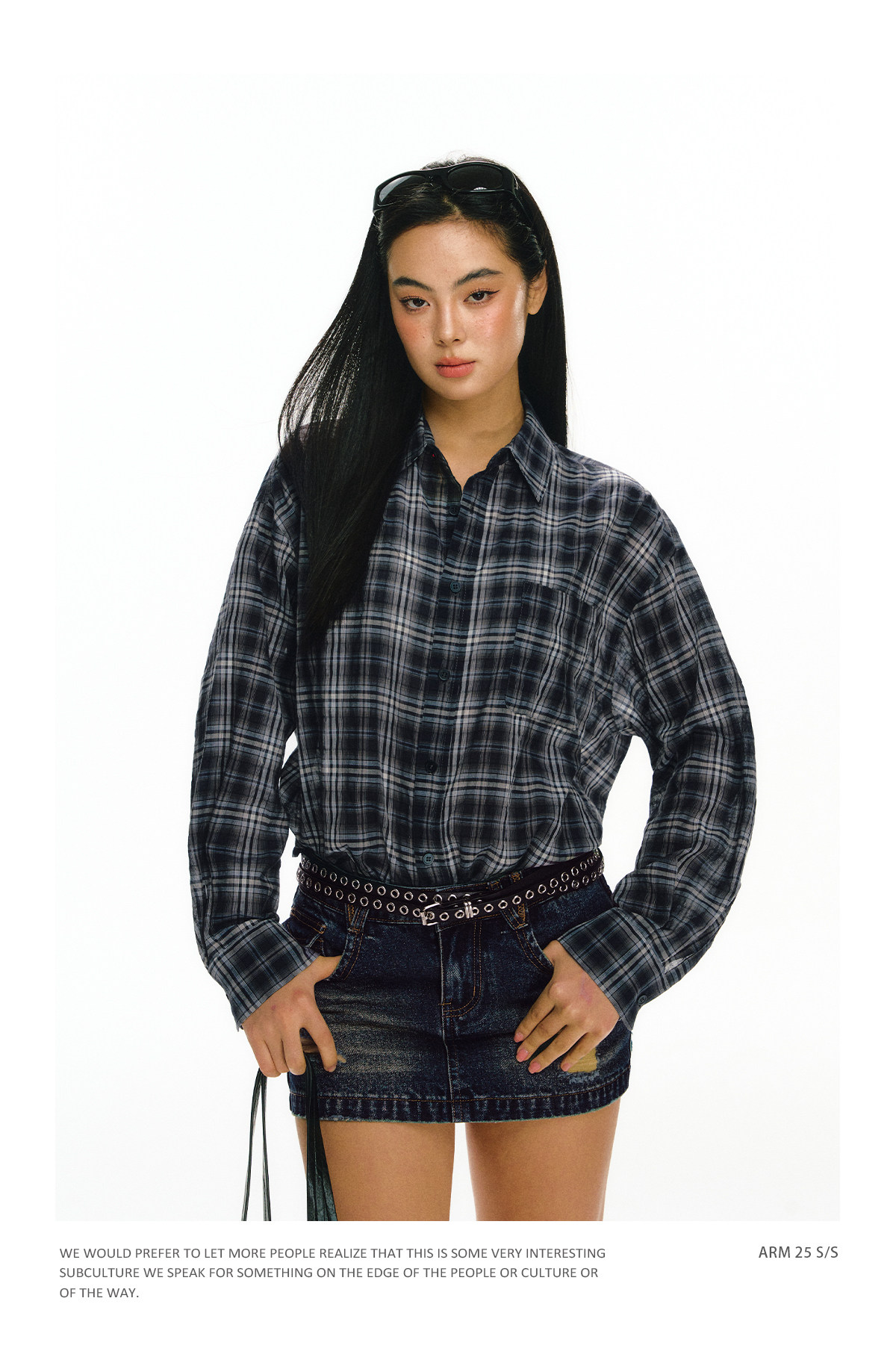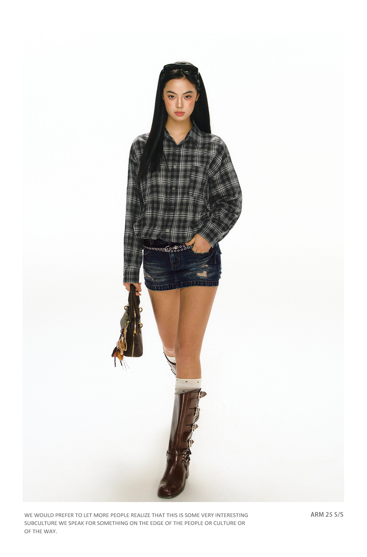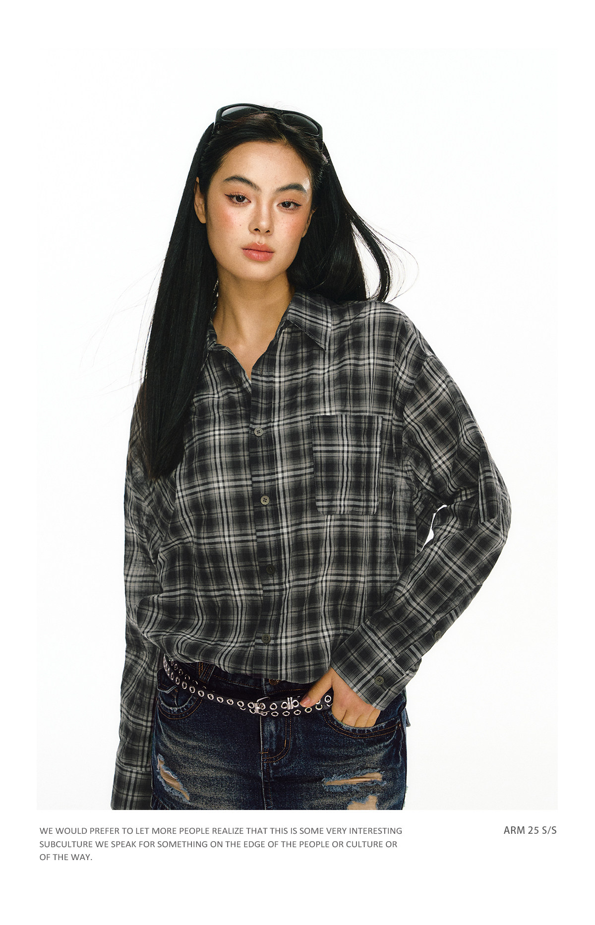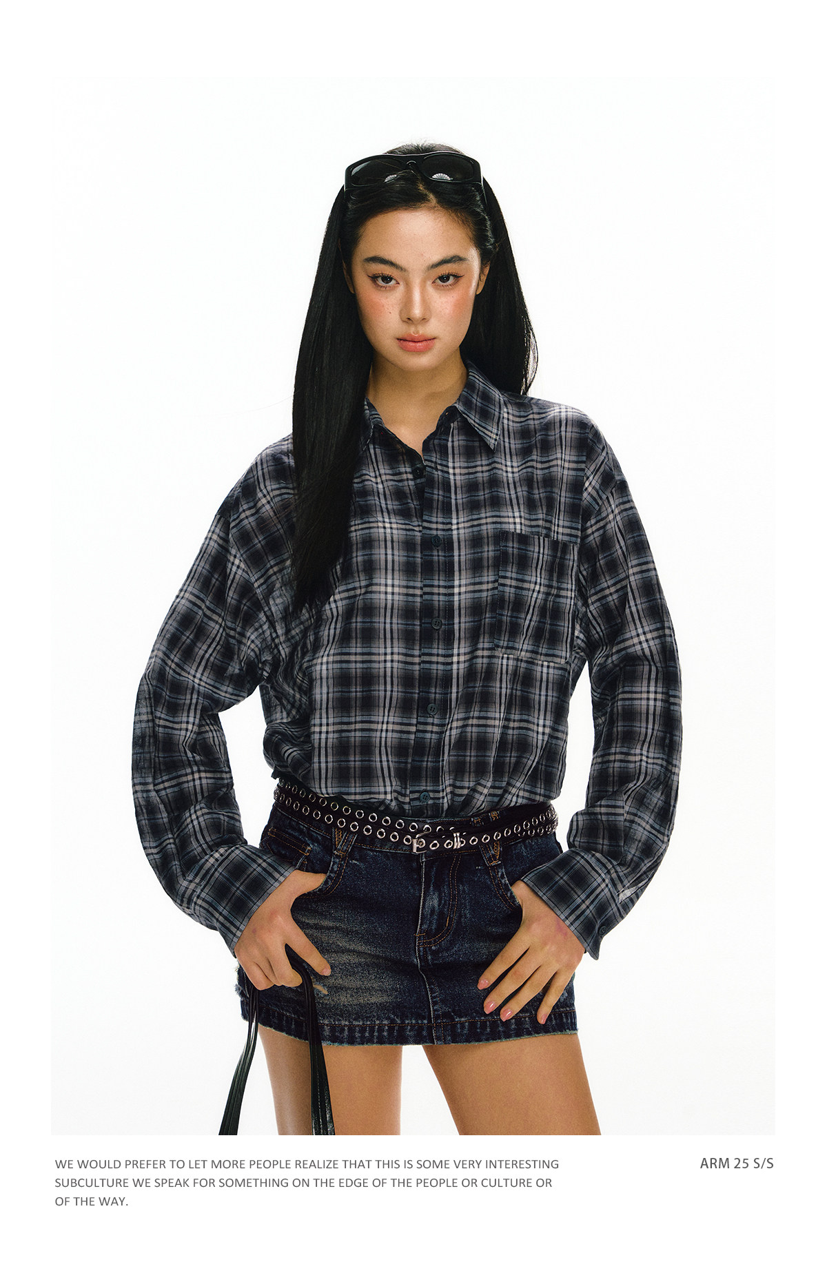 Ariseism 美式复古设计感长袖格子衬衫女秋冬新款上衣