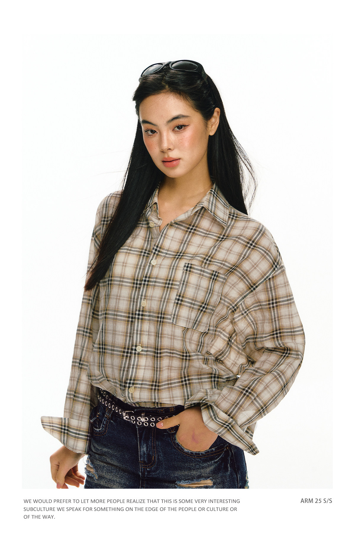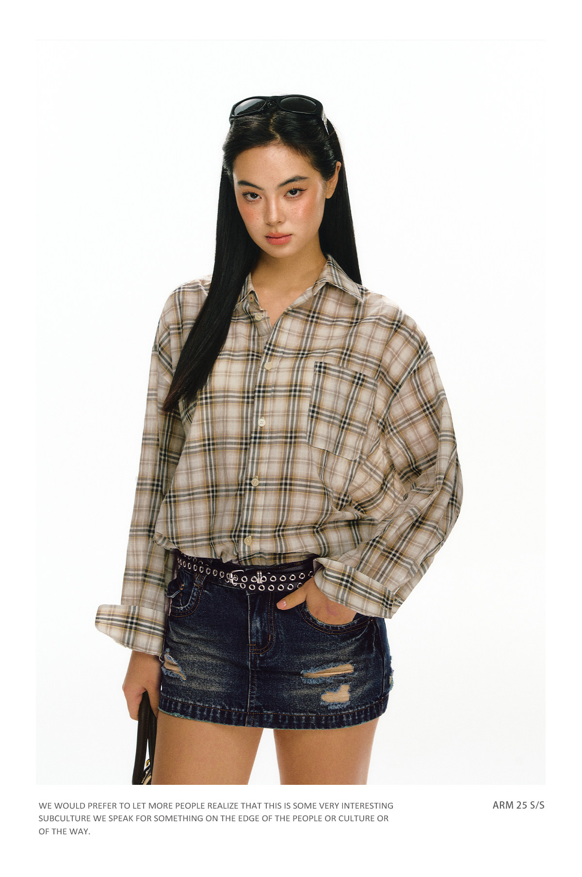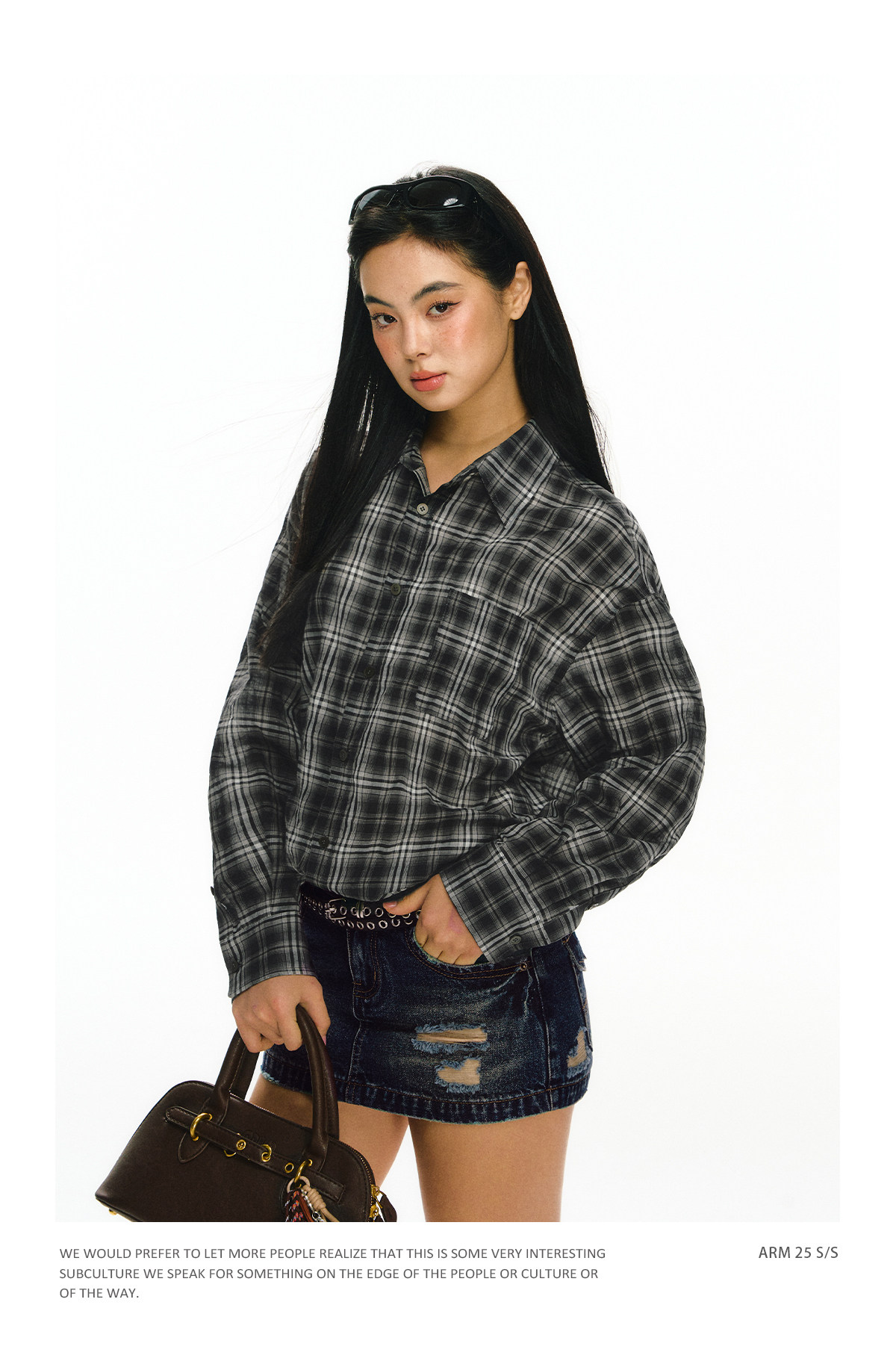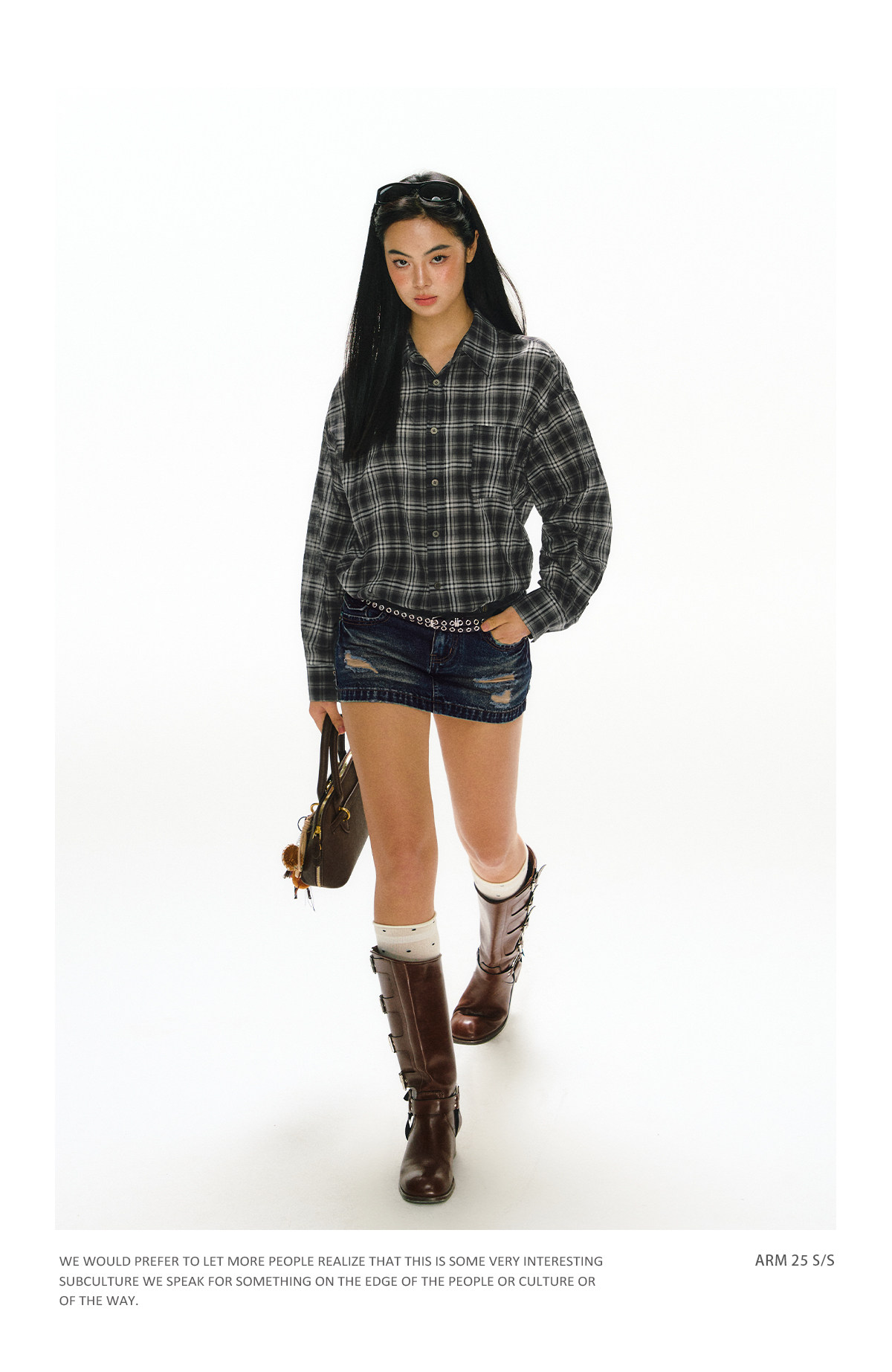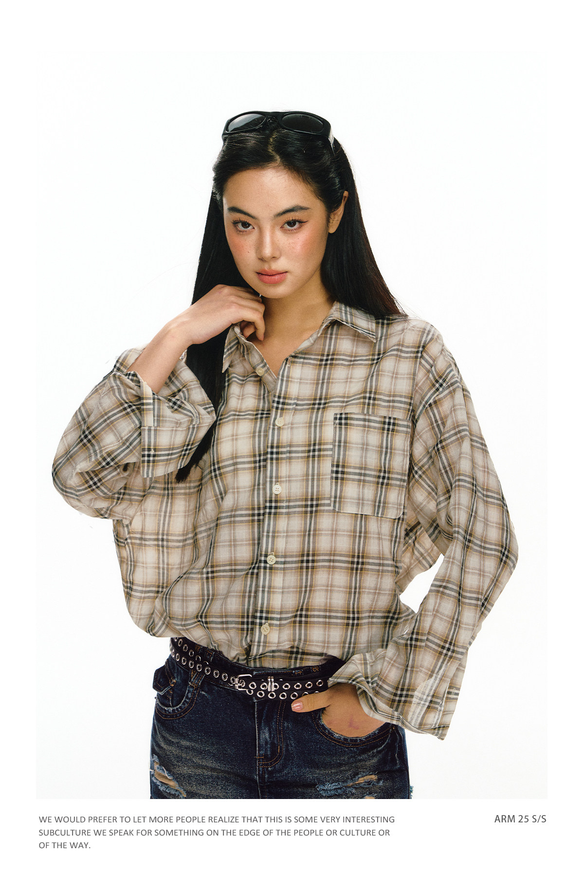 Ariseism 美式复古设计感长袖格子衬衫女秋冬新款上衣