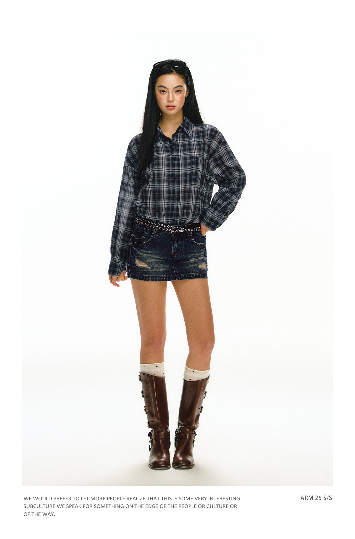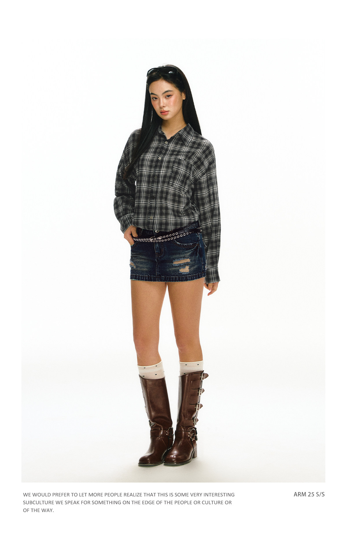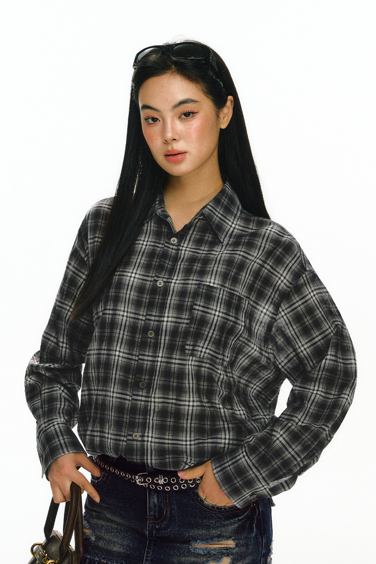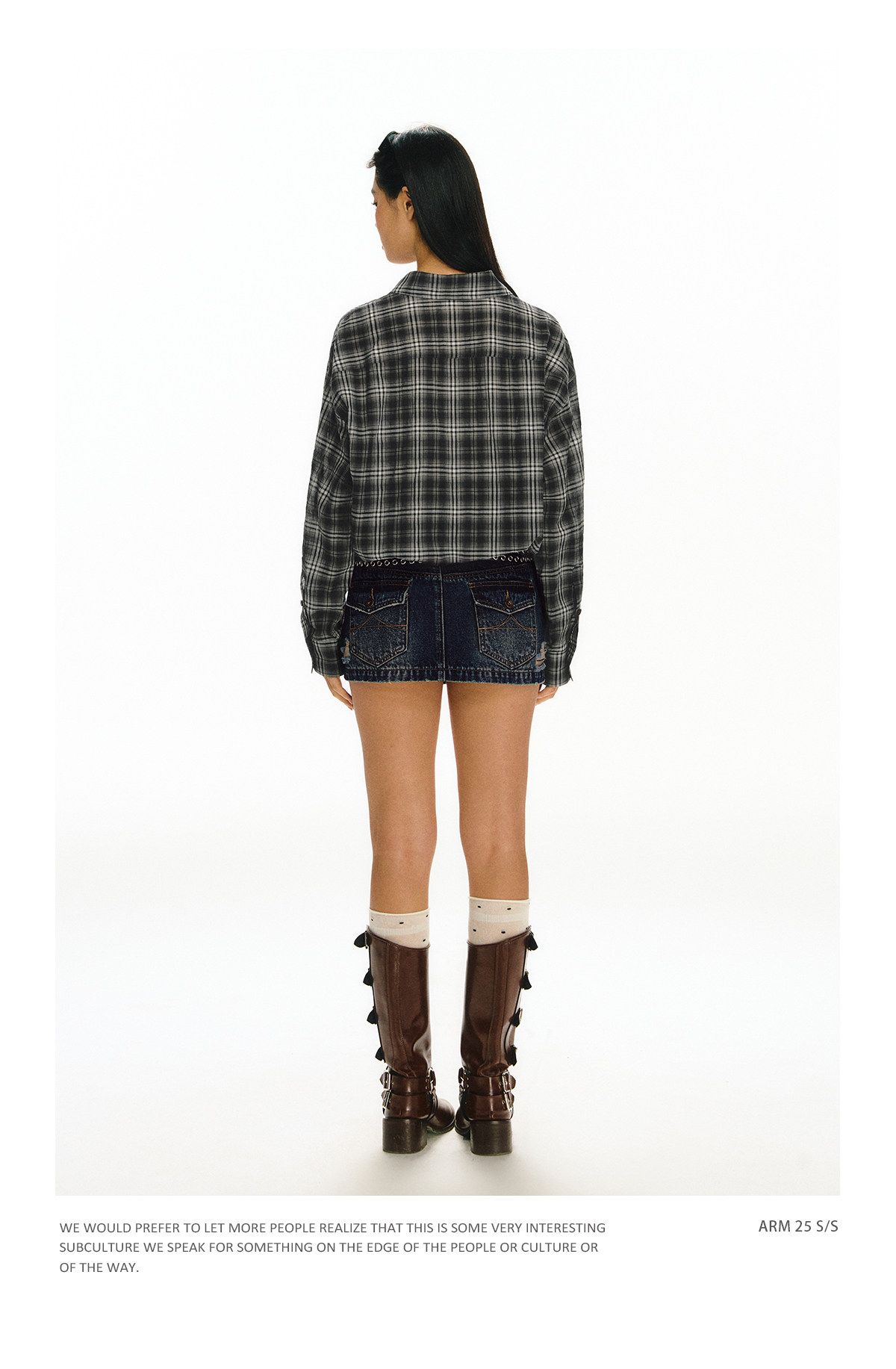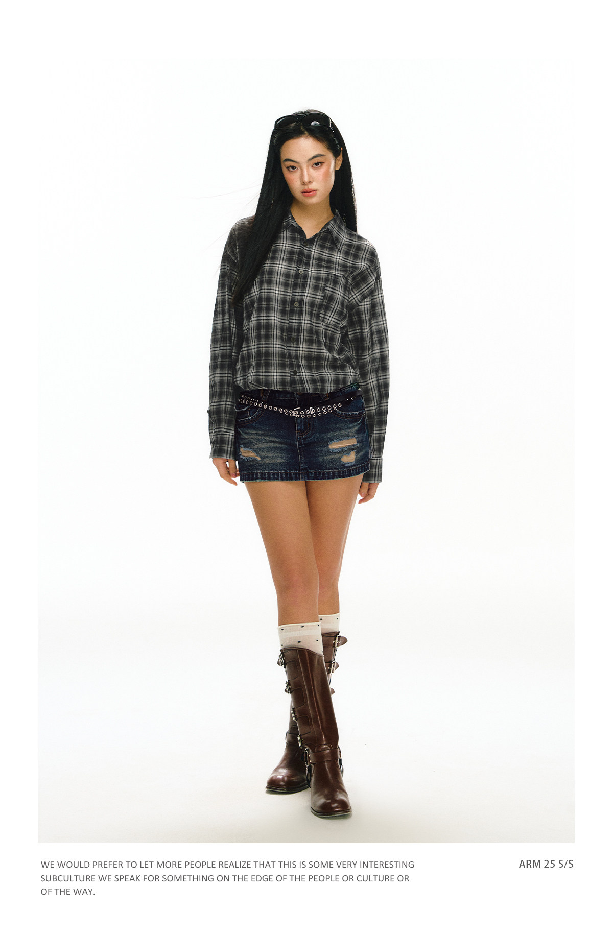 Ariseism 美式复古设计感长袖格子衬衫女秋冬新款上衣
