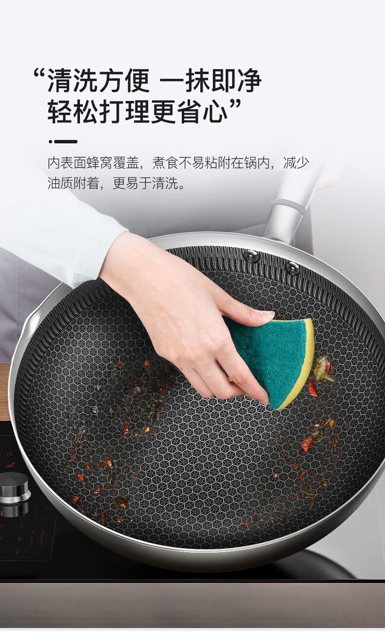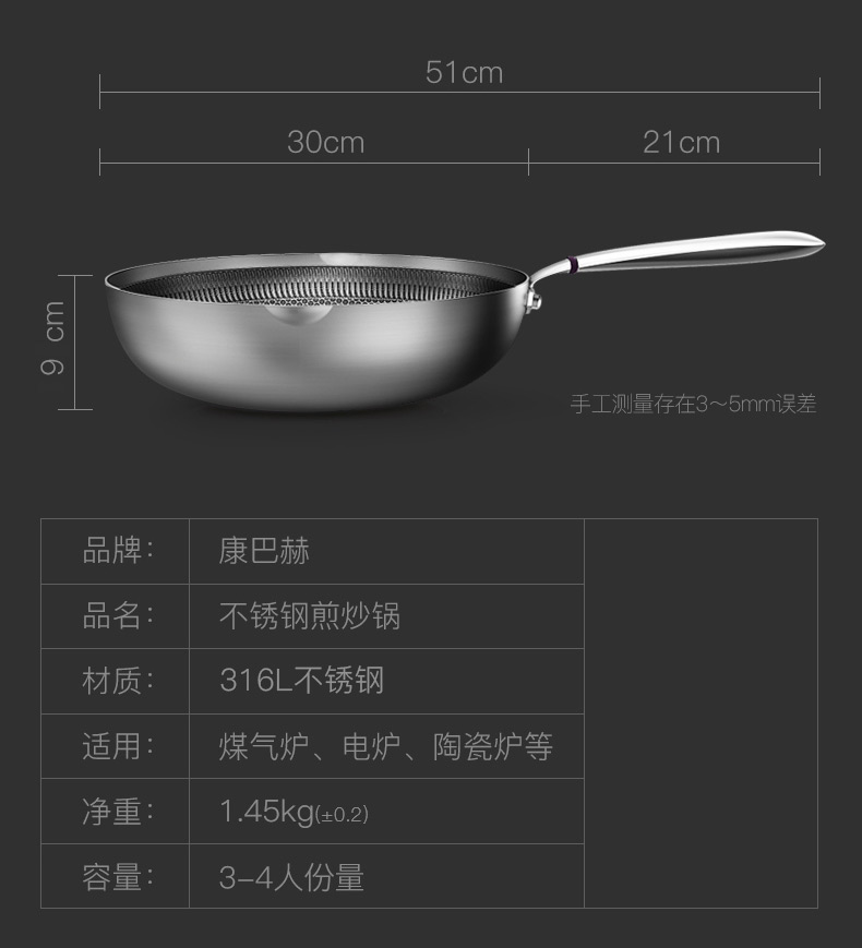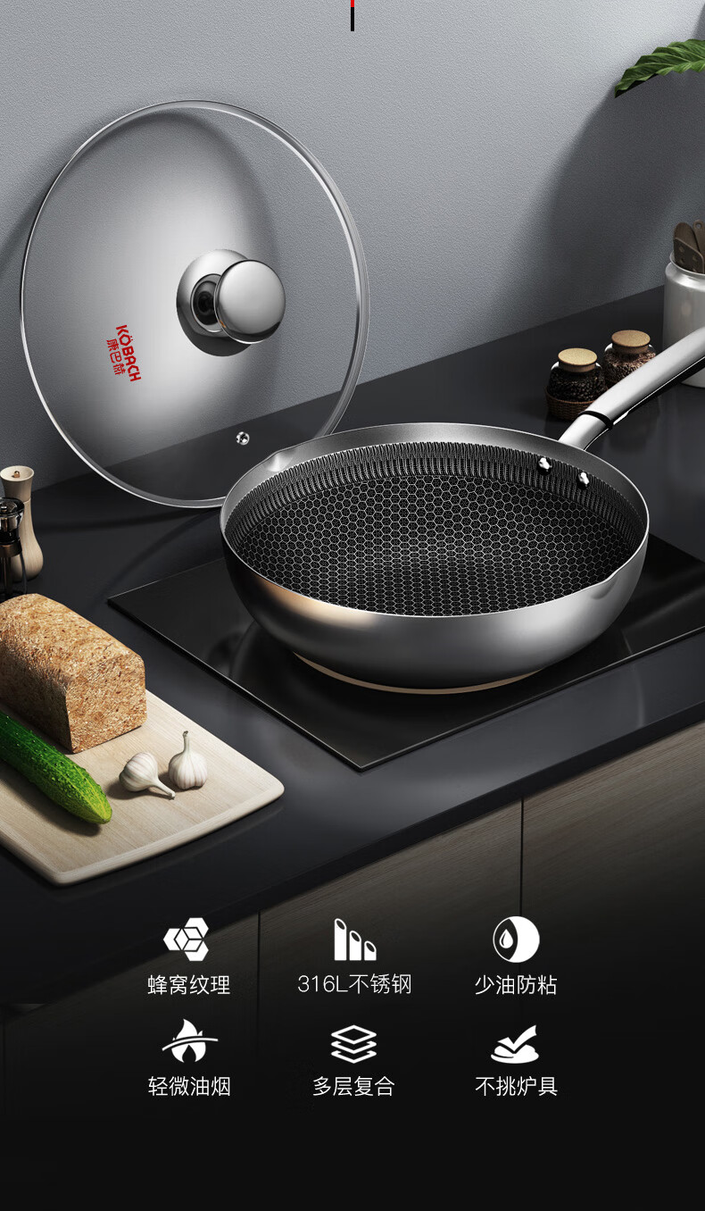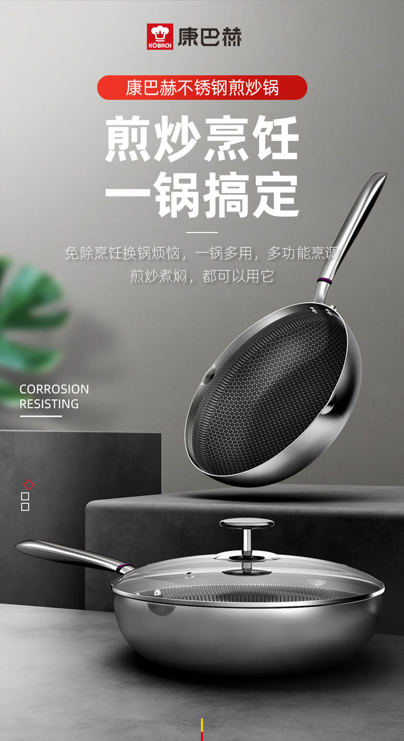 康巴赫316L不锈钢煎炒锅不粘锅30cm家用煤气灶电磁炉通用 JCG30D1