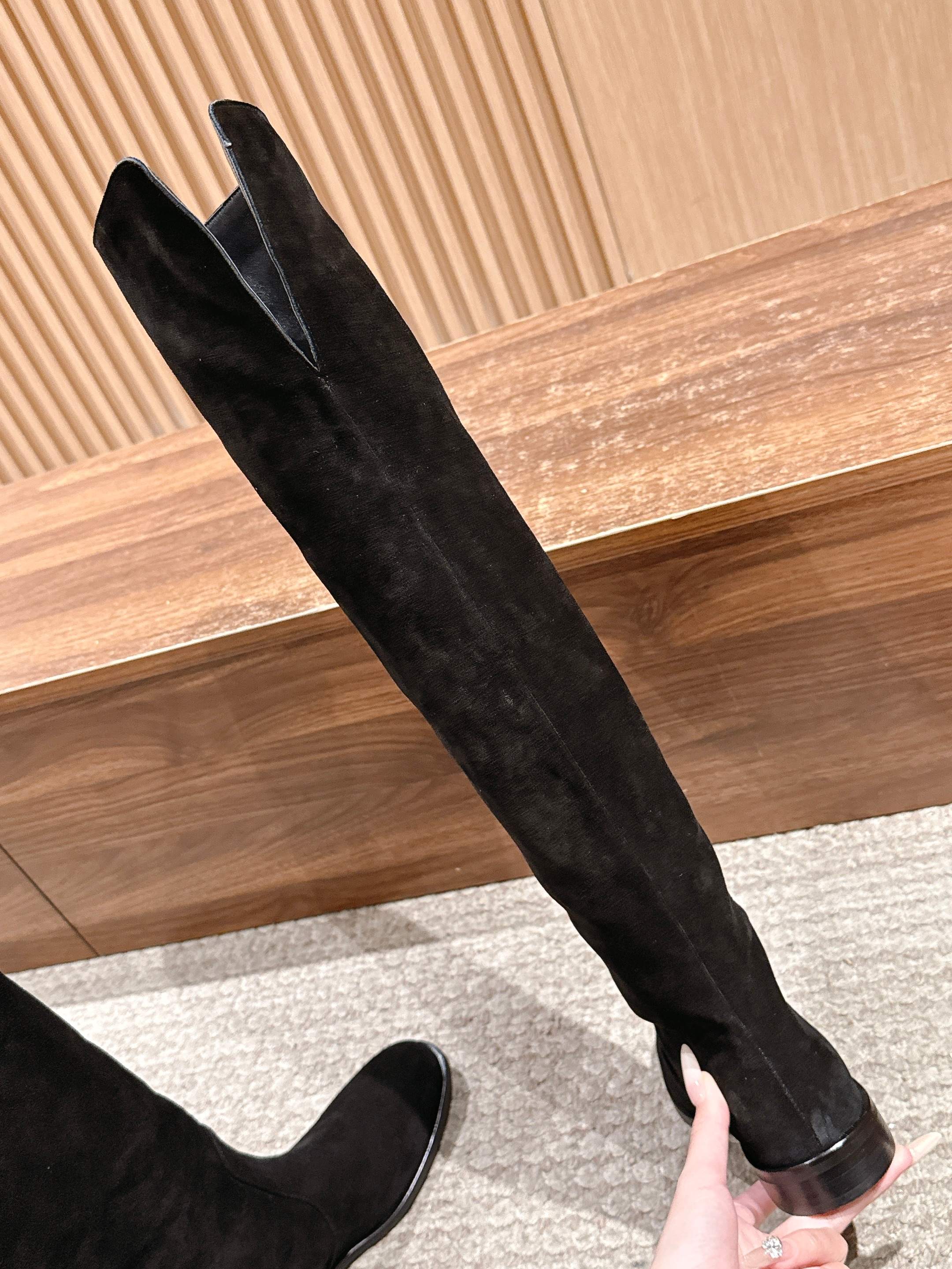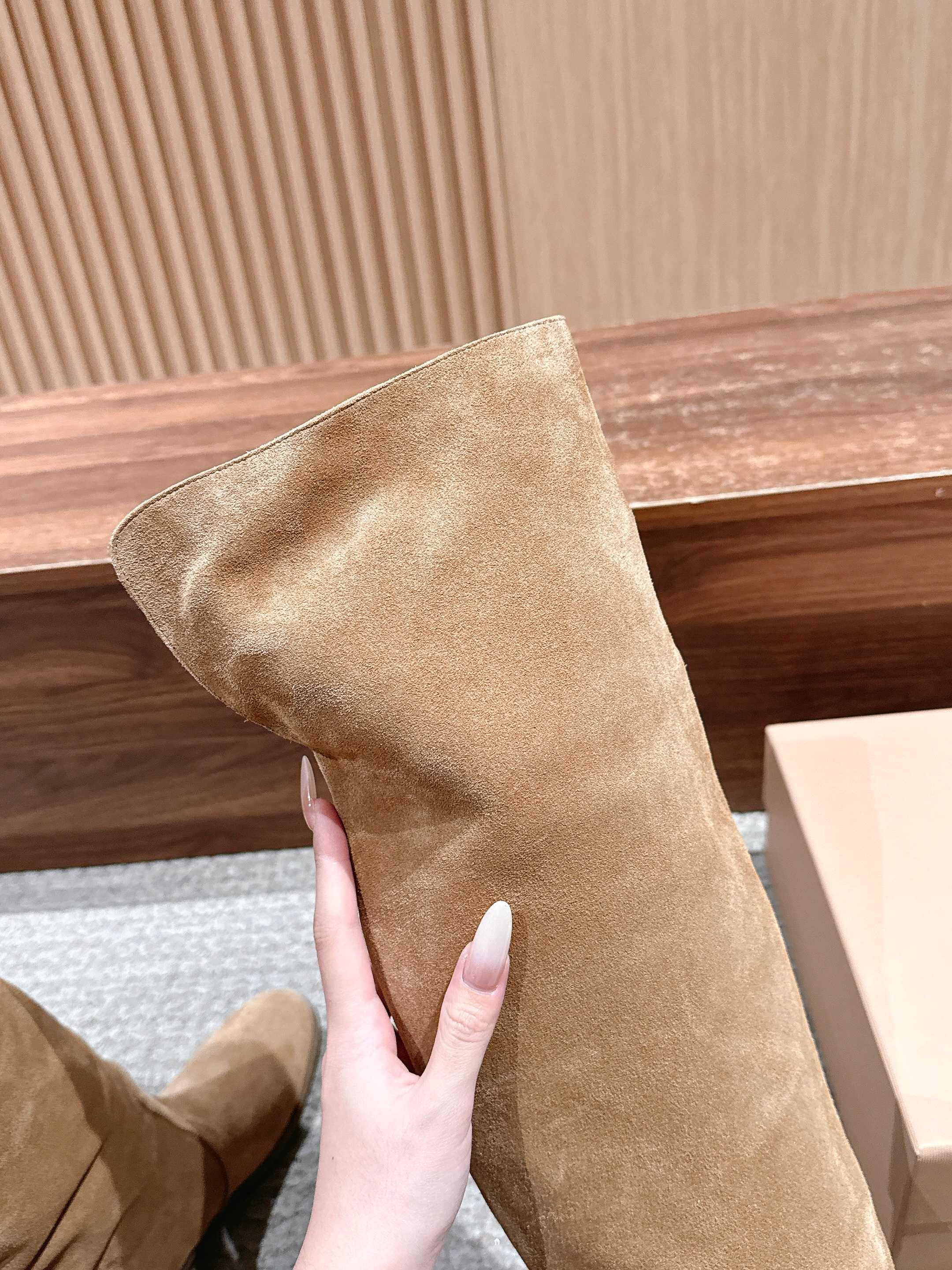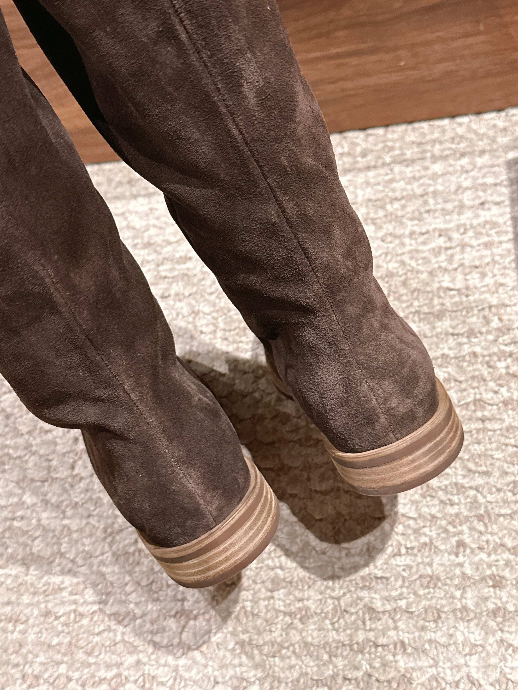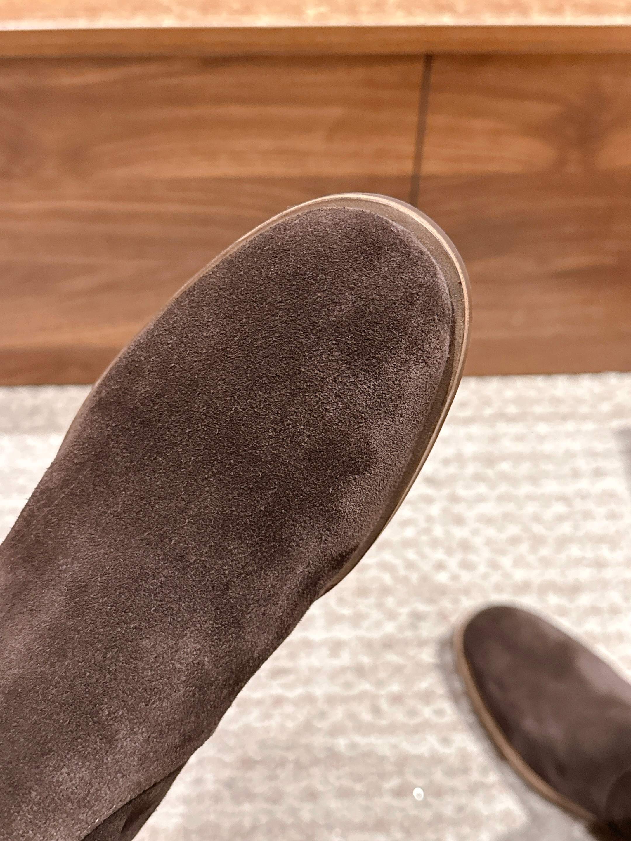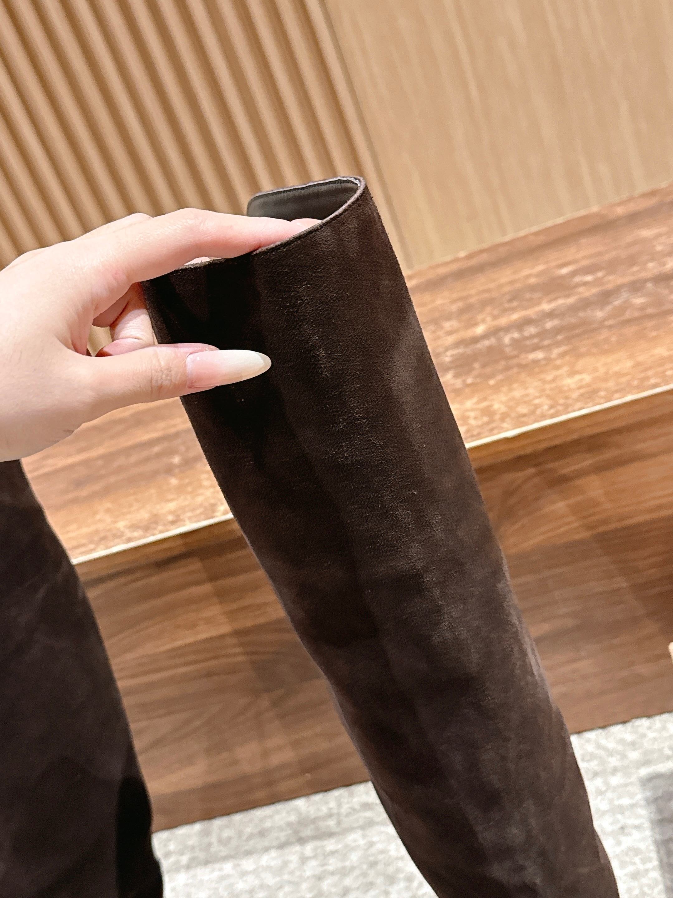 Gianvito Rossi 复古麂皮过膝长筒靴 采用绒面革材质,质感细腻,呈现出高级的哑光效果,且不同颜色的绒面革在视觉和触觉上都极具质感。高跟长靴,靴筒较高,能够很好地修饰腿部线条;鞋跟为粗跟设计,兼具稳定性与时尚感,提升气场的同时也保证了行走的舒适度。 鞋头为方头设计,简约大气,符合当下的时尚潮流,同时也能容纳不同脚型;整体设计简约利落,没有过多繁杂的装饰,凸显出经典与优雅的风格,易于搭配各种服饰,无论是裙装还是裤装都能展现出不俗的时尚品味。 鞋面:牛反绒 内里:羊皮 大底:真皮大底 增高:3cm Size:35-40码(40订做不退换)