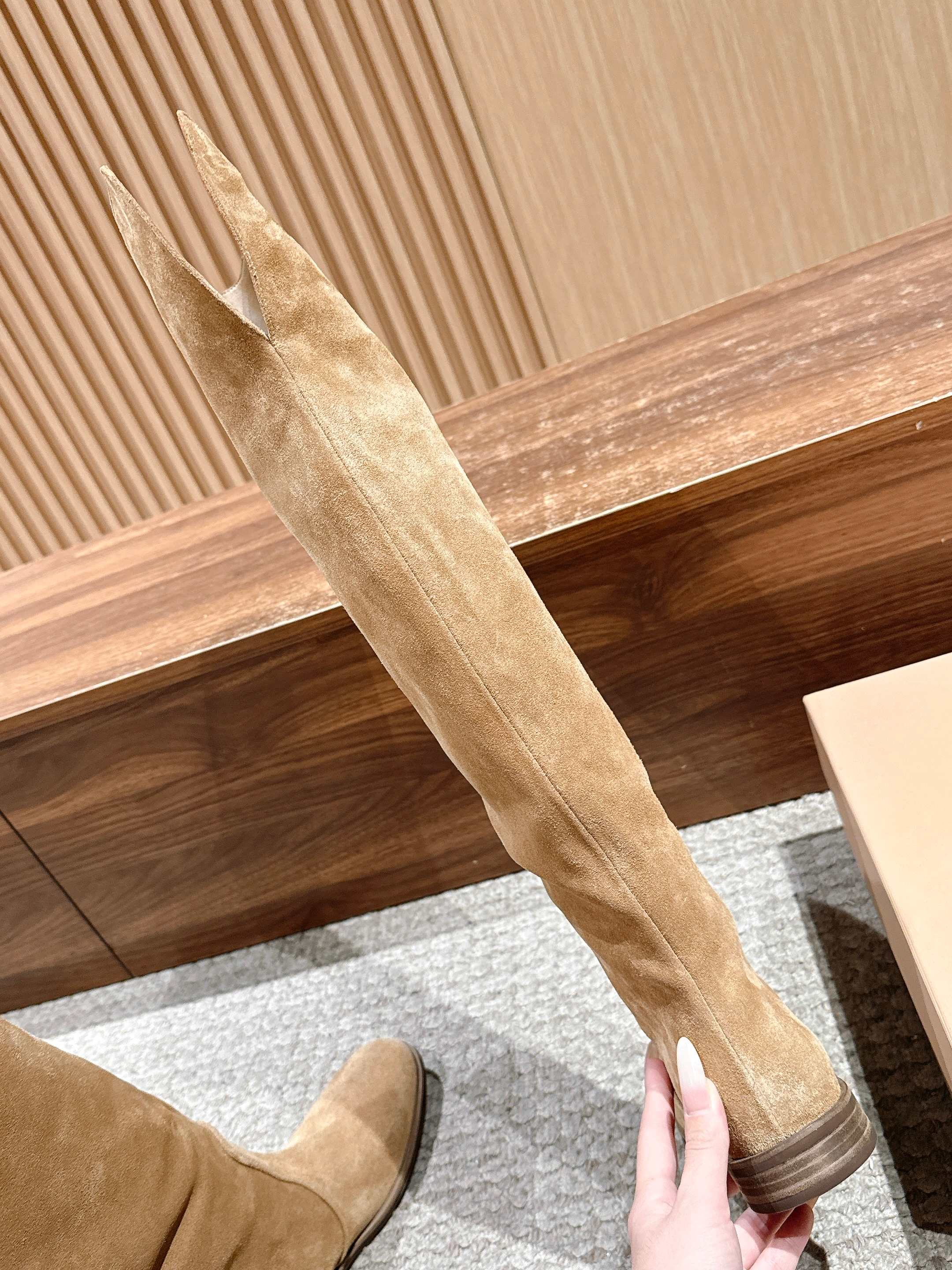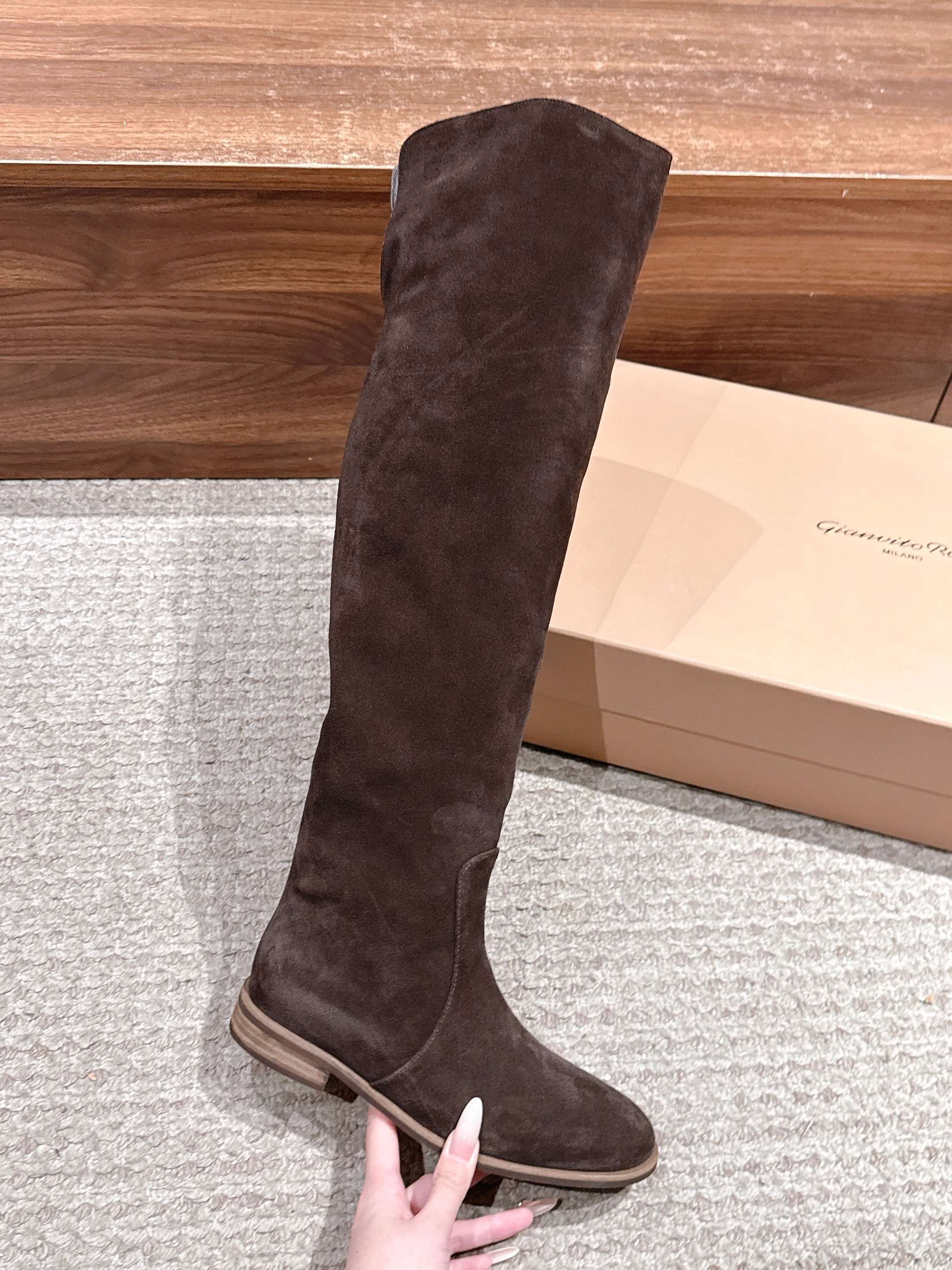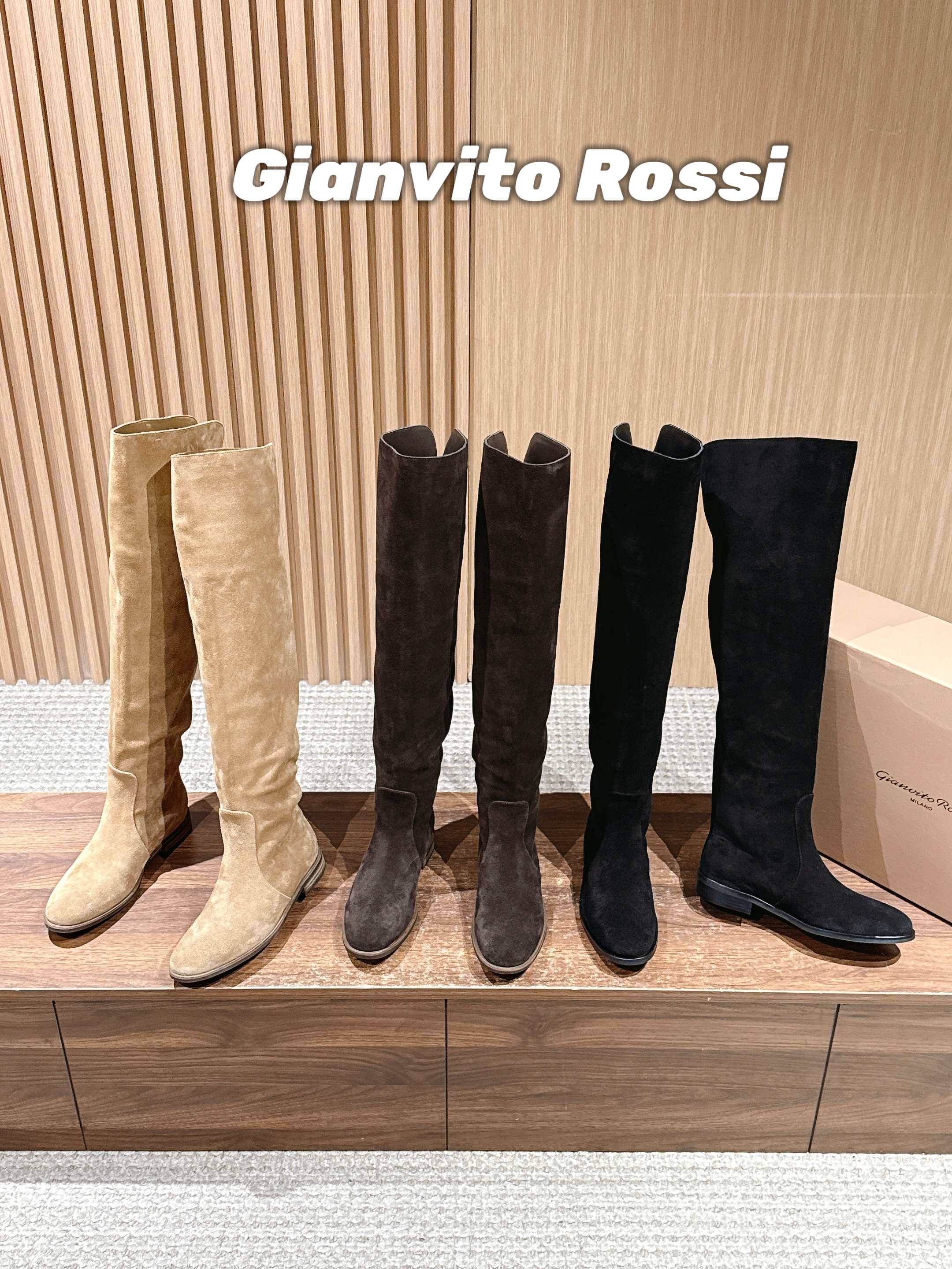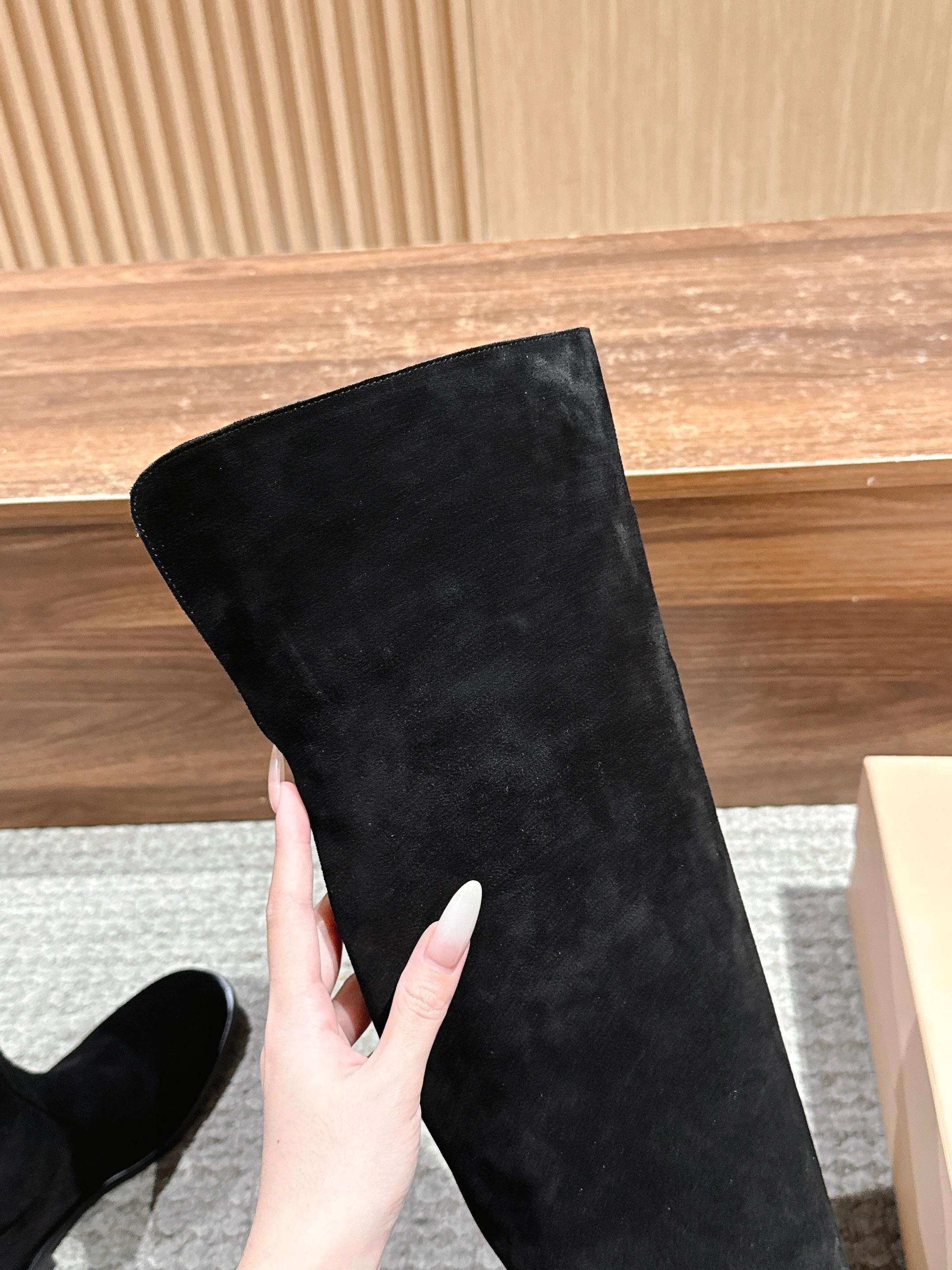 Gianvito Rossi 复古麂皮过膝长筒靴 采用绒面革材质,质感细腻,呈现出高级的哑光效果,且不同颜色的绒面革在视觉和触觉上都极具质感。高跟长靴,靴筒较高,能够很好地修饰腿部线条;鞋跟为粗跟设计,兼具稳定性与时尚感,提升气场的同时也保证了行走的舒适度。 鞋头为方头设计,简约大气,符合当下的时尚潮流,同时也能容纳不同脚型;整体设计简约利落,没有过多繁杂的装饰,凸显出经典与优雅的风格,易于搭配各种服饰,无论是裙装还是裤装都能展现出不俗的时尚品味。 鞋面:牛反绒 内里:羊皮 大底:真皮大底 增高:3cm Size:35-40码(40订做不退换)