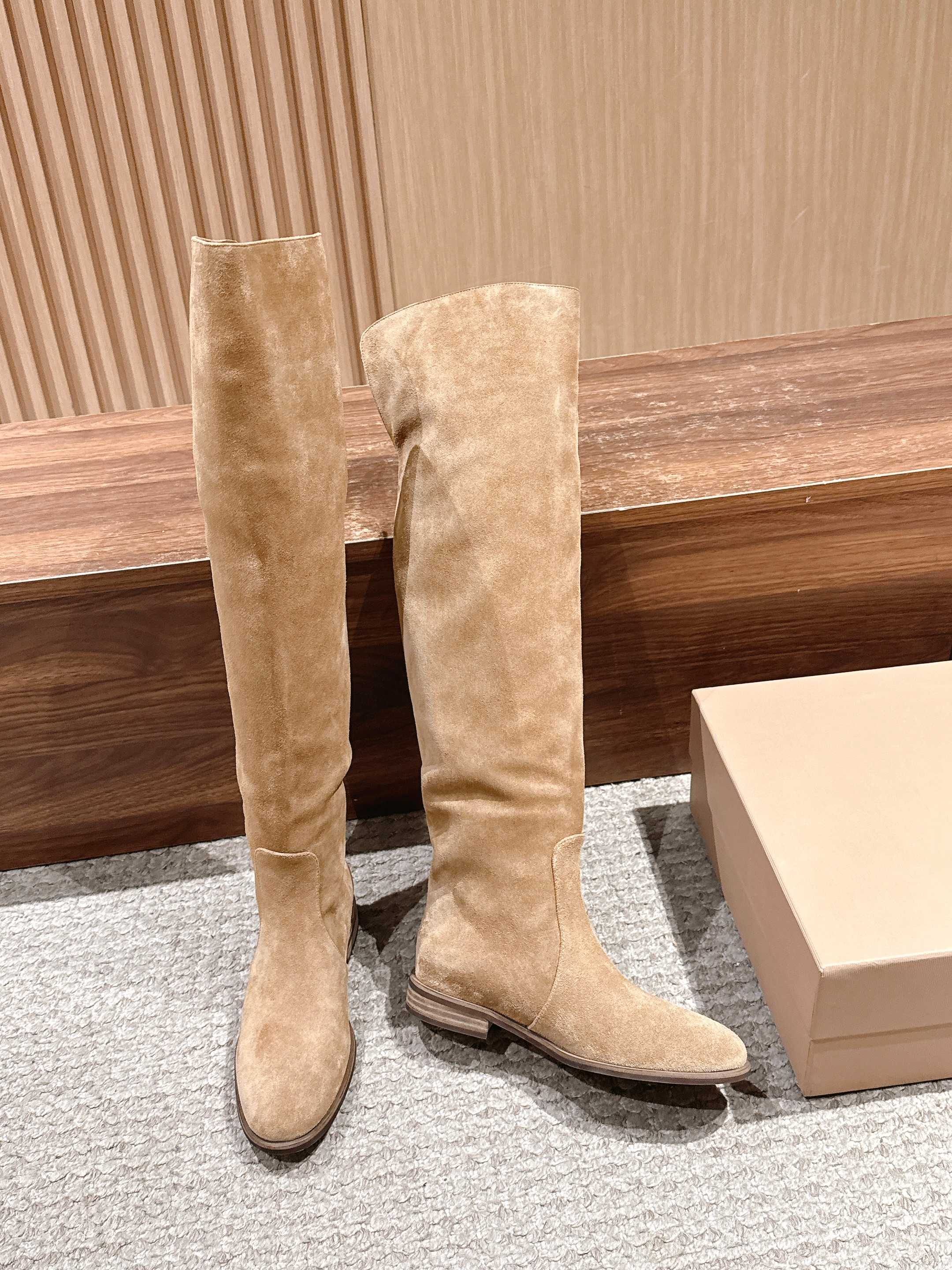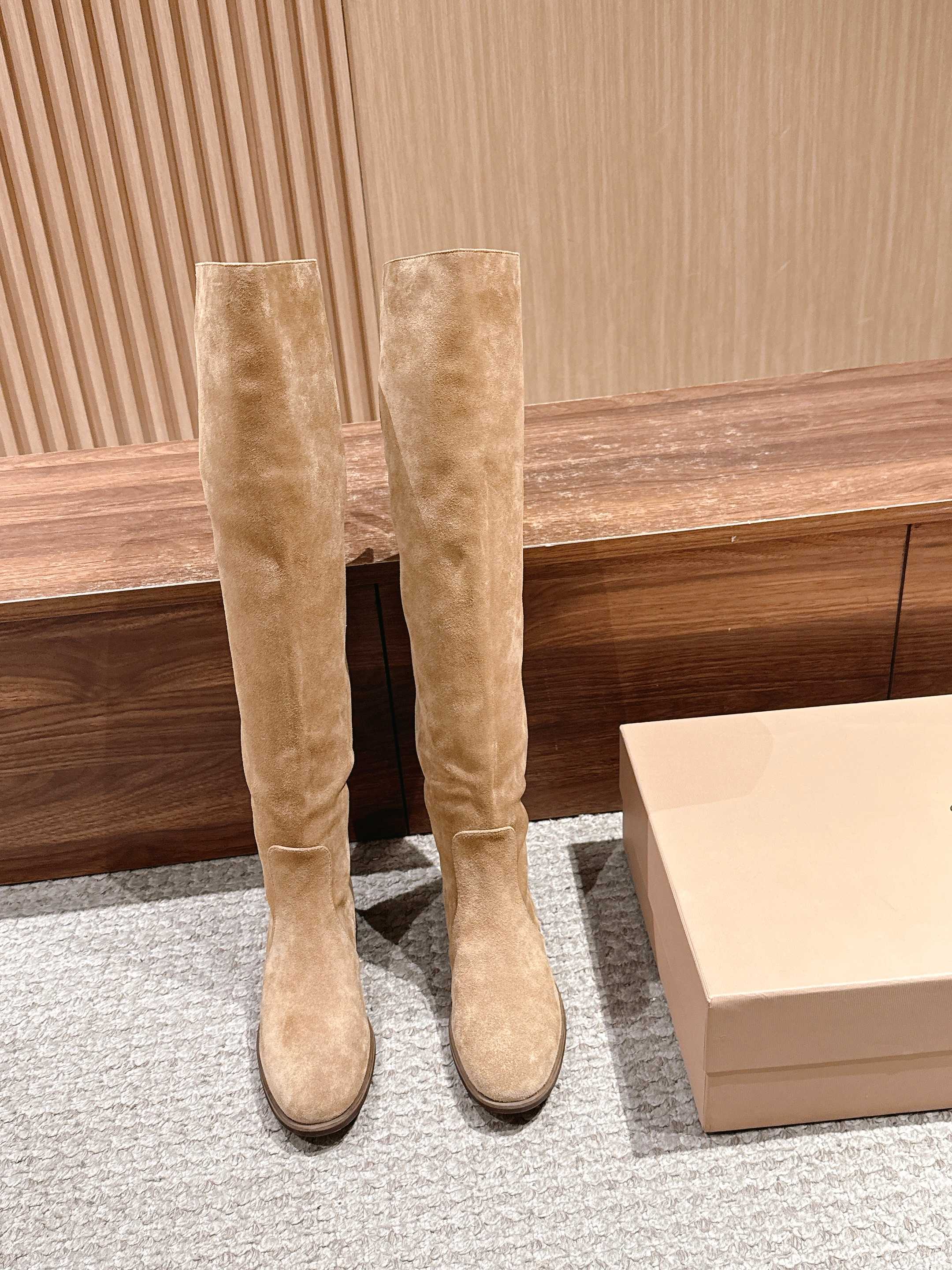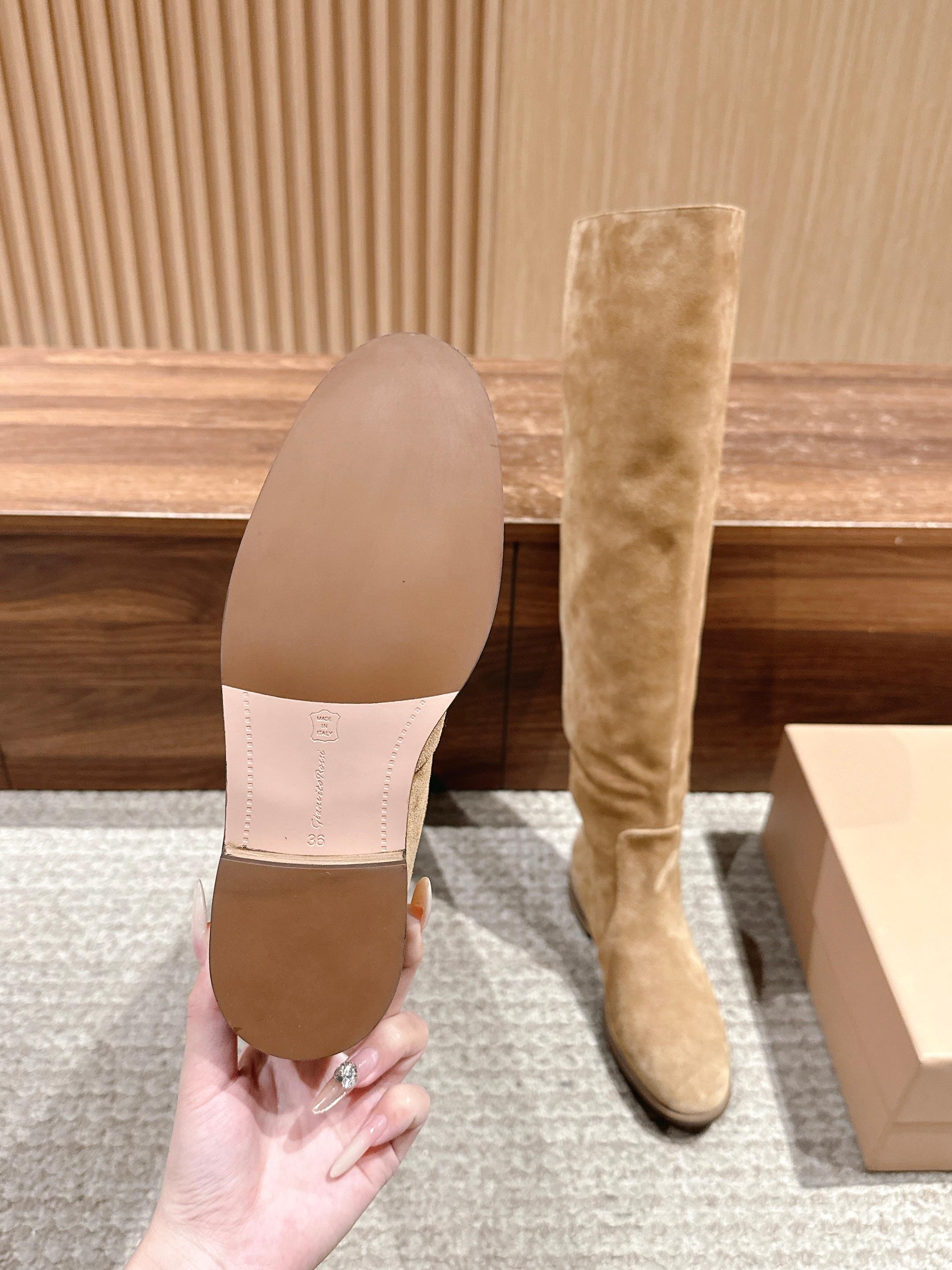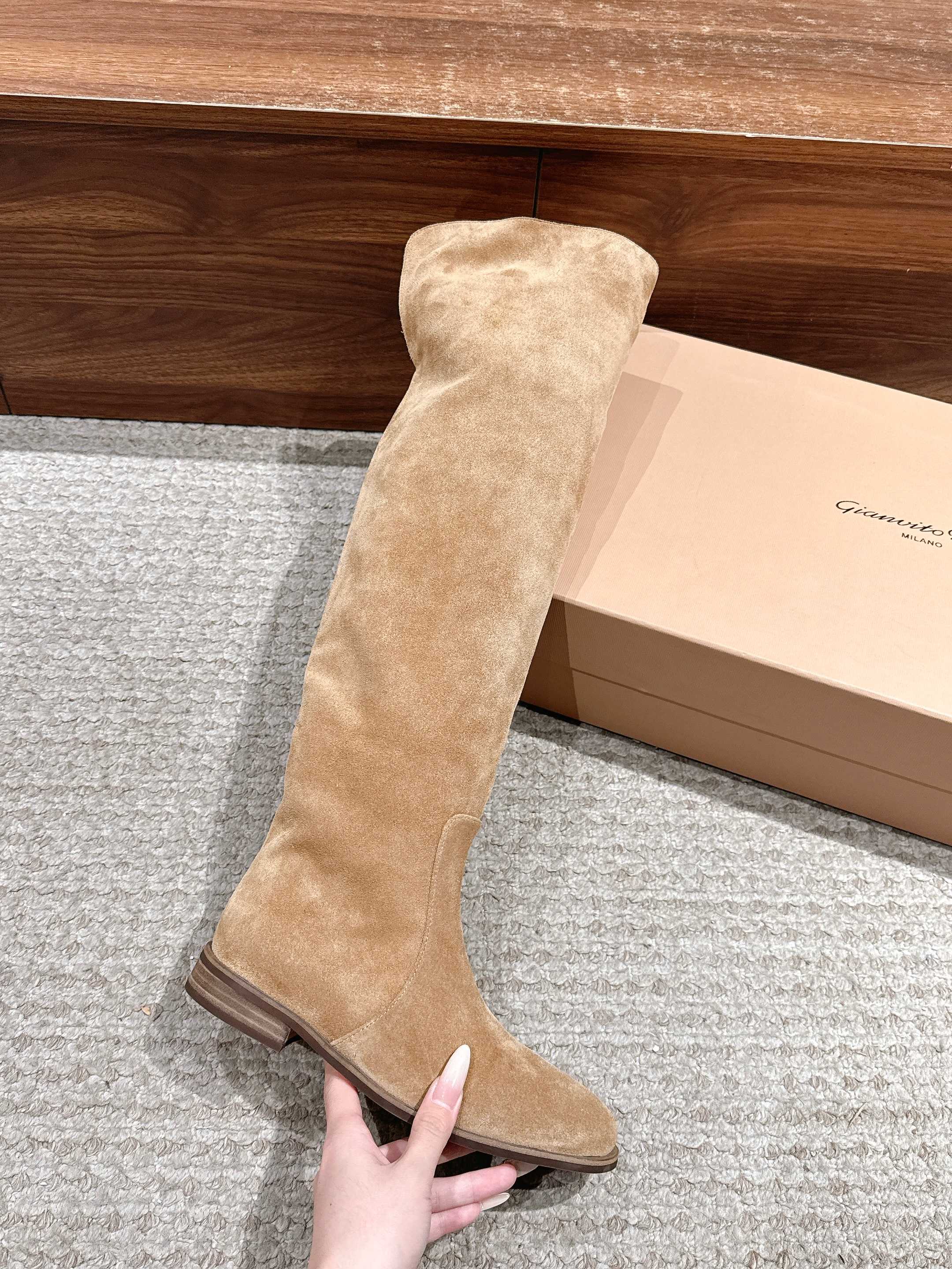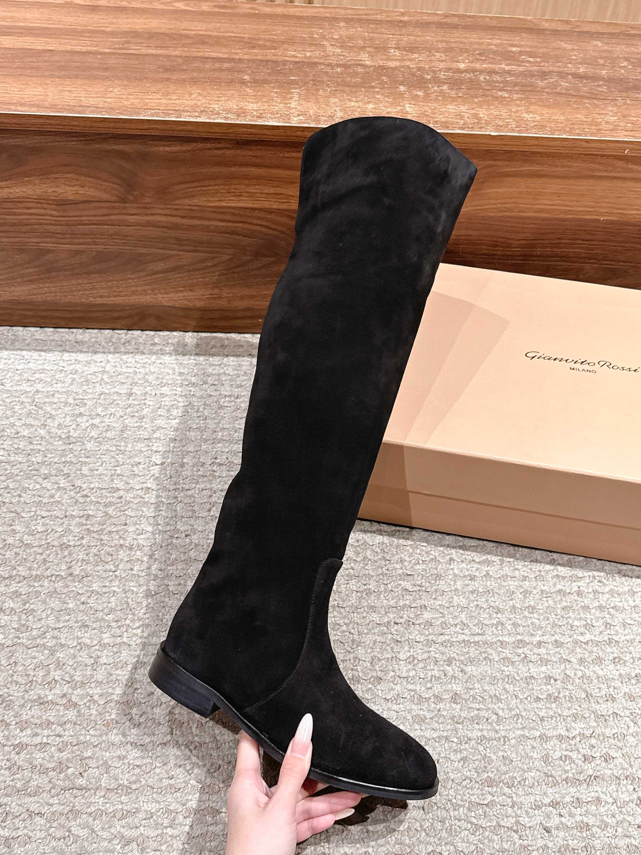 Gianvito Rossi 复古麂皮过膝长筒靴 采用绒面革材质,质感细腻,呈现出高级的哑光效果,且不同颜色的绒面革在视觉和触觉上都极具质感。高跟长靴,靴筒较高,能够很好地修饰腿部线条;鞋跟为粗跟设计,兼具稳定性与时尚感,提升气场的同时也保证了行走的舒适度。 鞋头为方头设计,简约大气,符合当下的时尚潮流,同时也能容纳不同脚型;整体设计简约利落,没有过多繁杂的装饰,凸显出经典与优雅的风格,易于搭配各种服饰,无论是裙装还是裤装都能展现出不俗的时尚品味。 鞋面:牛反绒 内里:羊皮 大底:真皮大底 增高:3cm Size:35-40码(40订做不退换)