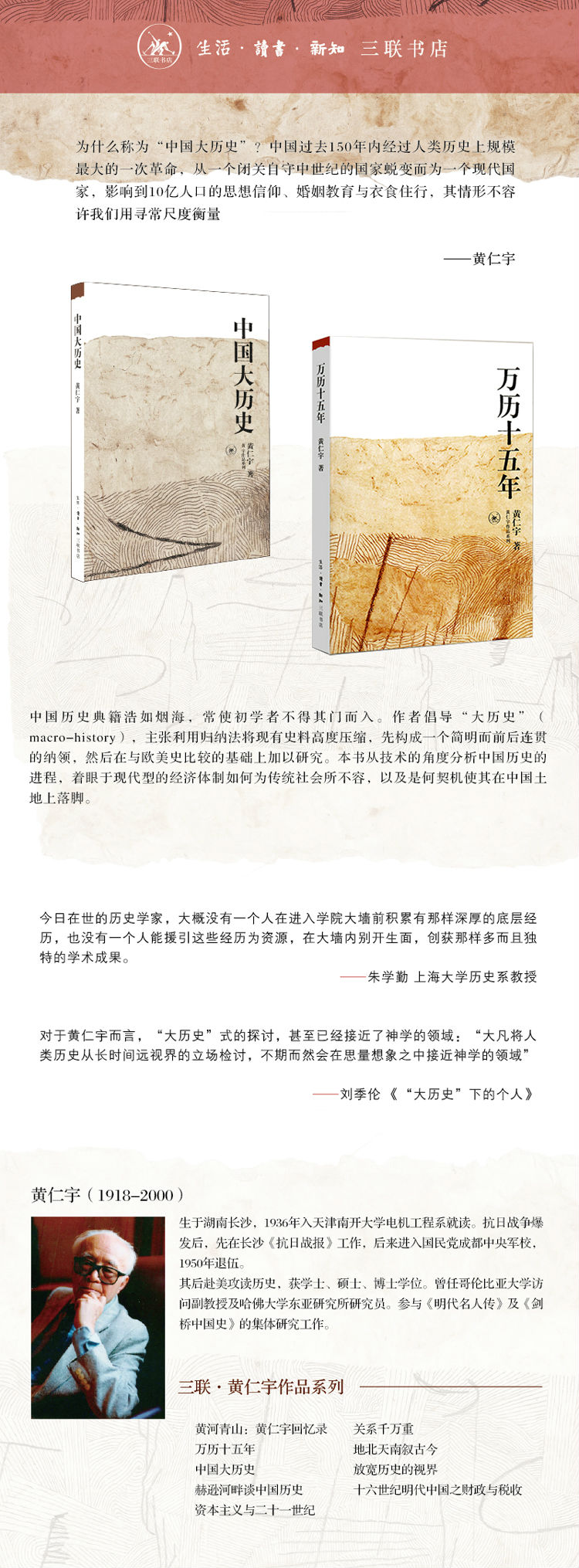 黄仁宇(1918-2000),生于湖南长沙,1936年入天津南开大学电机工程系就读。抗日战争爆发后,先在长沙《抗日战报》工作,后来进入国民党成都中央军校,1950年退伍。 其后赴美攻读历史,获学士(1954)、硕士(1957)、博士(1964)学位。曾任哥伦比亚大学访问副教授(1967)及哈佛大学东亚研究所研究员(1970)。参与《明代名人传》及《剑桥中国史》的集体研究工作。