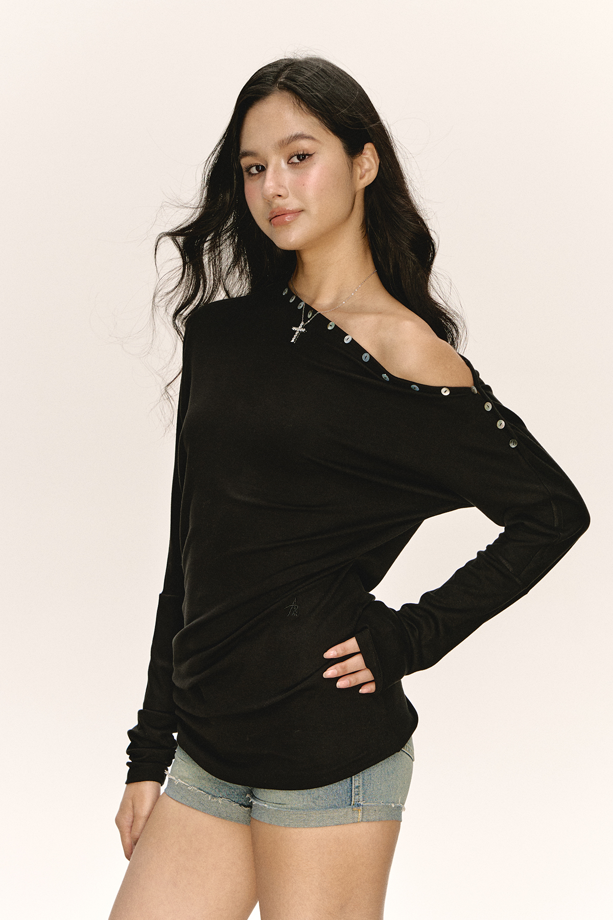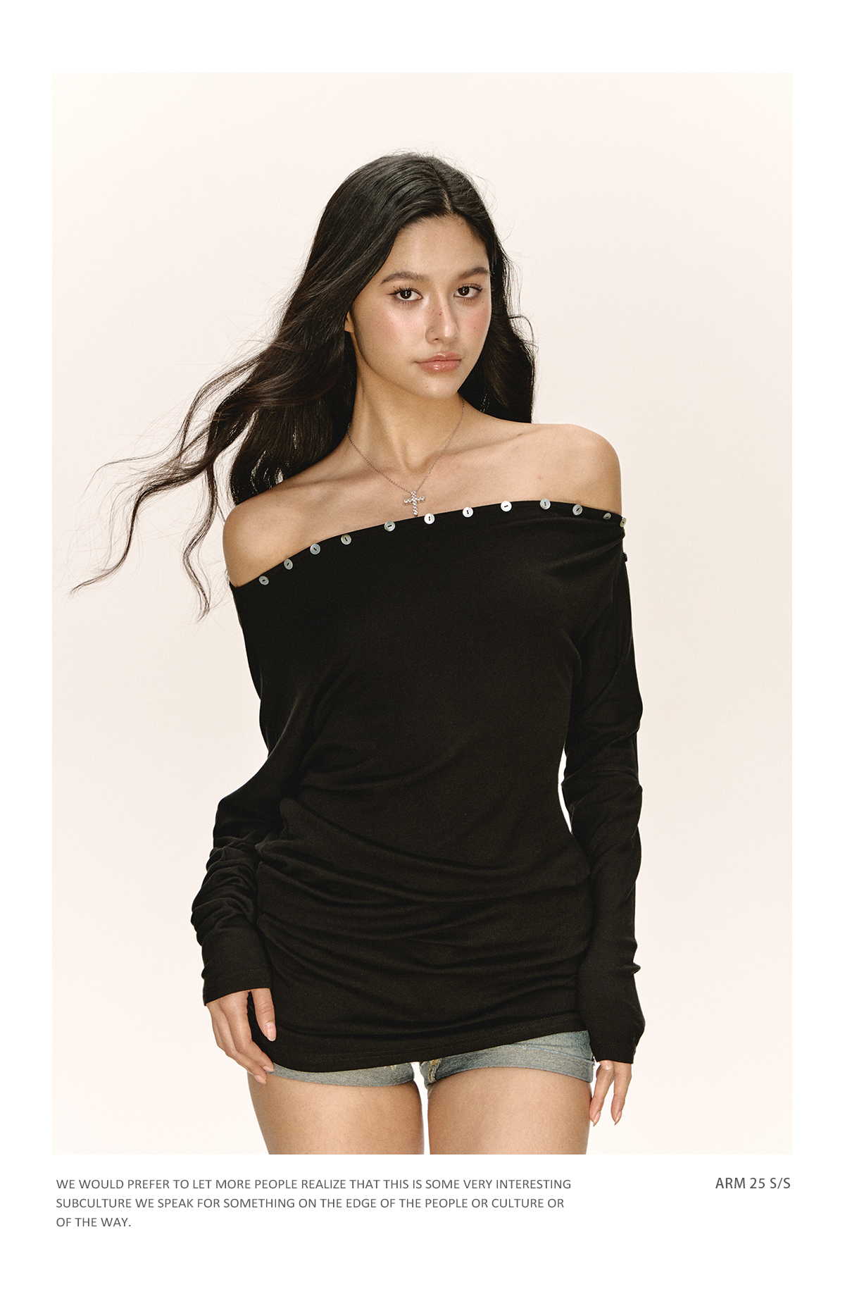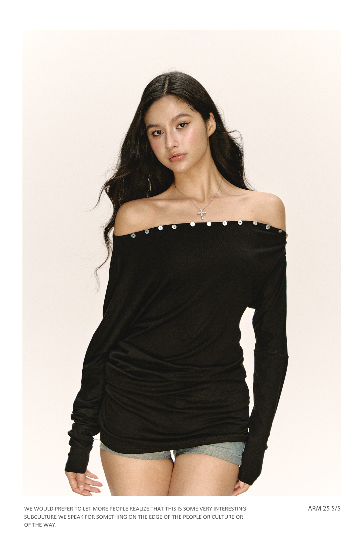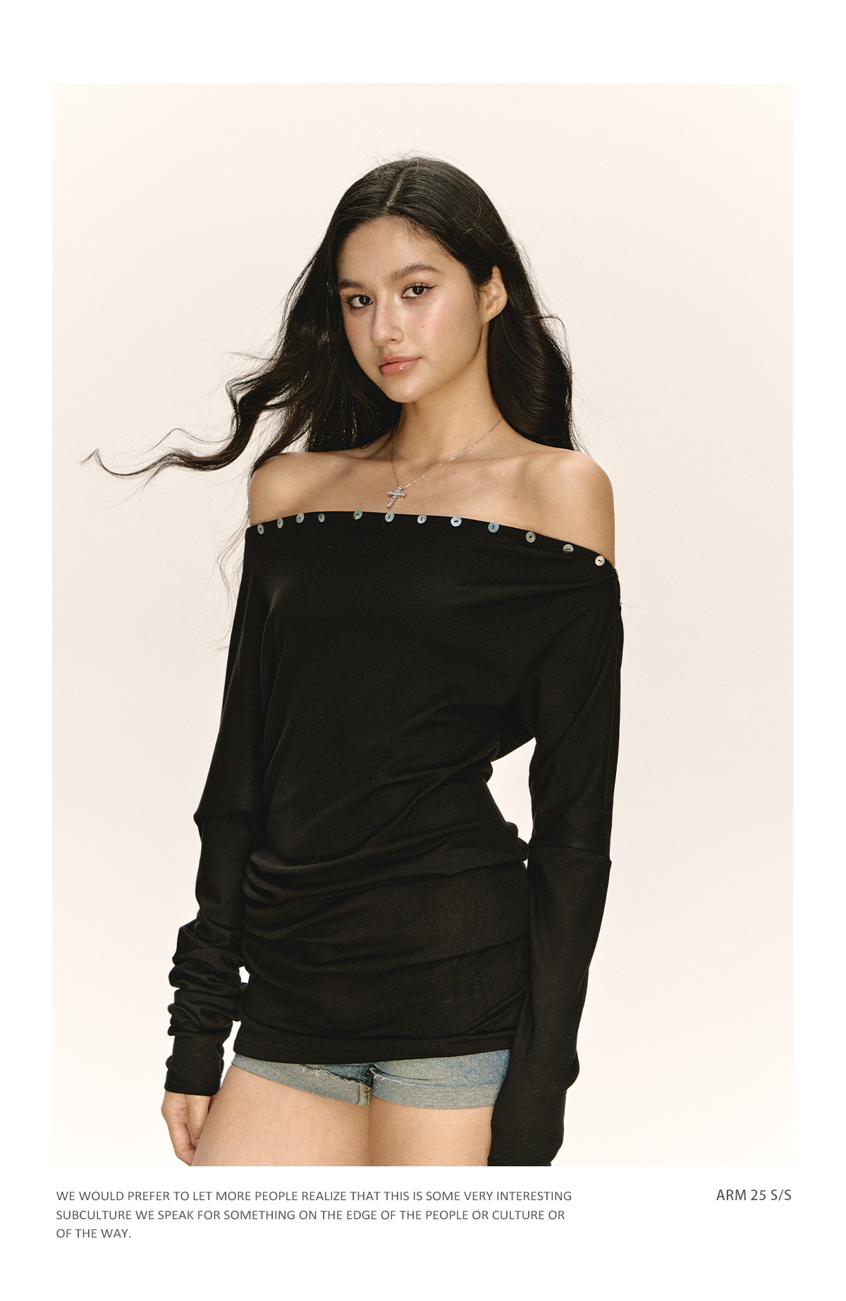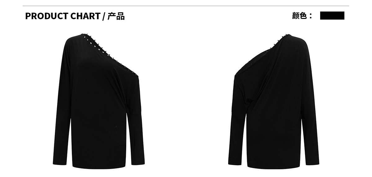 Ariseism 美式复古设计感黑色一字肩长袖t恤女秋季新款修身上衣