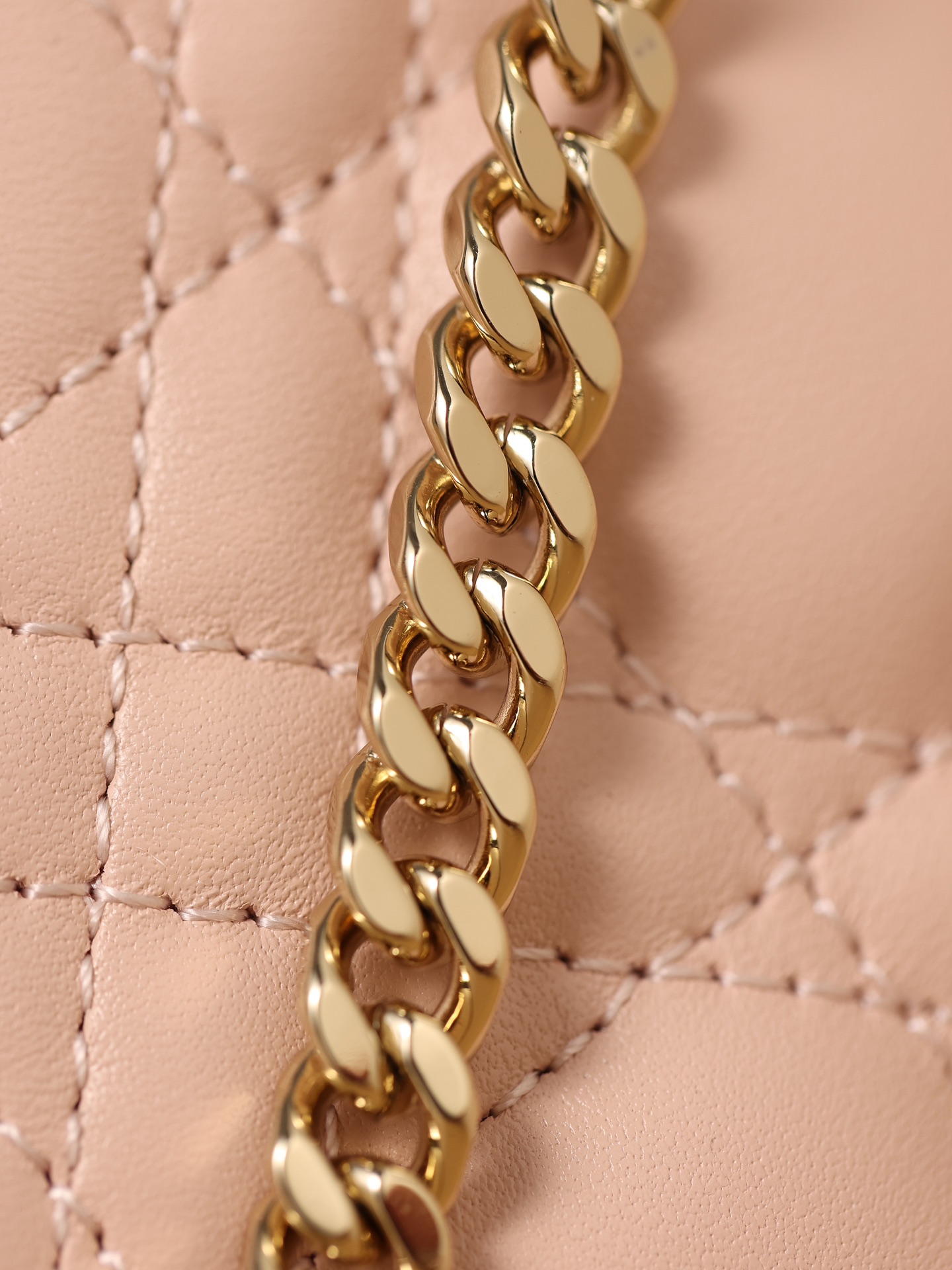 采用粉羊皮革精心制作,以藤格纹缉面线打造醒目的绗缝细节,高雅经典的设计经久不衰。