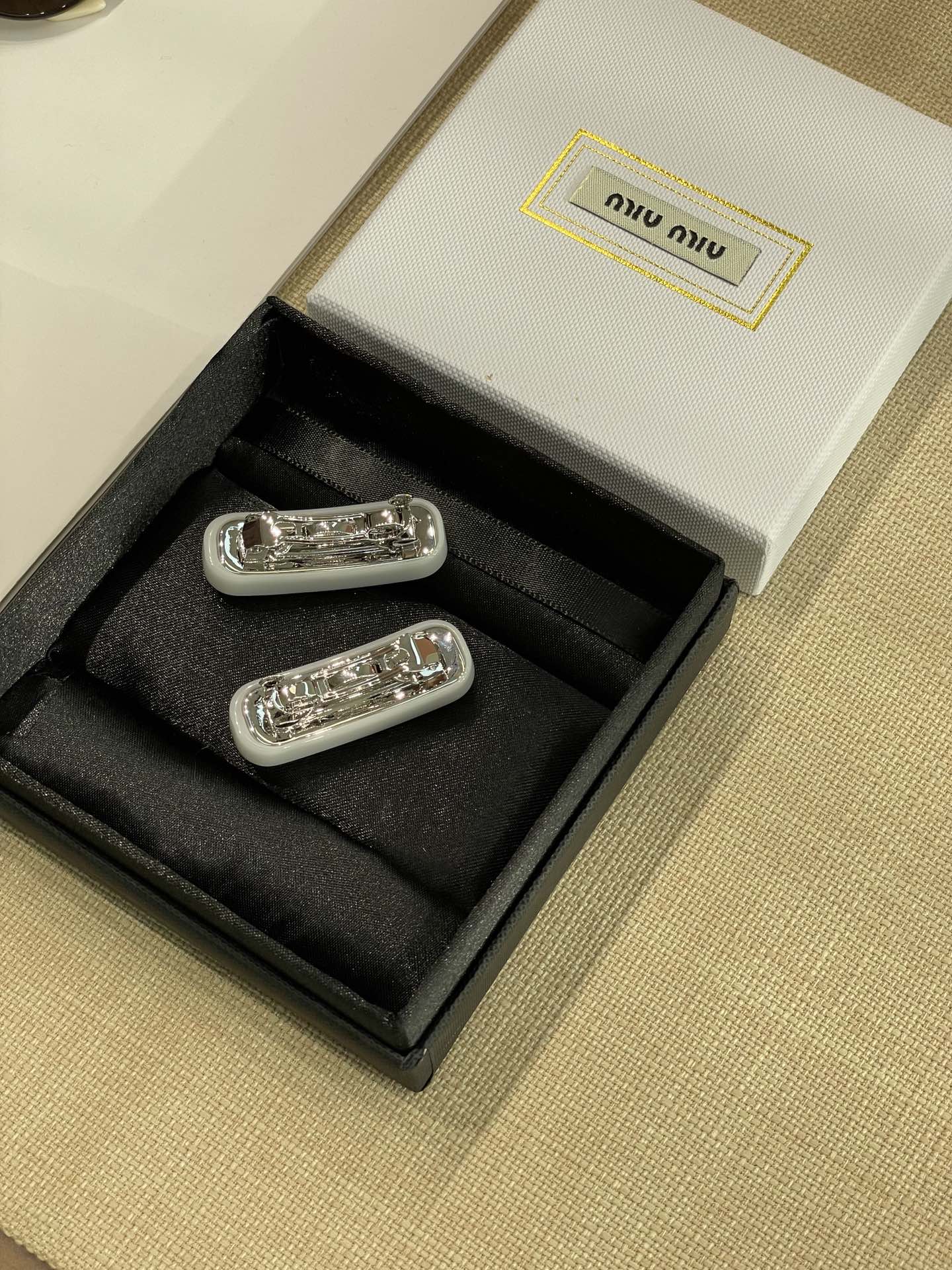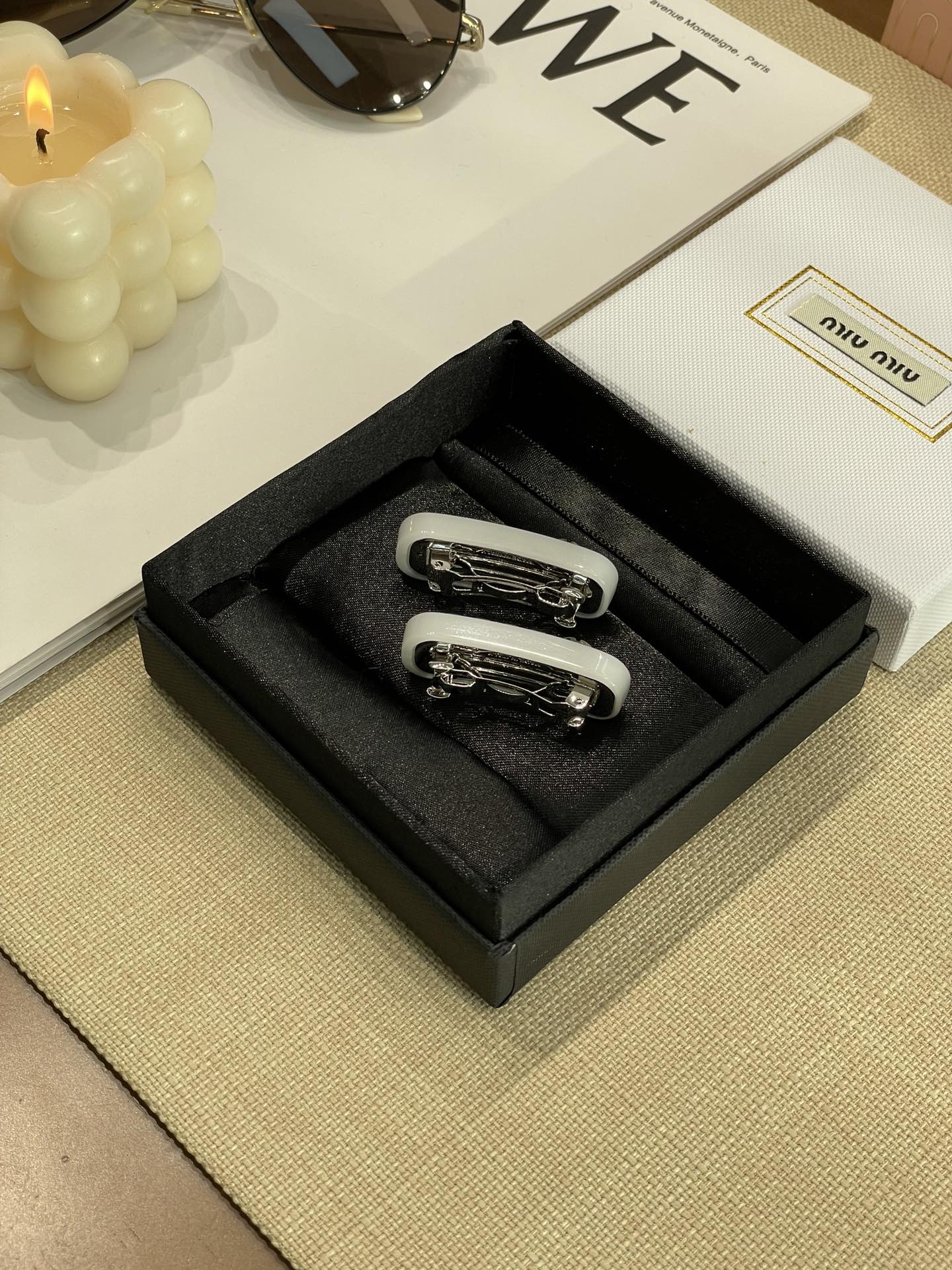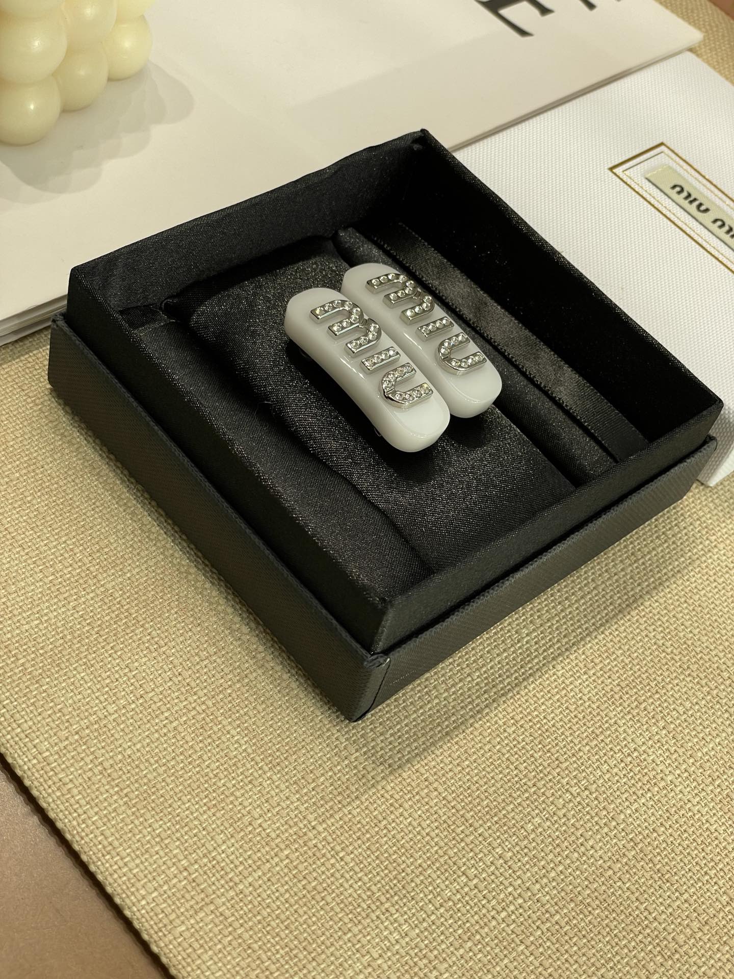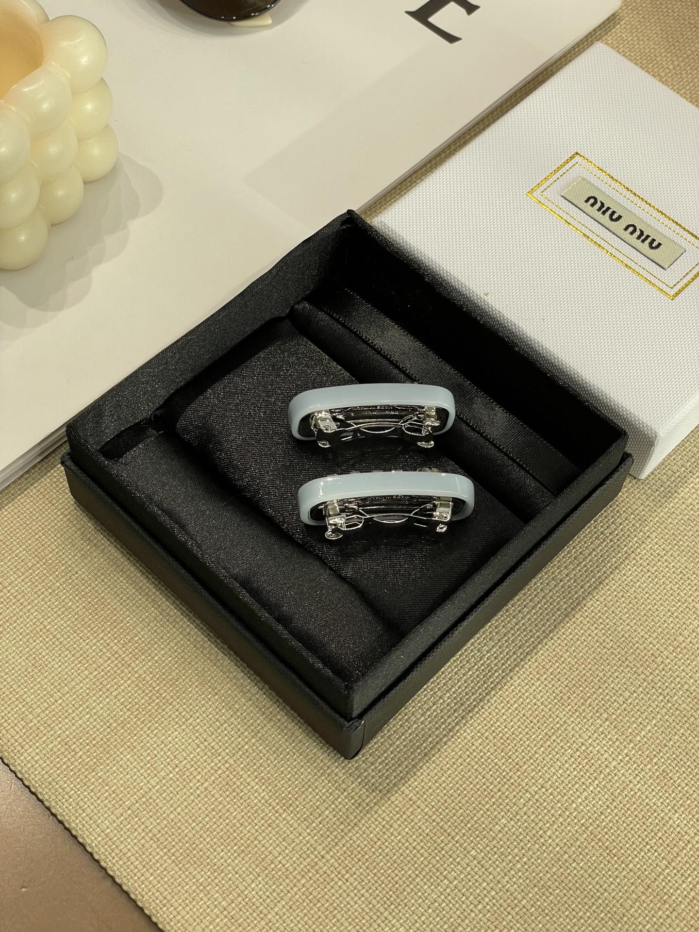 发夹的通体采用黄铜电镀白金工艺、特定树脂玻璃材质、施华洛世奇水晶,有花瓣粉、星际蓝、玳瑁色 白色 ,树脂玻璃材质,1枚发夹使用了24颗施华洛水晶,弥漫精致魅力,MIU字母镶嵌水晶,别致设计,唤起一抹优雅璀璨风情,这个冰淇淋色系很有存在感,每个颜色都有不同的气质和心情,嫩嫩的颜色甜美miu系女孩get,刘海尴尬期神器!!