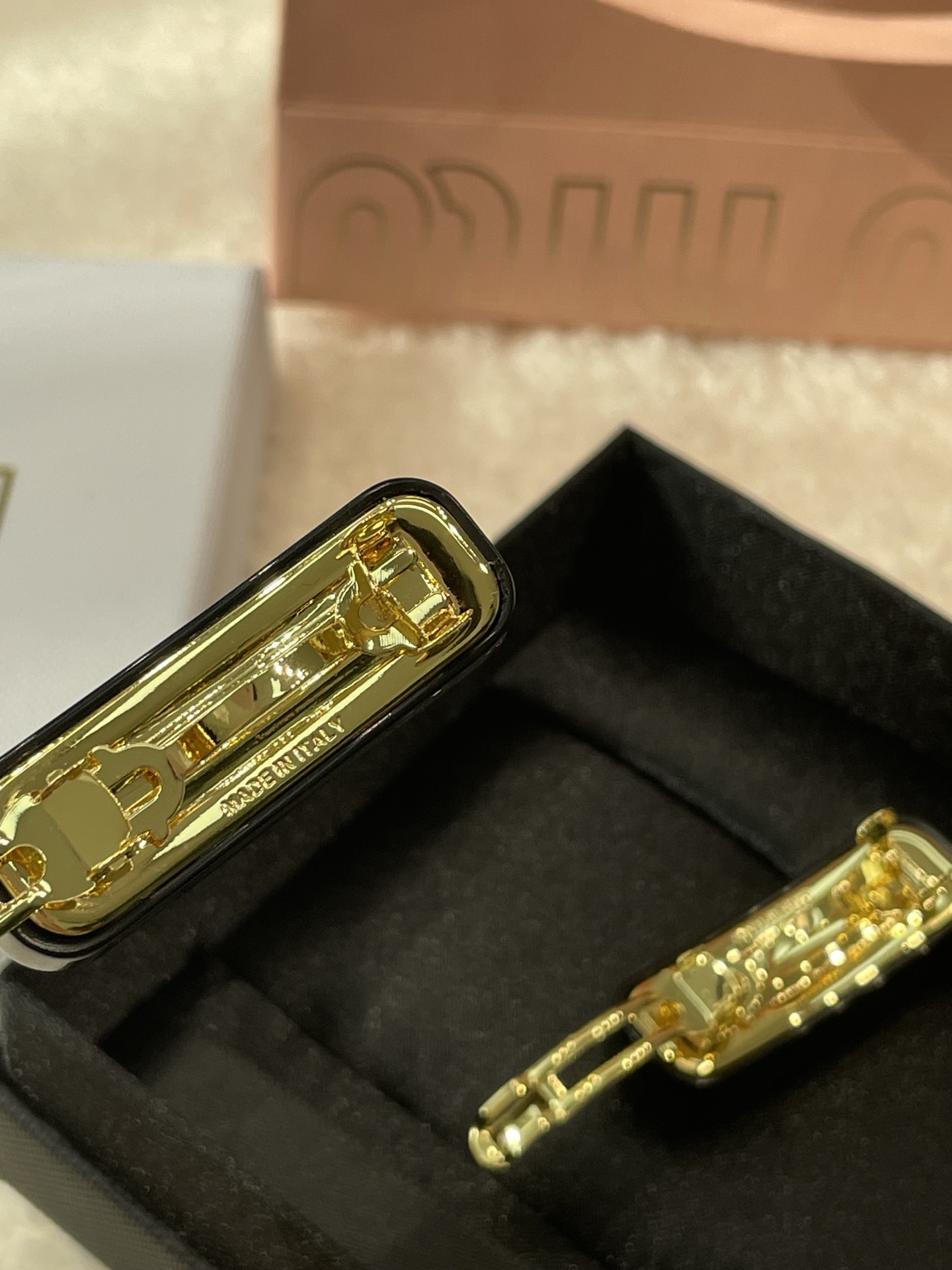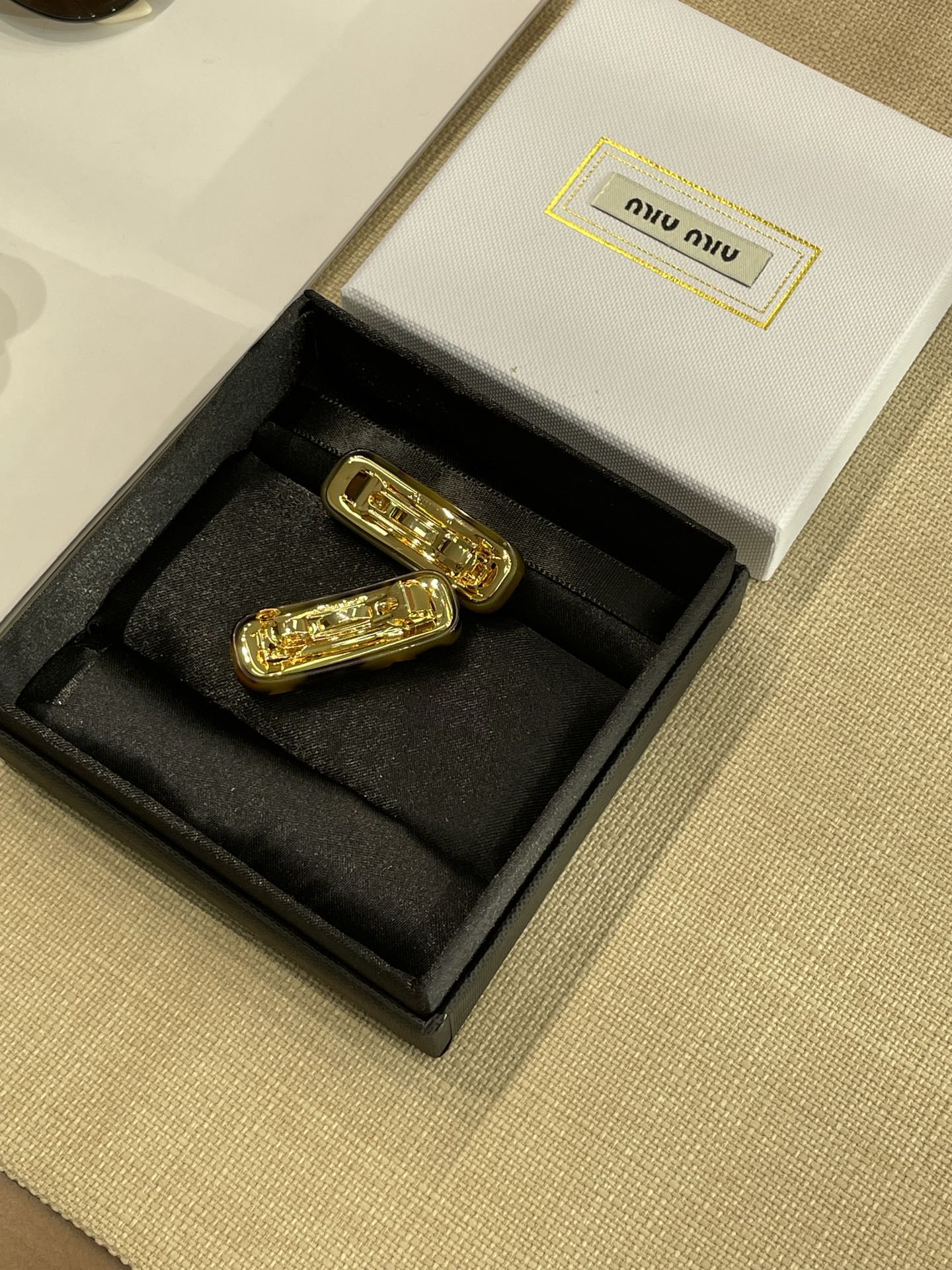 MIU MIU专属标识图案变身此款发夹的主角,弥漫精致魅力。仿水晶点缀混合材质打造的别致设计,唤起一抹优雅风情。