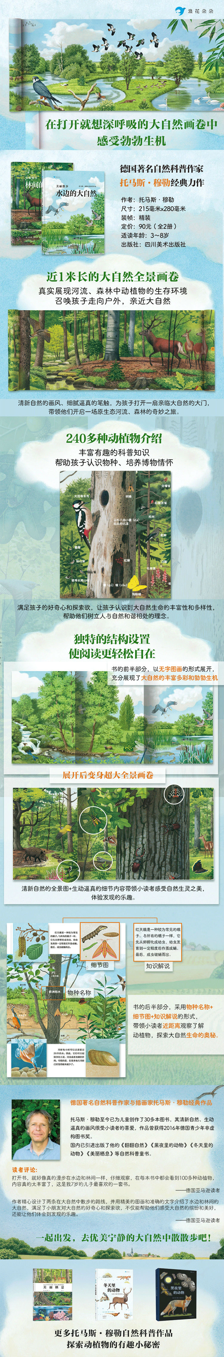 本系列是德国著名自然科普作家和插画家托马斯 穆勒的科普绘本。书中主要描绘了在水边和森林中栖息繁衍的200多种动植物。书的前半部分采用跨页的形式全景展示了水边和林间的自然画卷,这些精美逼真、丰富多彩的自然画面能让小读者自己去发现种类繁多的有趣生灵,直接感受到大自然的缤纷和美好;书的后半部分采用图文结合的方式,详细介绍了在此栖息的各种动植物的名称、特点、生活习性等,带领小读者近距离观察这些动植物的生活,从而认识物种,了解有趣的动植物知识。书的最后还附有动植物名称的索引,可以方便小读者对照查阅。对于生活在城市中不能经常接触大自然的小读者来说,本书就像为他们打开了一扇亲临自然的大门,带领他们开启了一场奇妙的自然之旅。