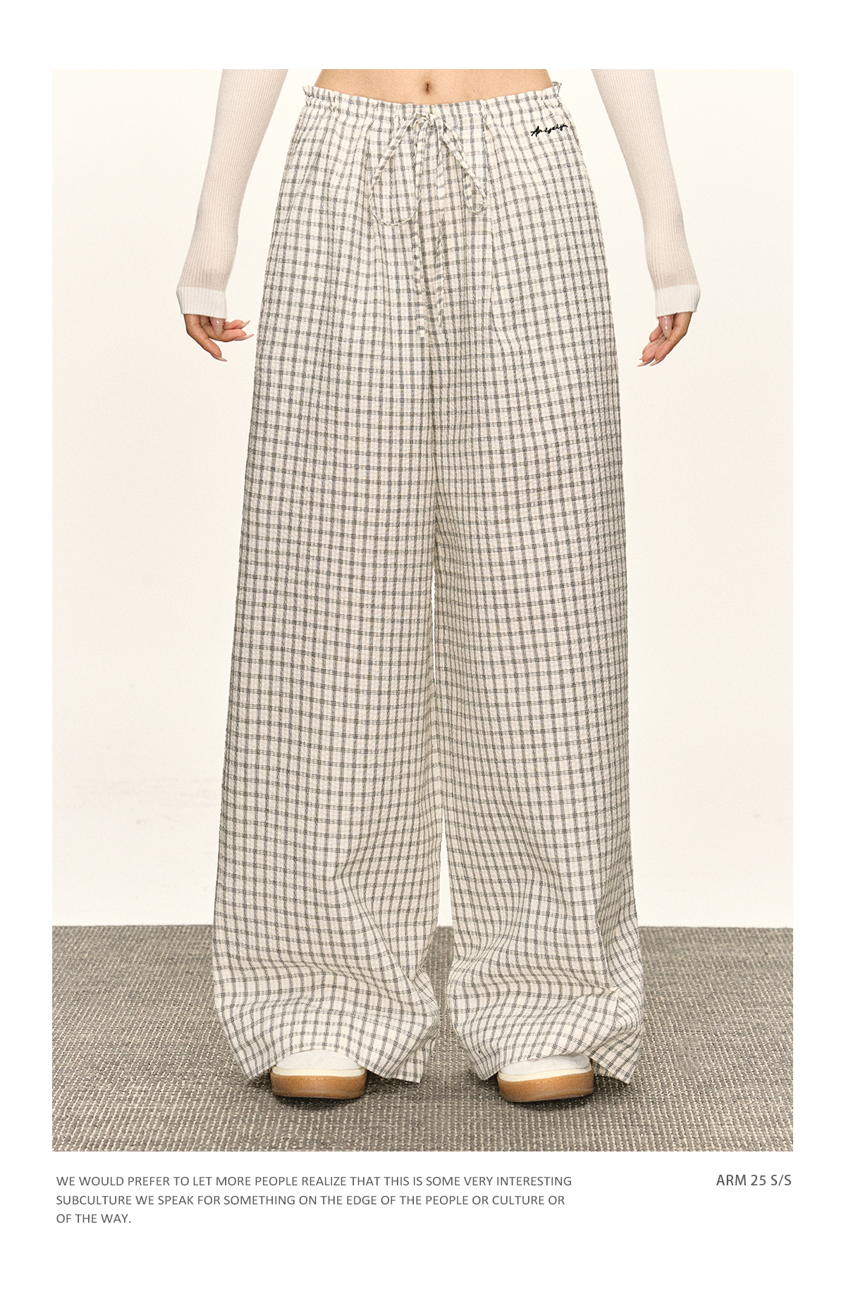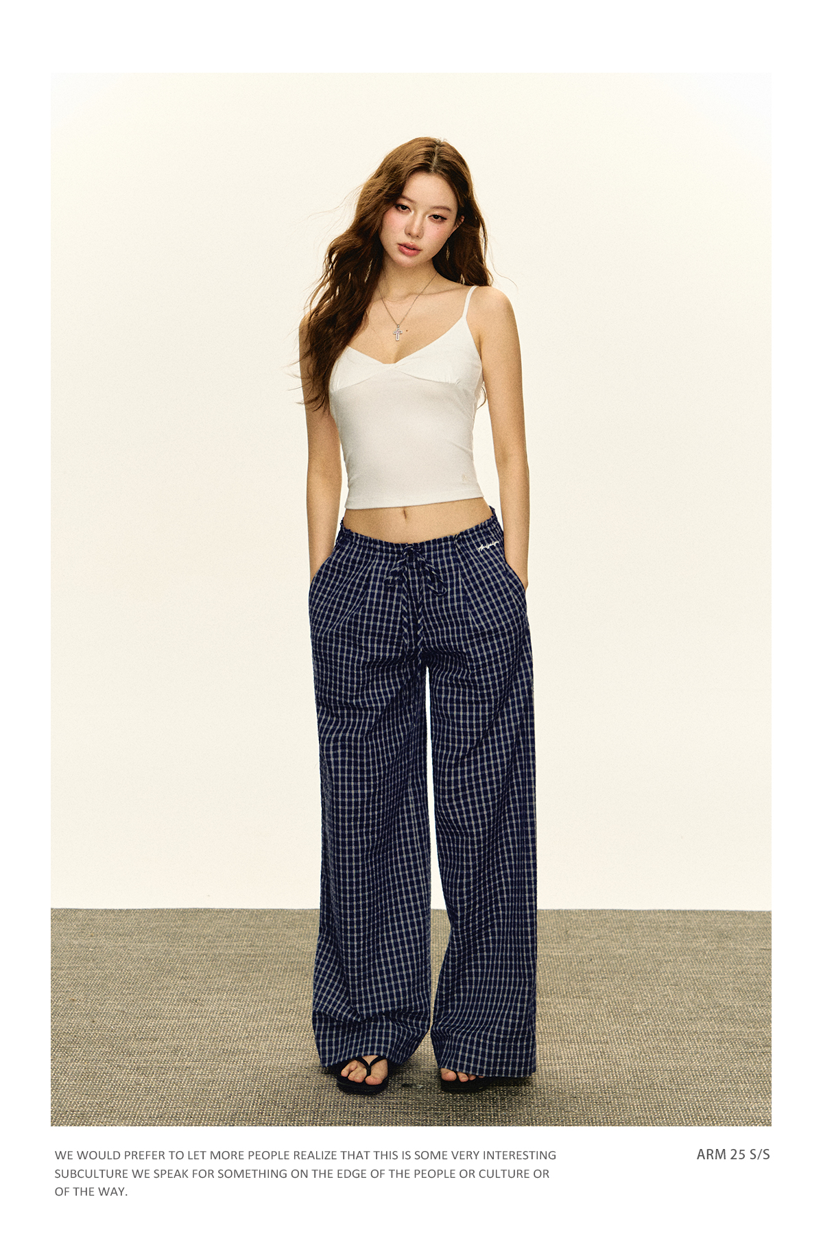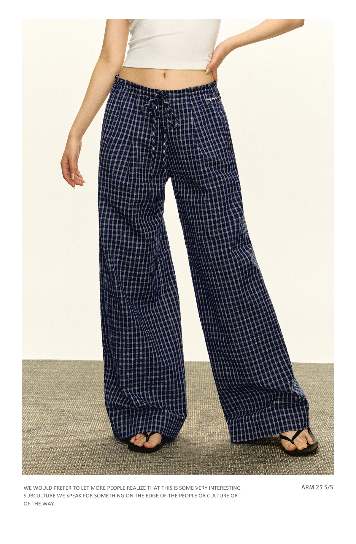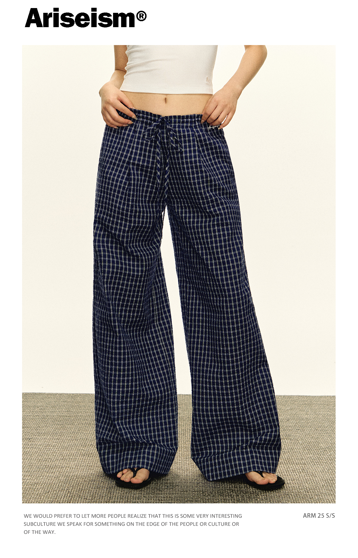 Ariseism美式复古薄款蓝色格子休闲裤女夏季新款低腰宽松阔腿裤子
