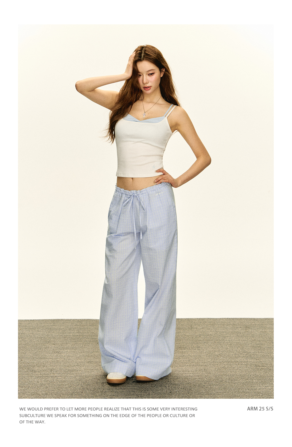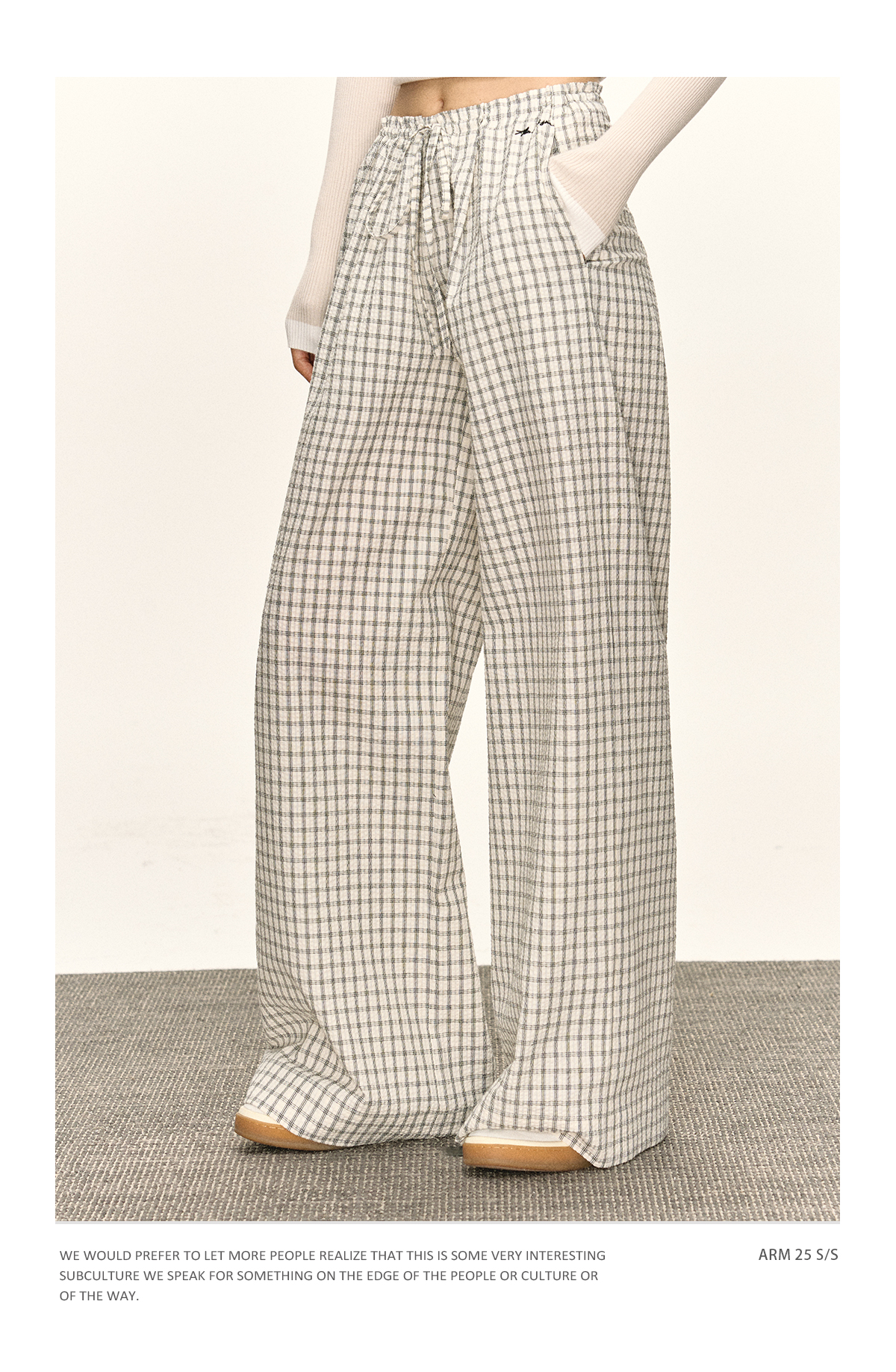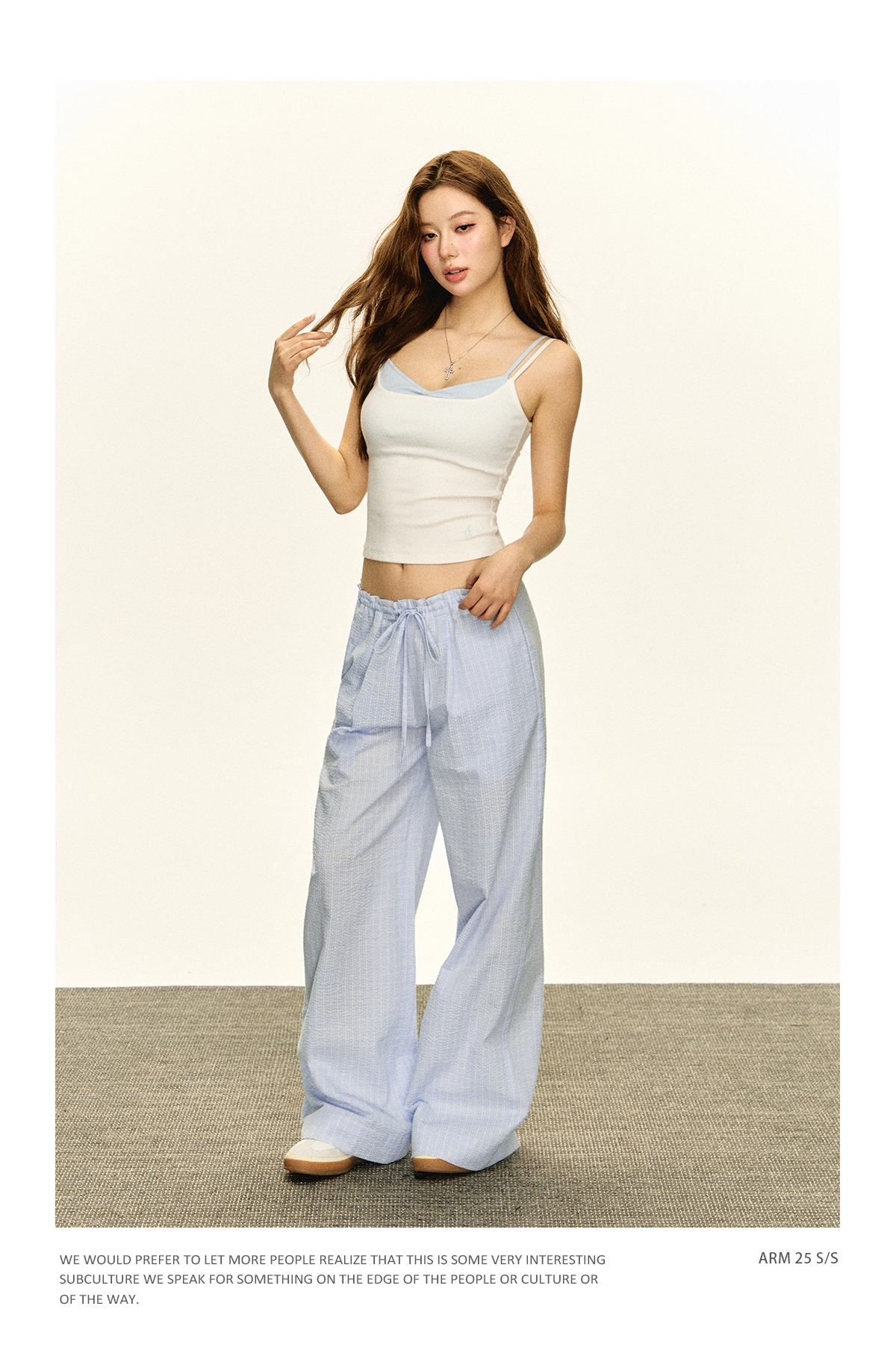 Ariseism美式复古薄款蓝色格子休闲裤女夏季新款低腰宽松阔腿裤子