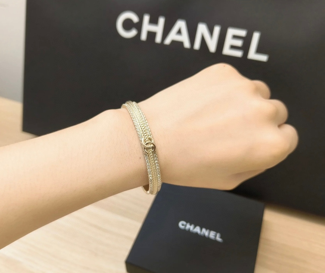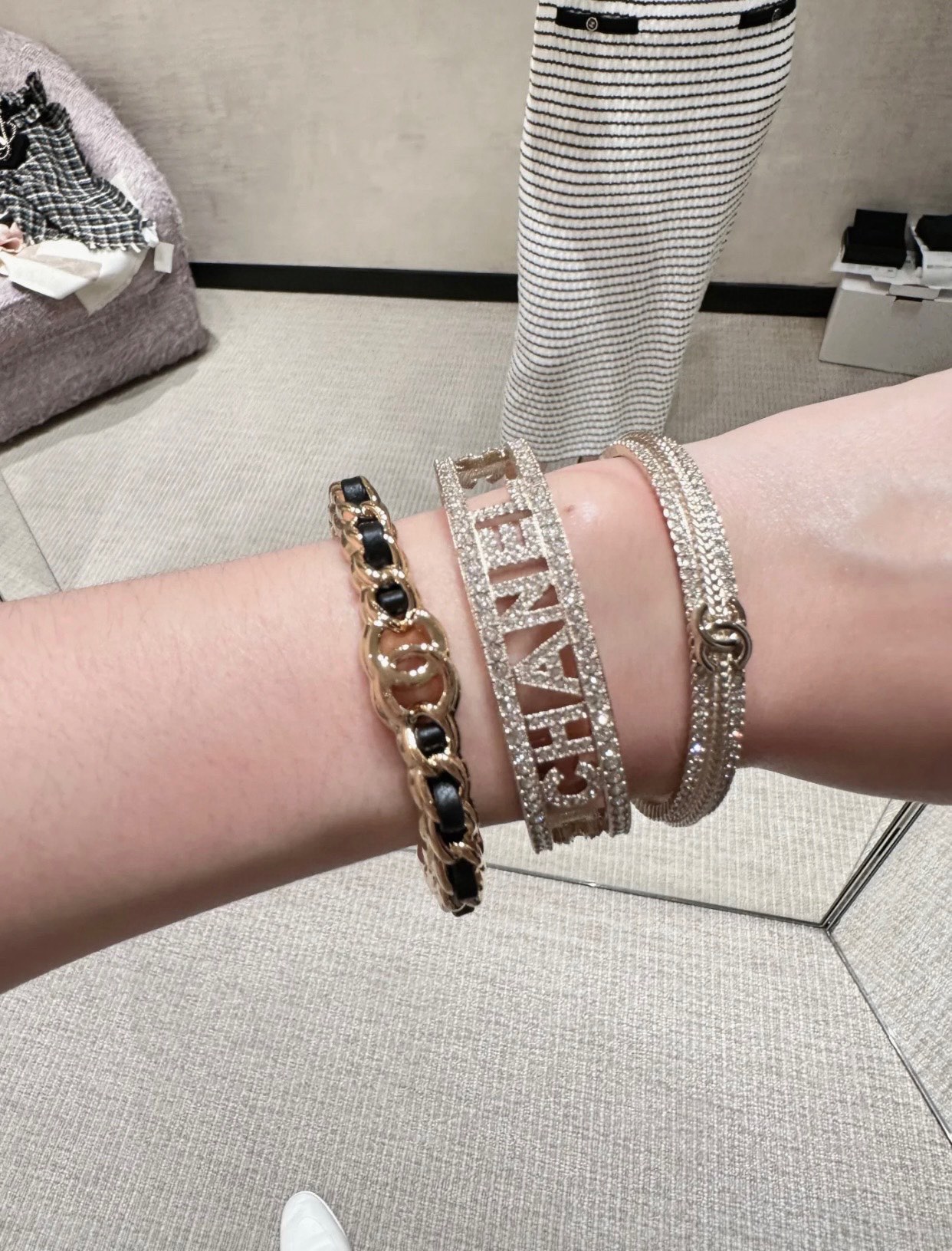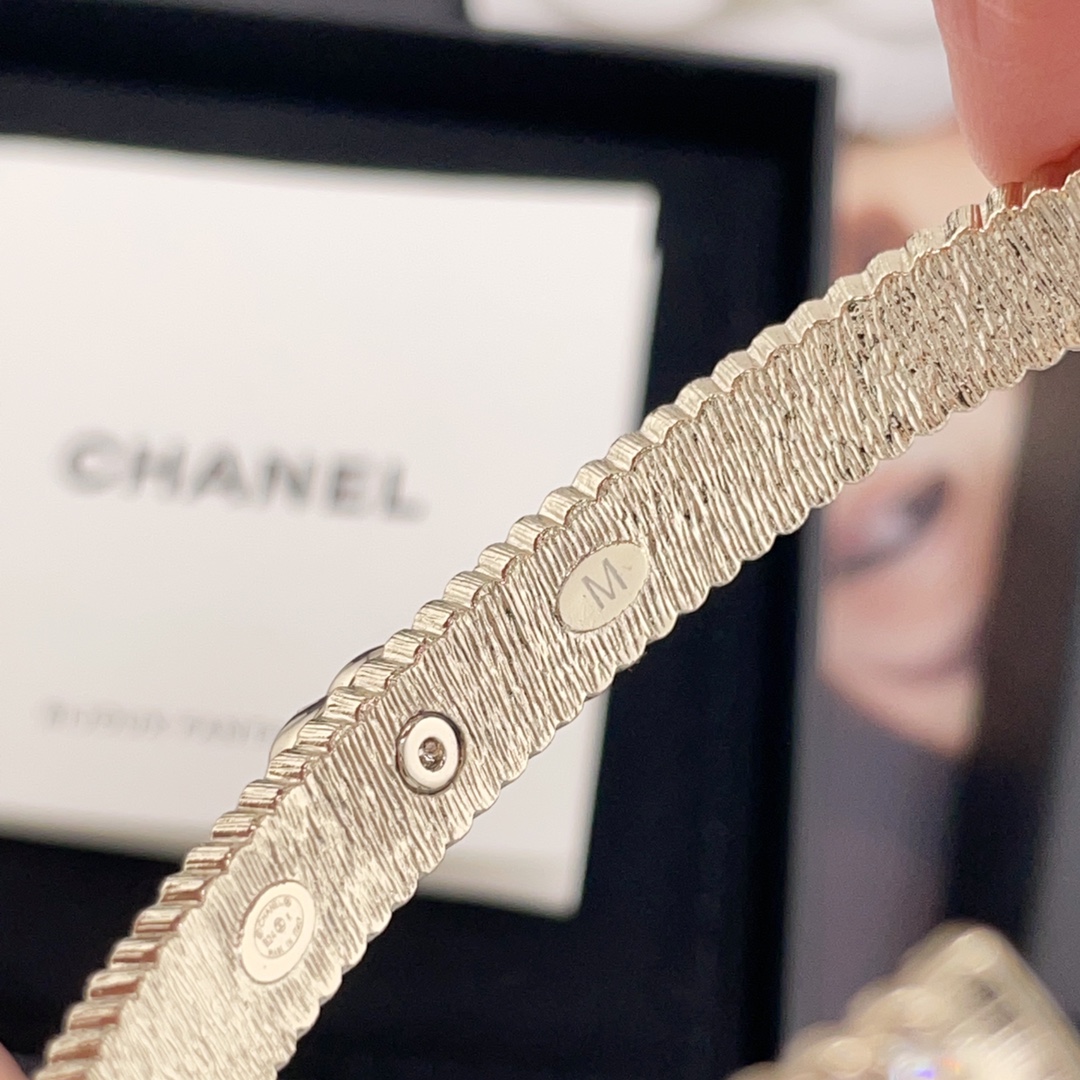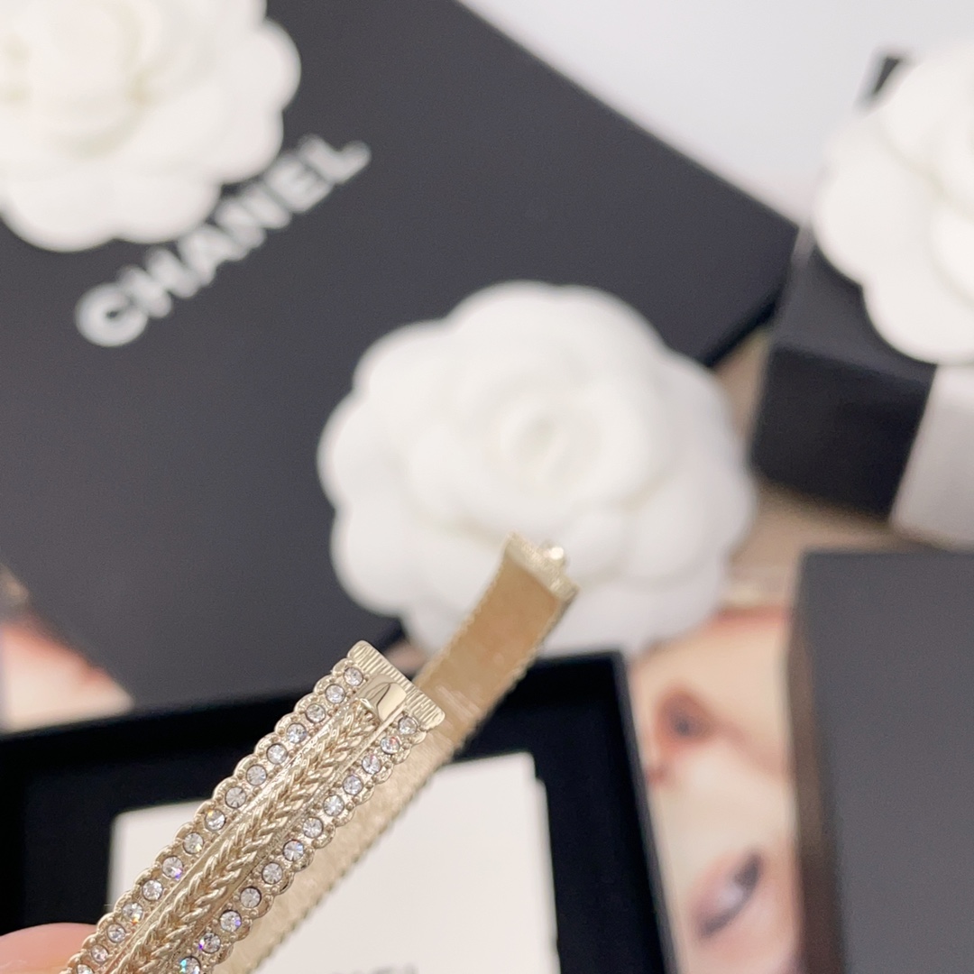 编码241108851,配送包装 简约大方日常款,上边颗颗施华洛世奇水晶,中间立体细腻的链条⛓️纹路+双c logo设计!背面,侧面纯手工拉丝工艺,超级重工精致绝对是低调中带着华丽丽的女神范,无法抗拒!浅金色太高级了!