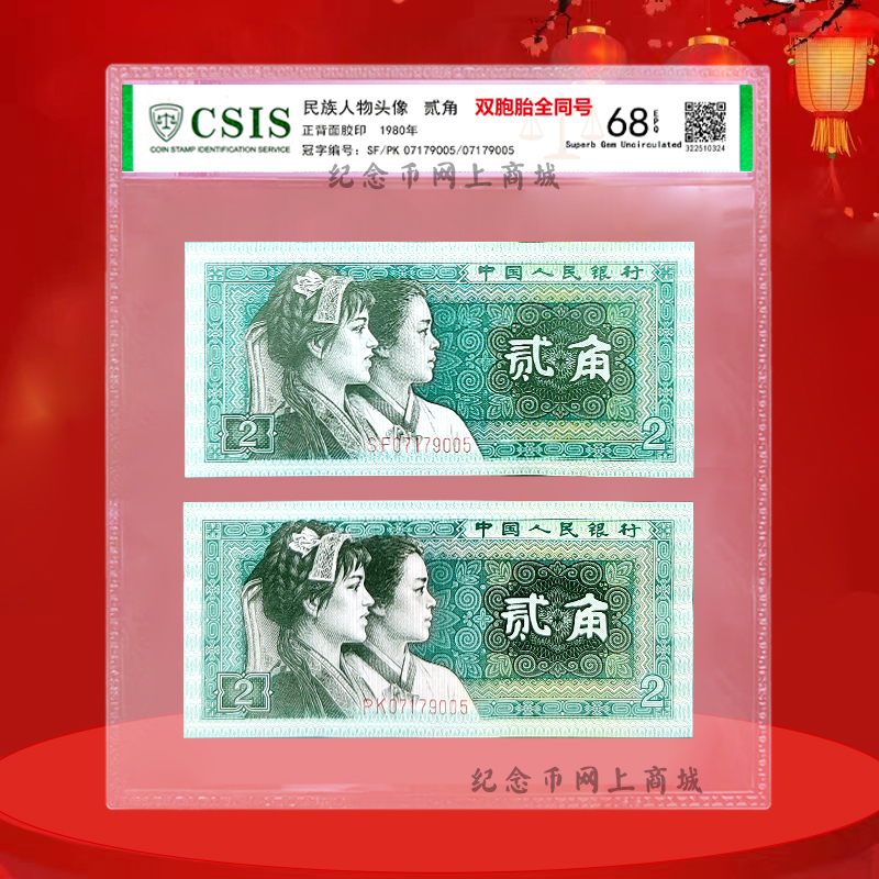 四版80版2角,2张纸币号码全部相同,双胞胎全同号