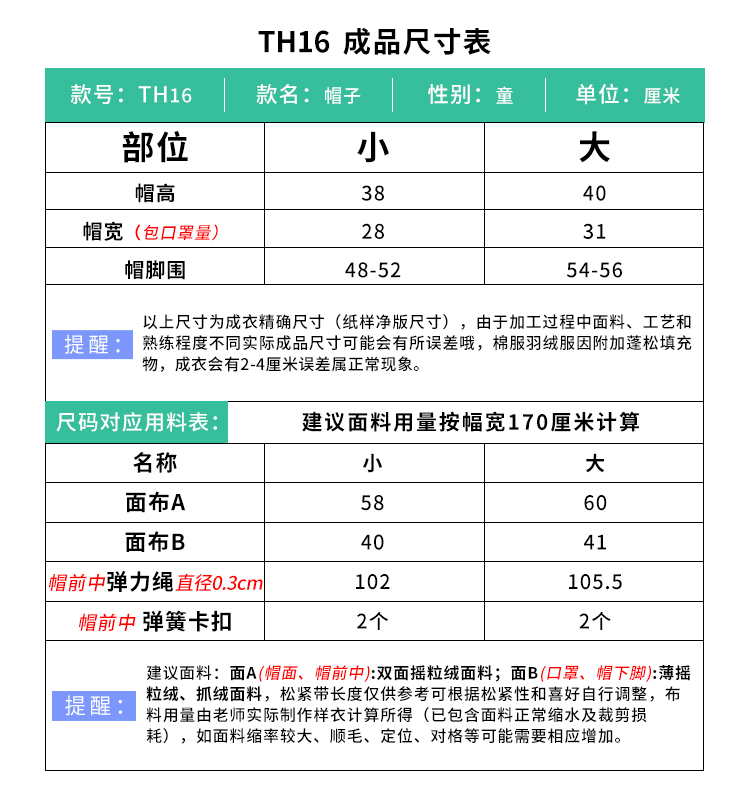 裁缝学苑TH16儿童冬季防风帽纸样帽子围巾一体绒护耳帽保暖帽打版裁剪图
