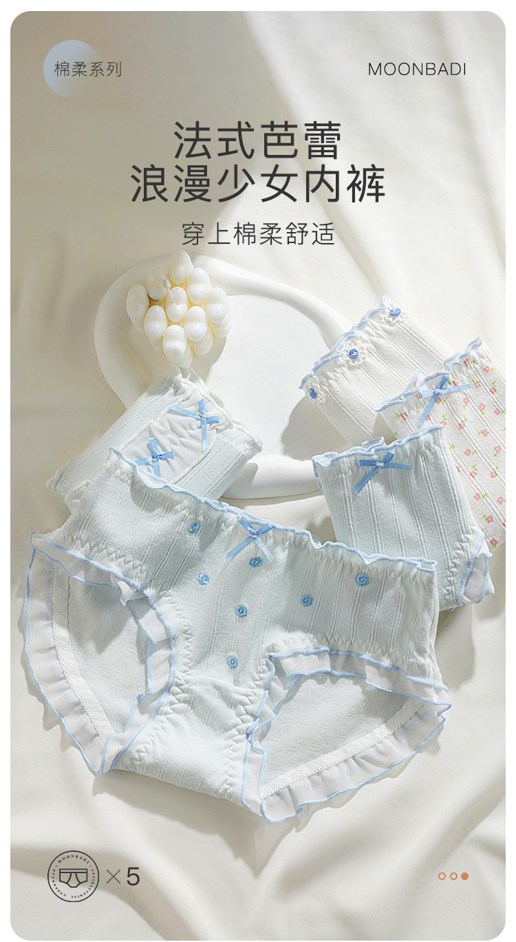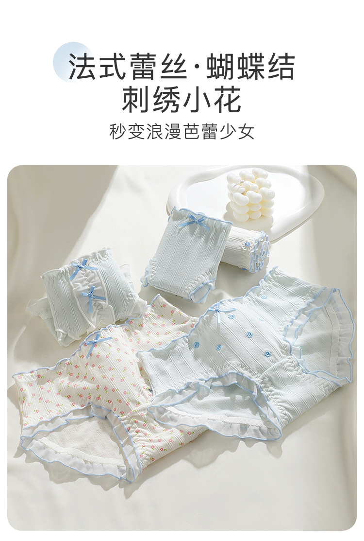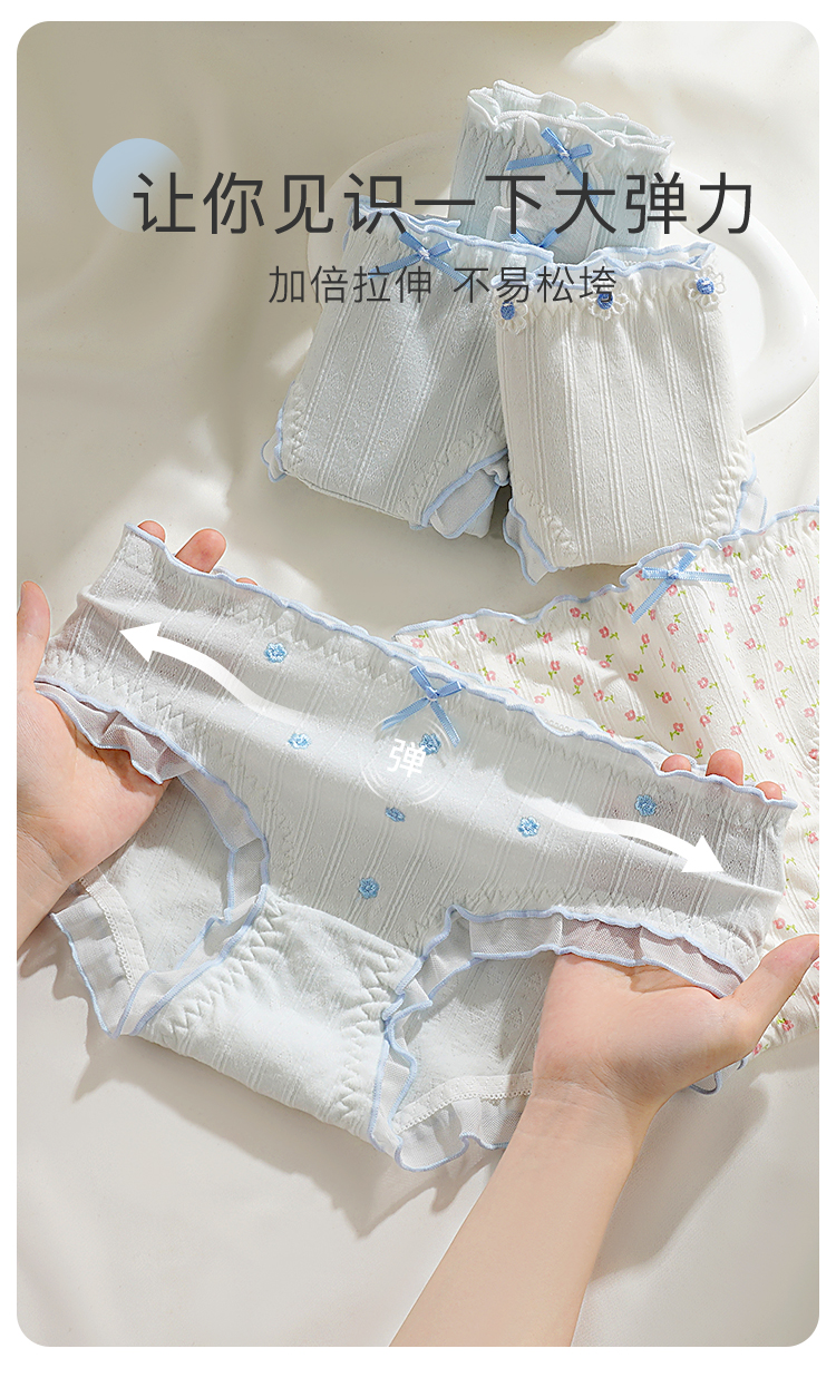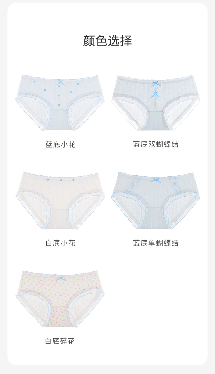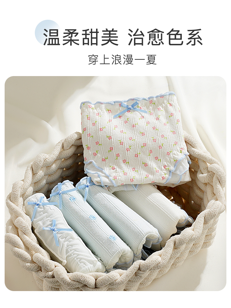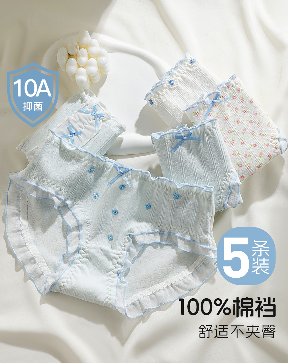 【10A级抑菌】5条装女士内裤舒适透气甜美蕾丝三角裤全棉裆D5611小花蓝调内裤
