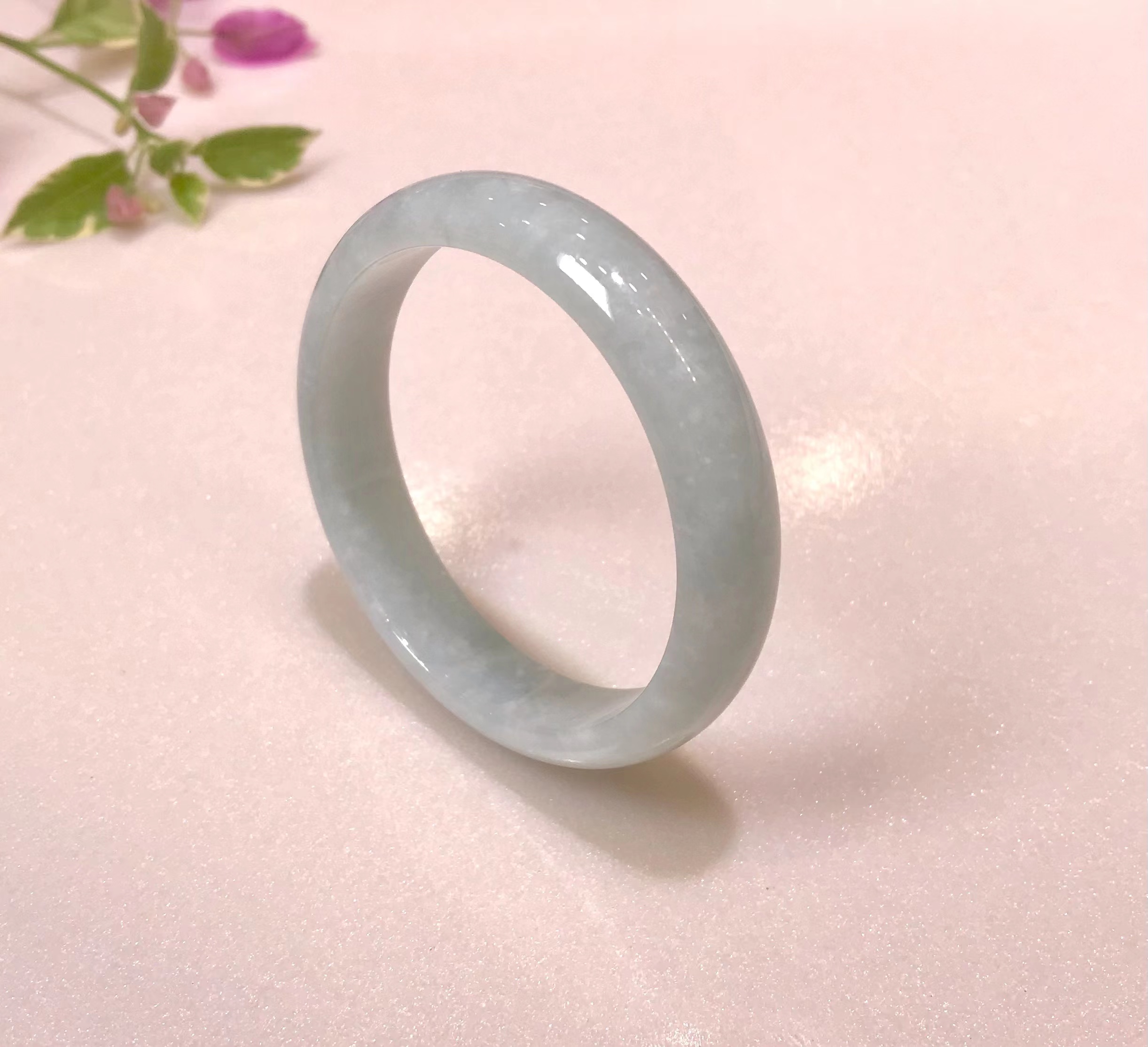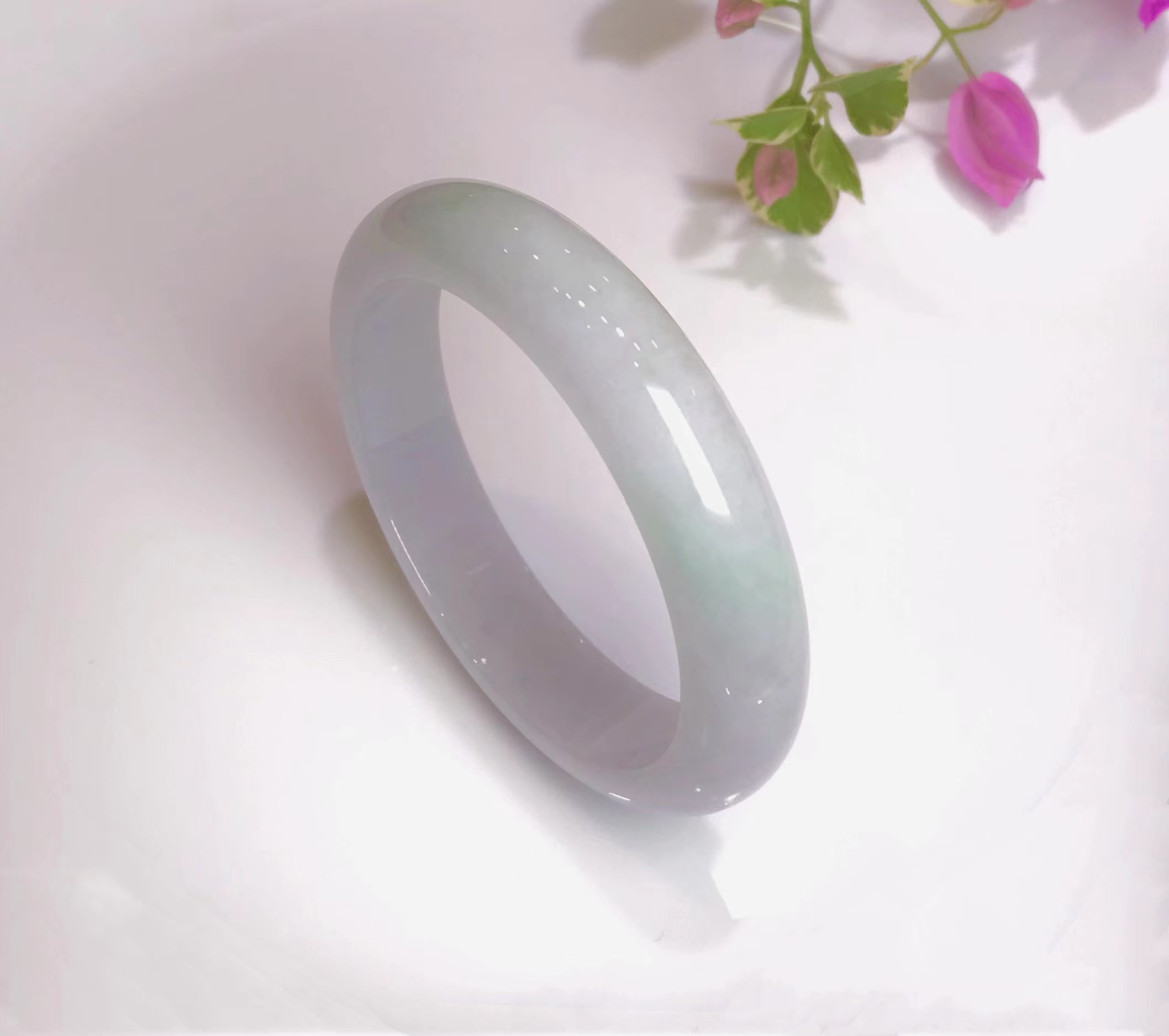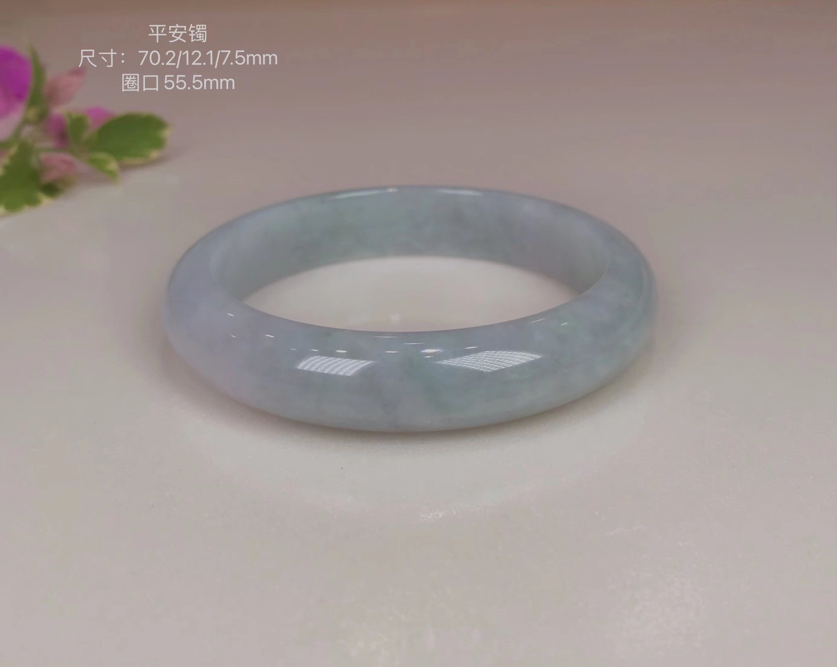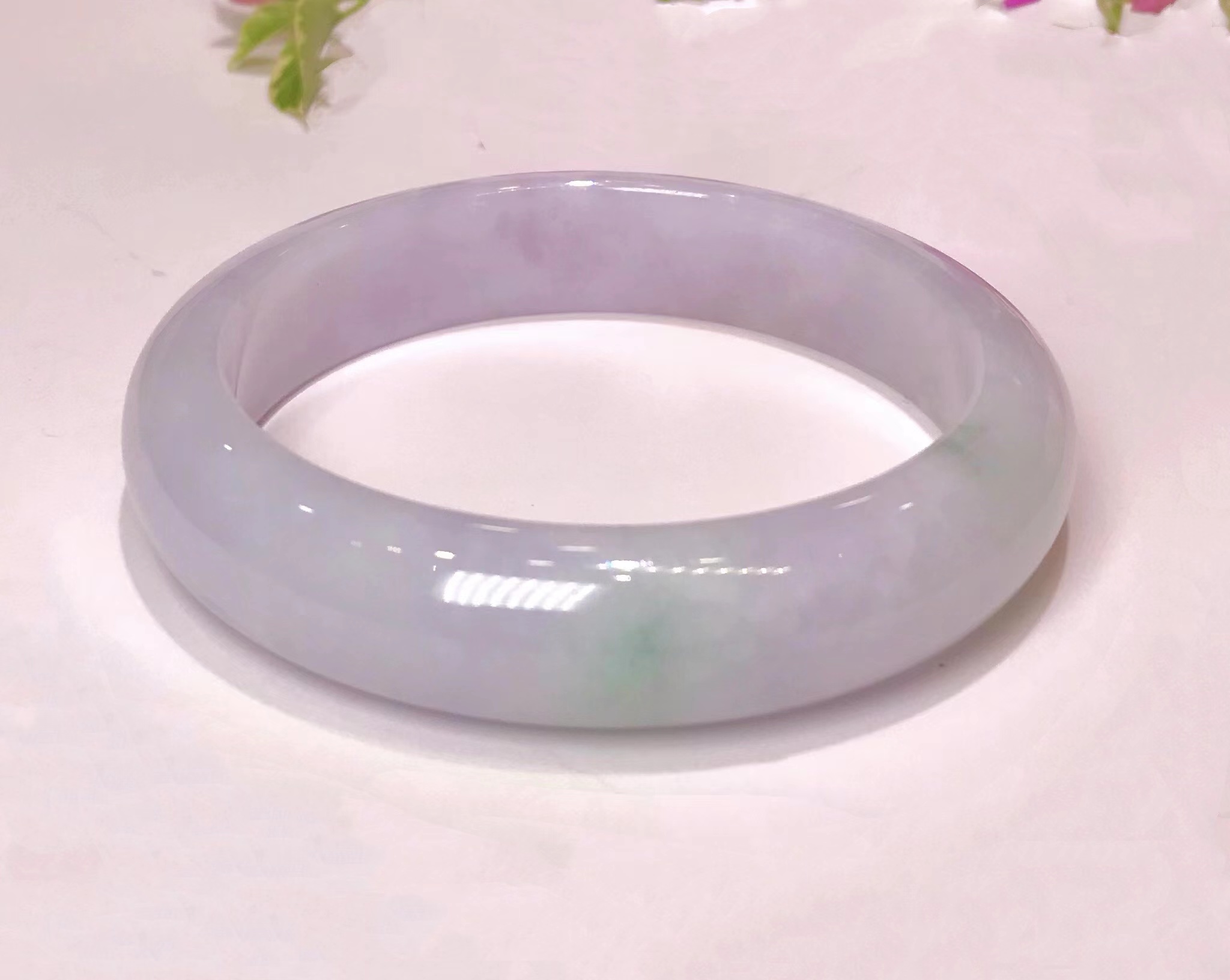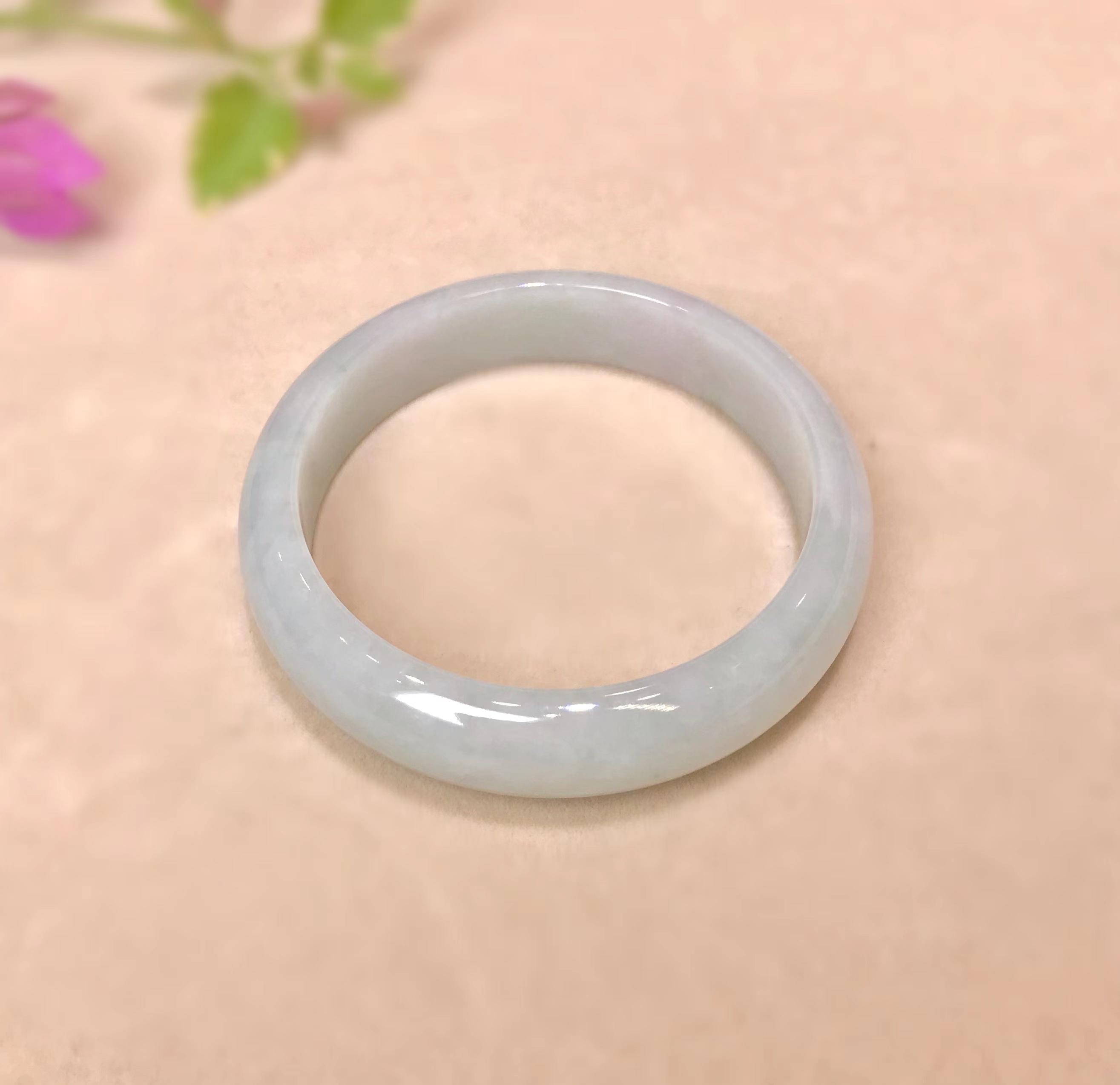 冰豆种浅色翡翠平安镯,水润干净,飘淡紫,尤其飘紫色的部位非常细腻。