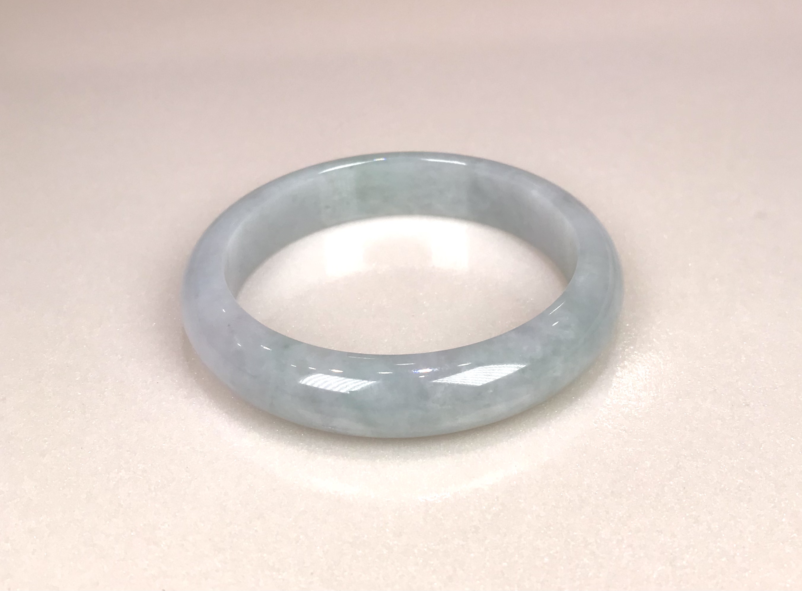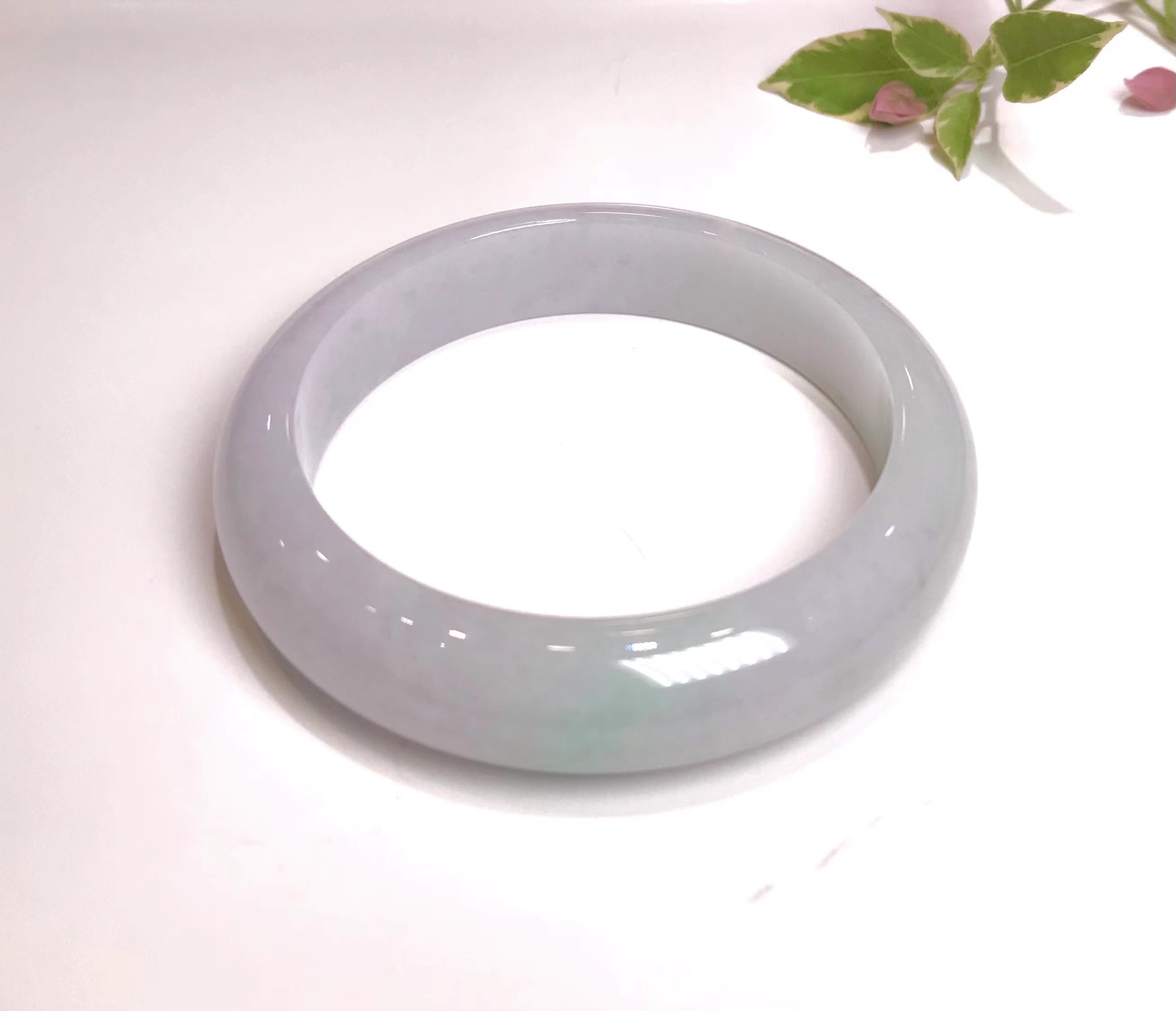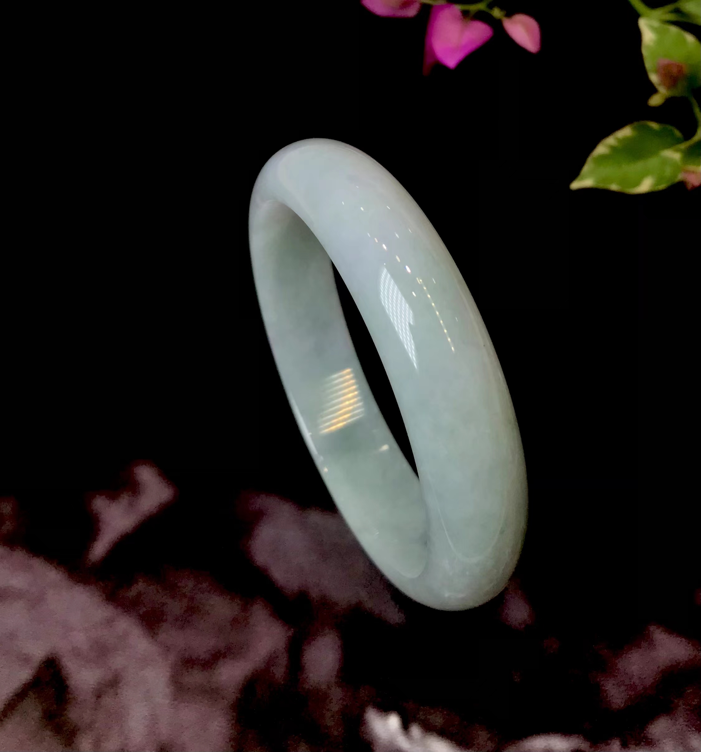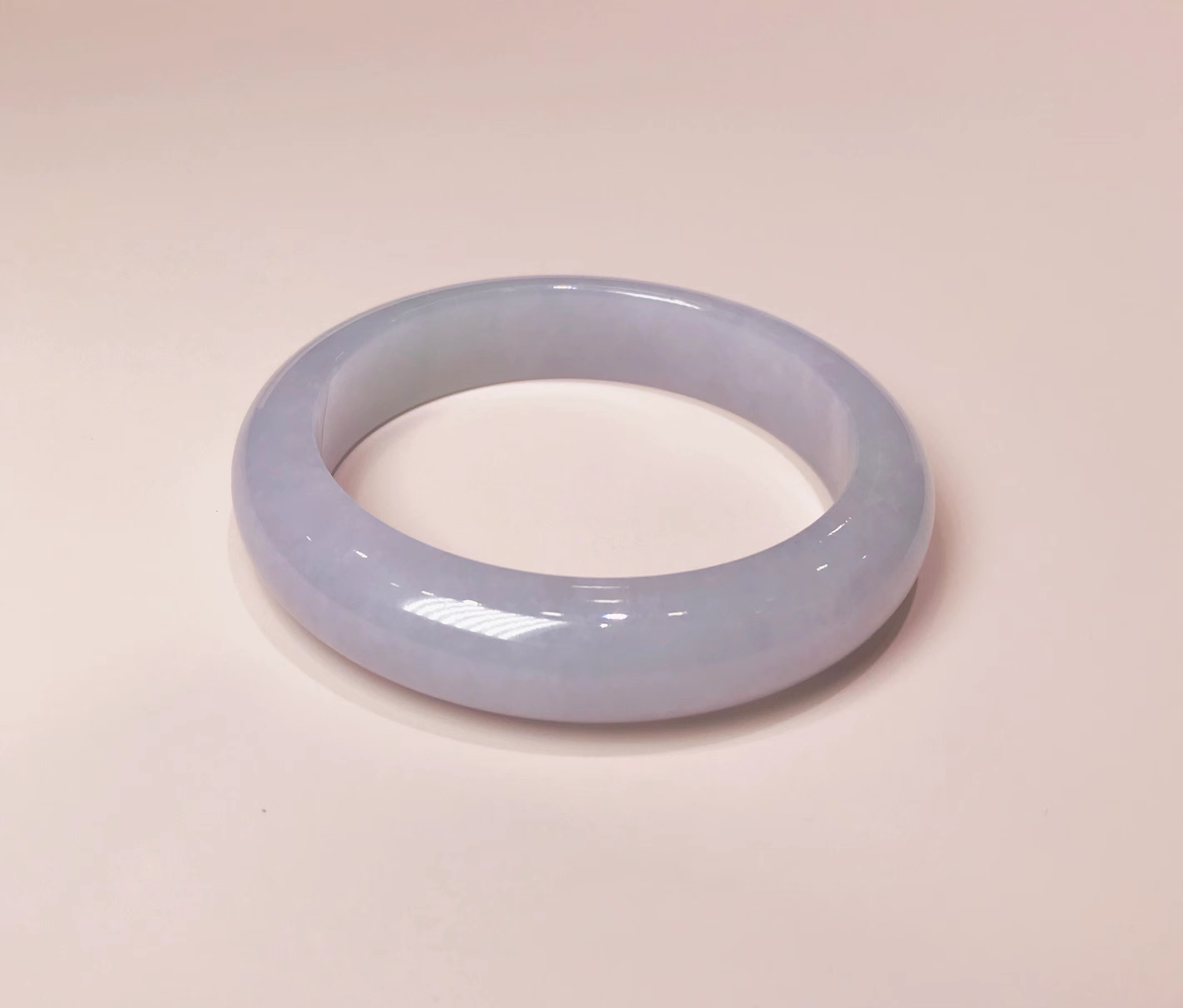 冰豆种浅色翡翠平安镯,水润干净,飘淡紫,尤其飘紫色的部位非常细腻。