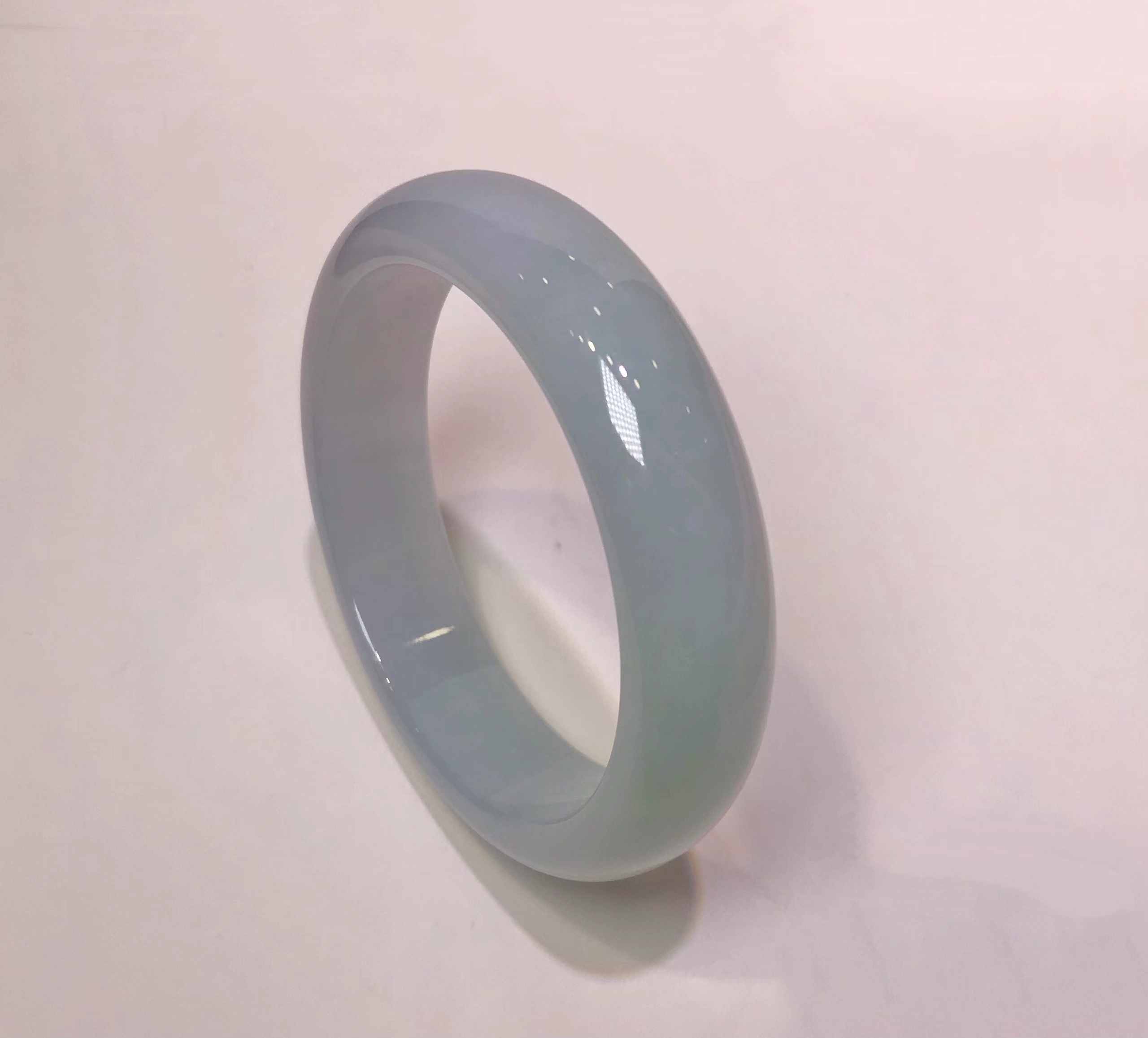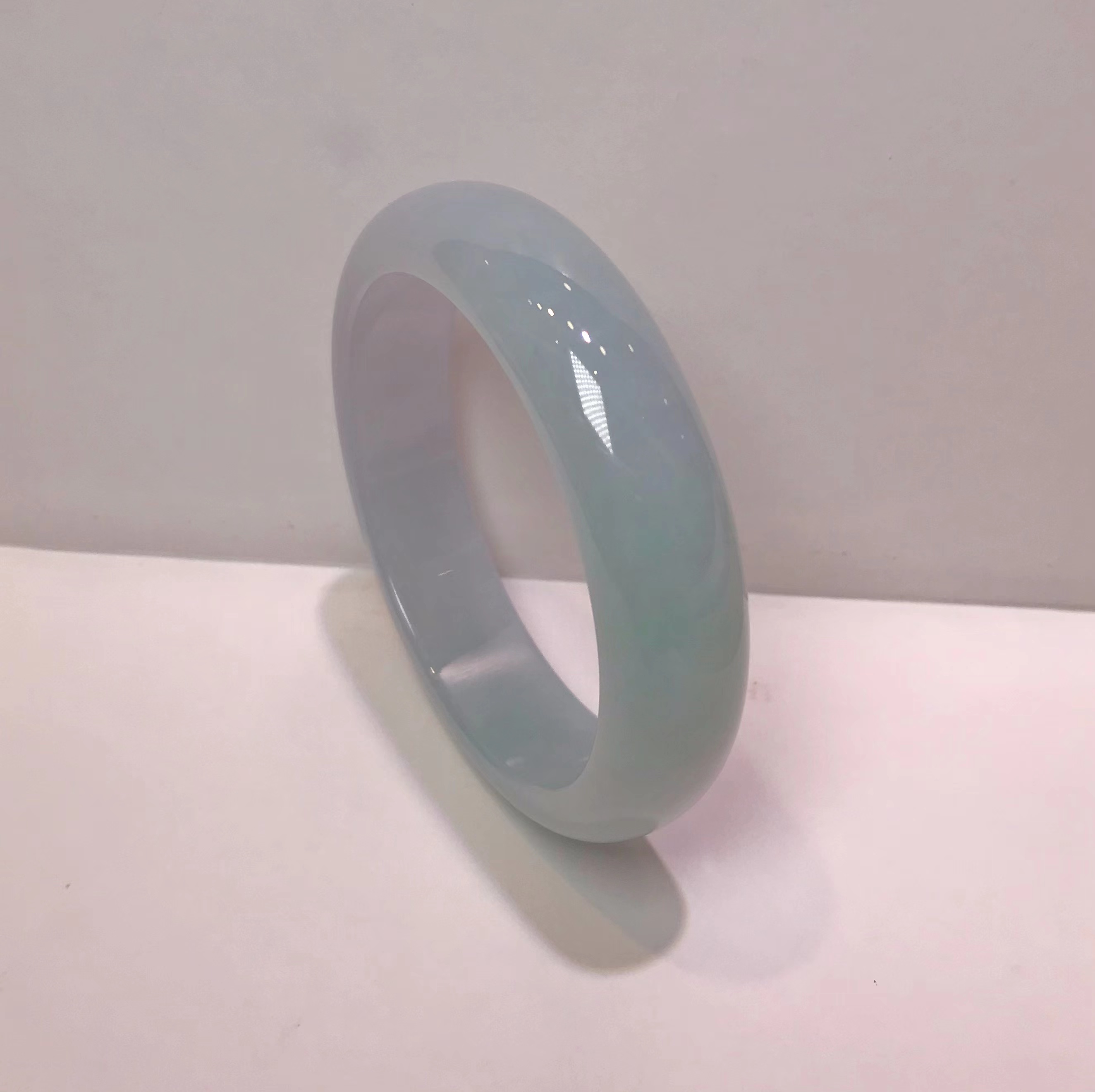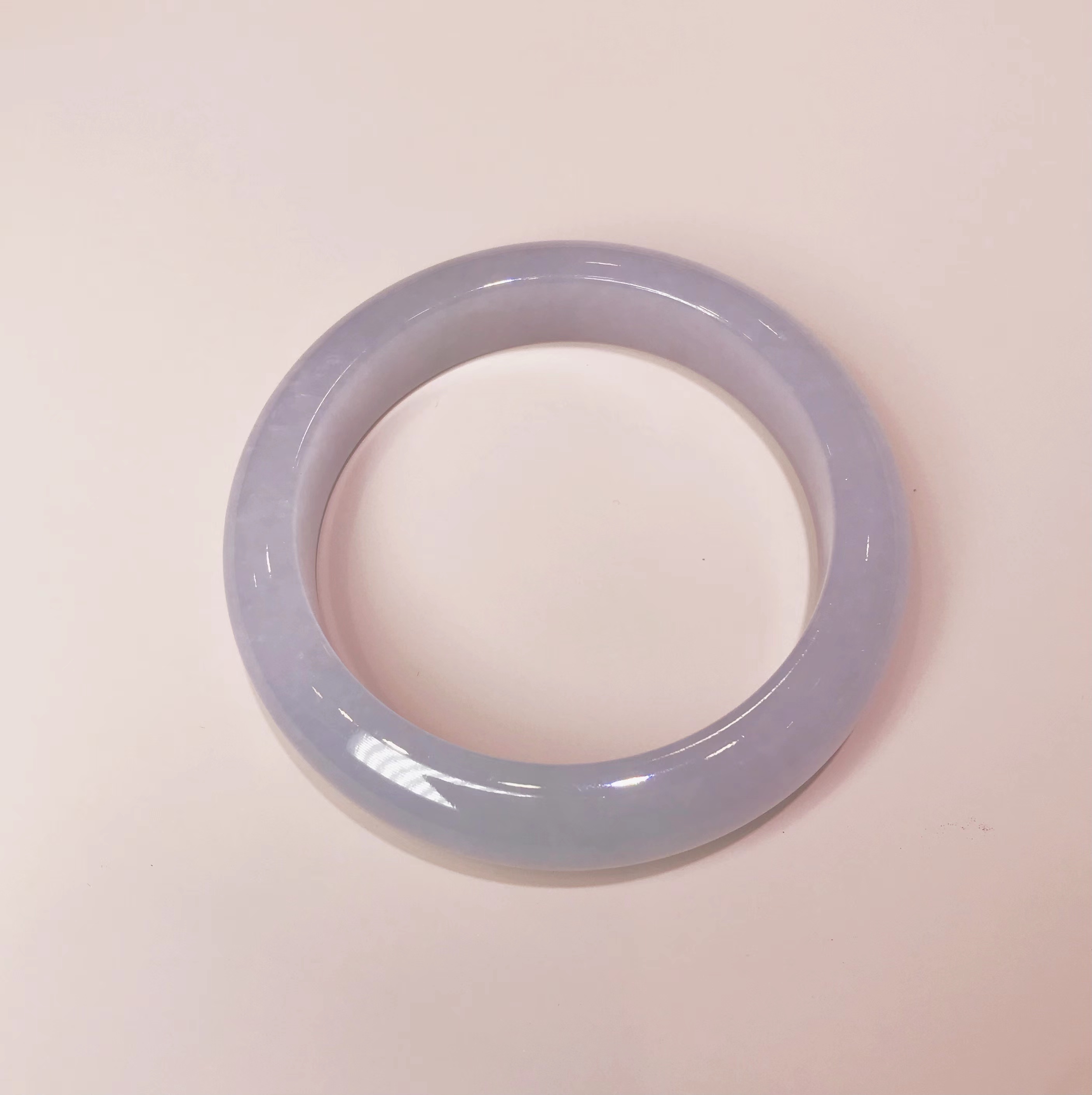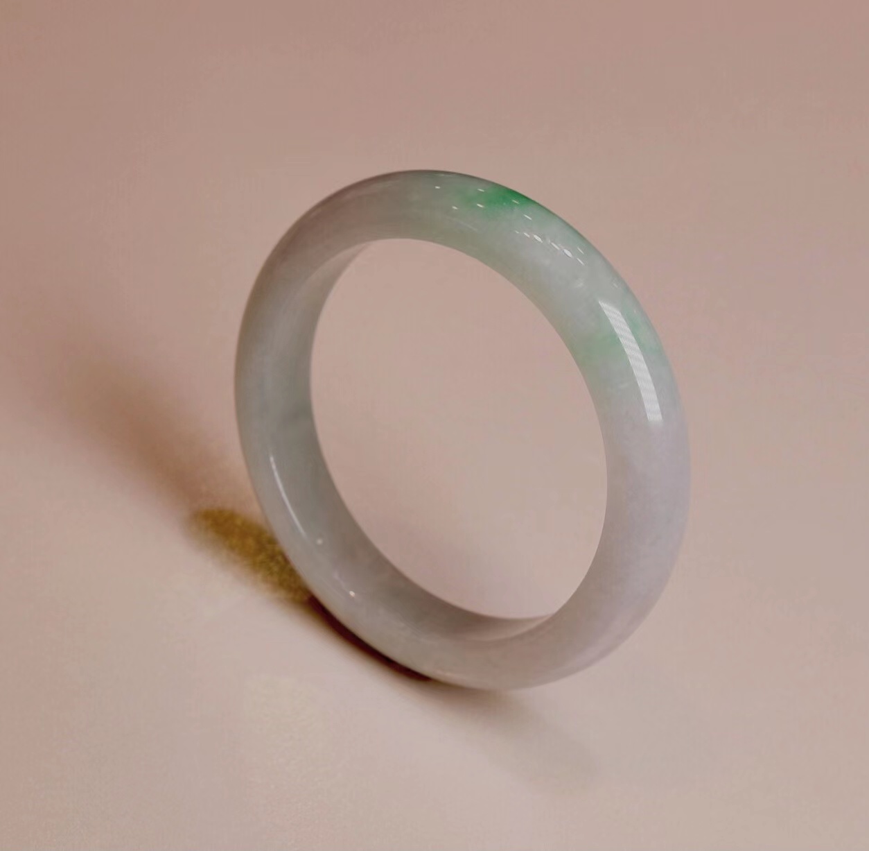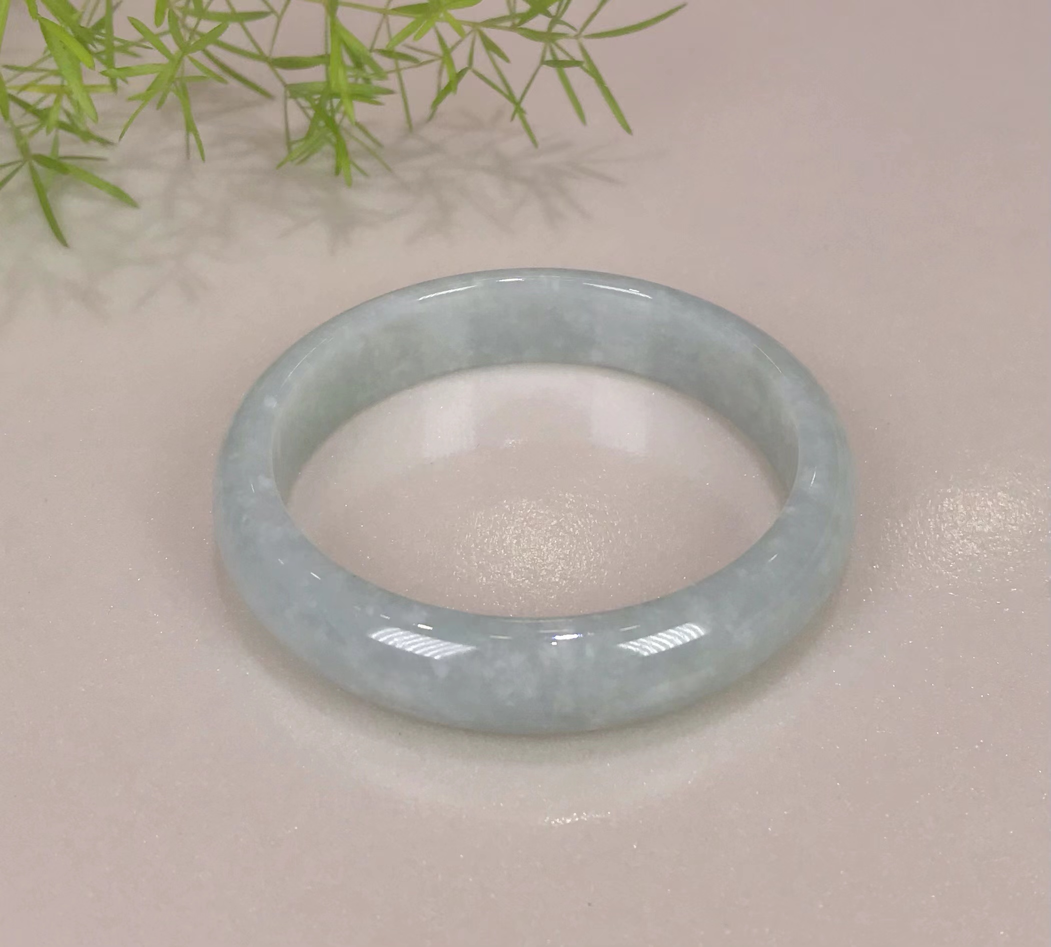 冰豆种浅色翡翠平安镯,水润干净,飘淡紫,尤其飘紫色的部位非常细腻。